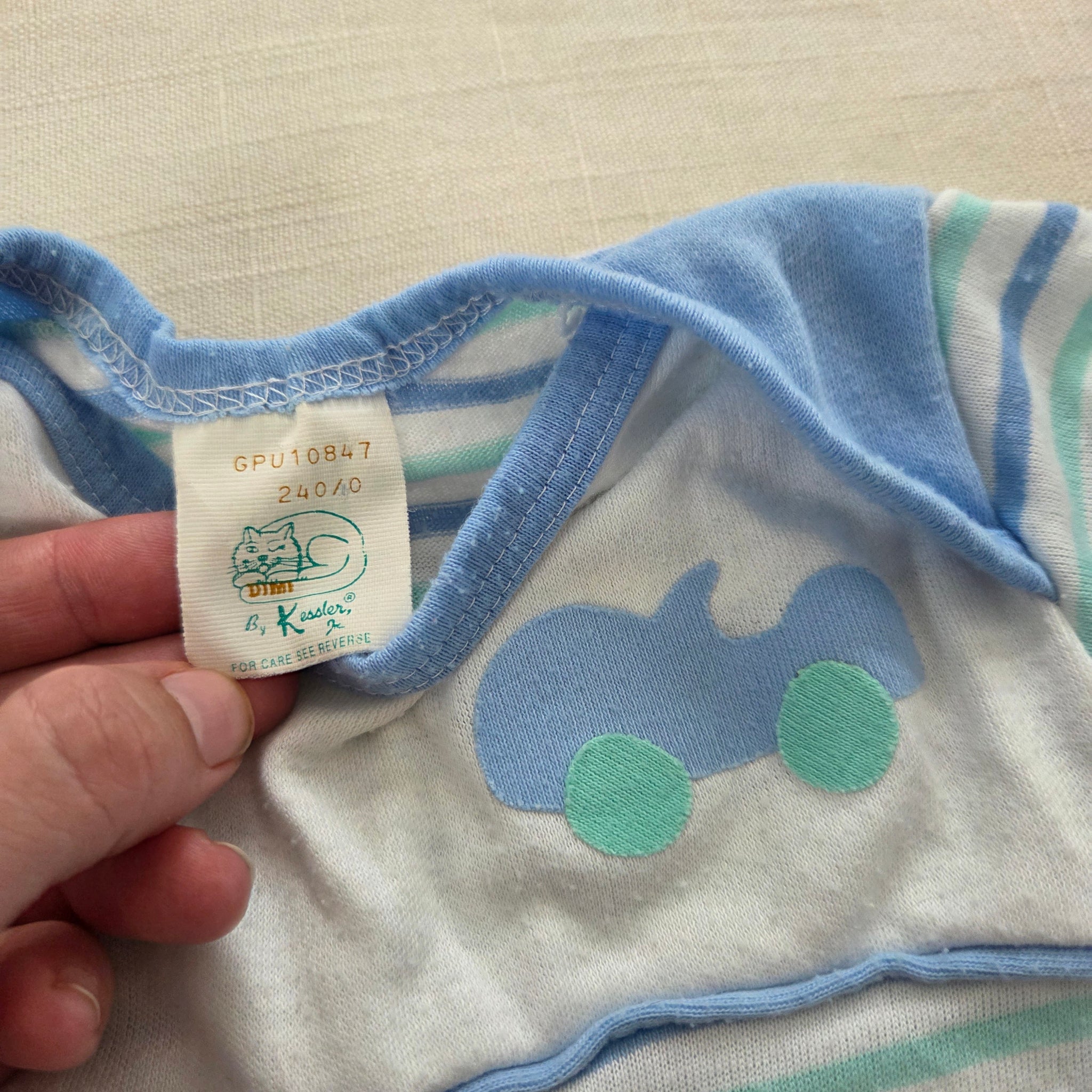 Vintage Kessler brand blue striped pantsuit with car on chest! Please see all photos for condition and measurements