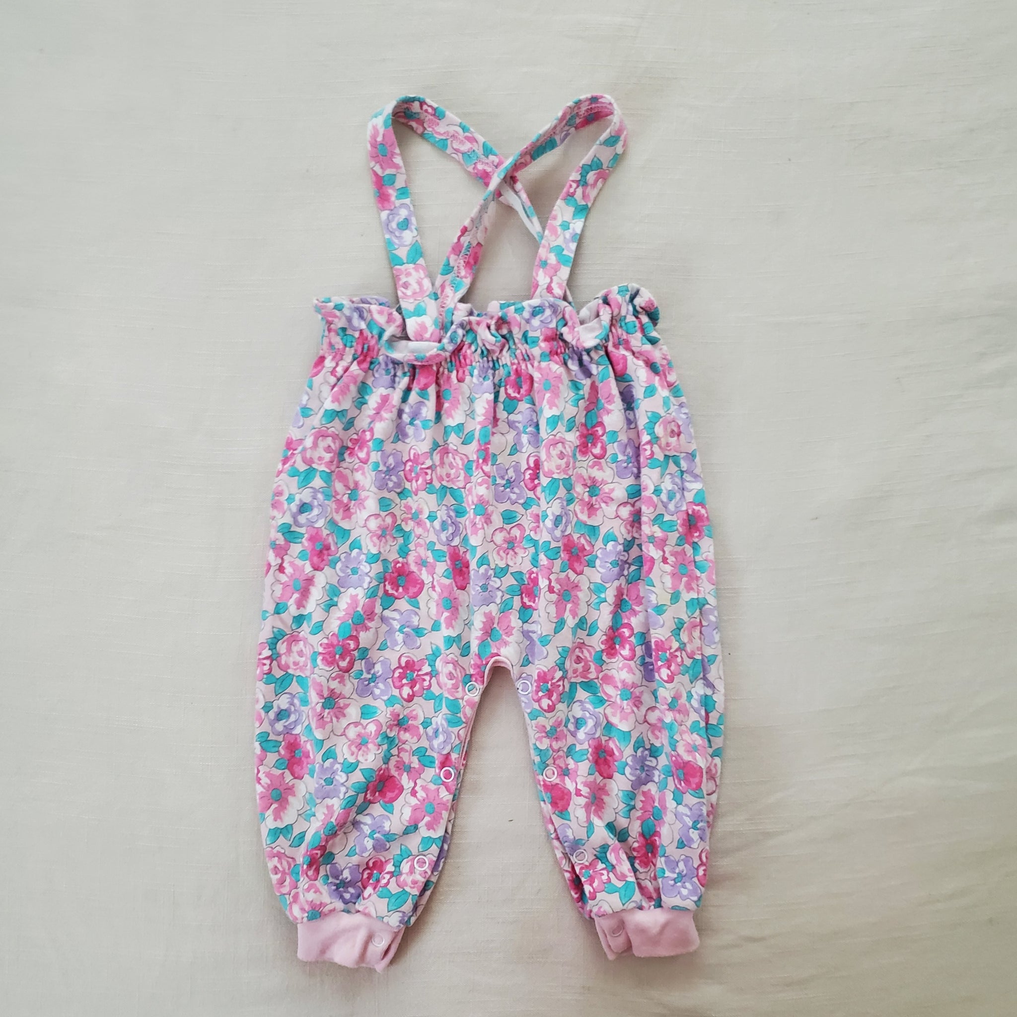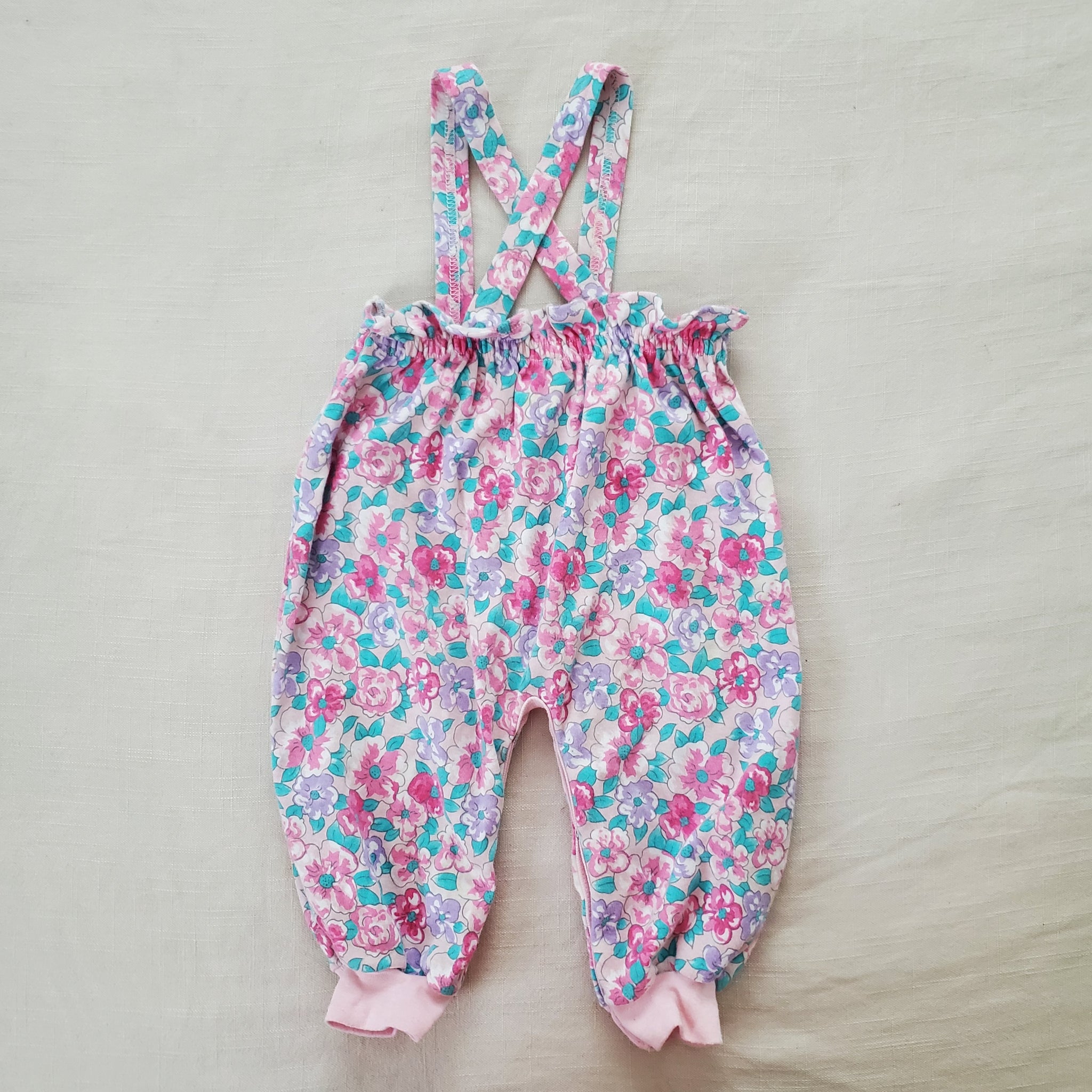 Vintage pink and purple floral suspender pants with stretchy elastic high waist! Please see all photos for condition and measurements