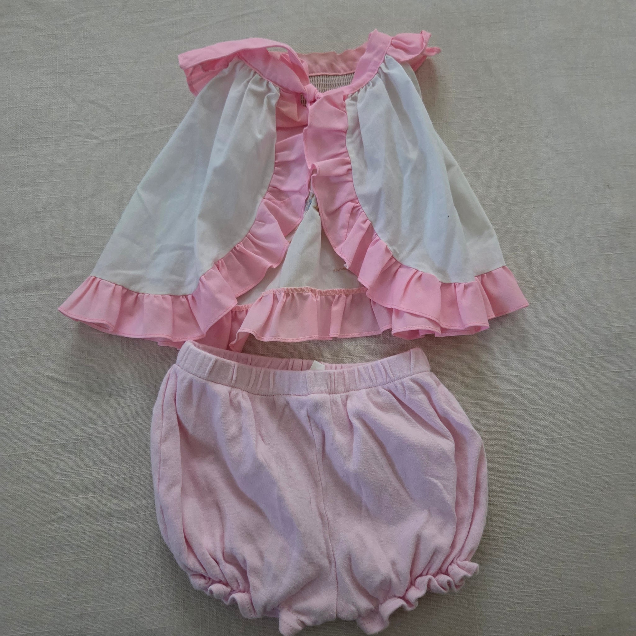 Vintage bundle of shirt with bunny catching butterflies applique and pink bloomers! Note a faint spot on chest of shirt. Please see all photos for condition and measurements