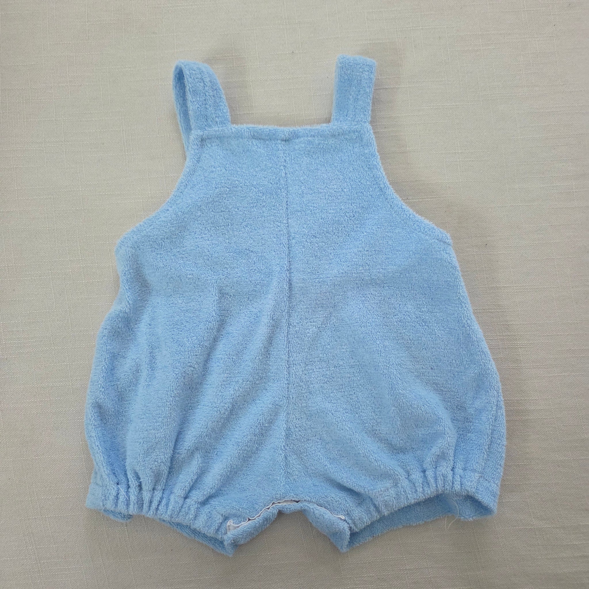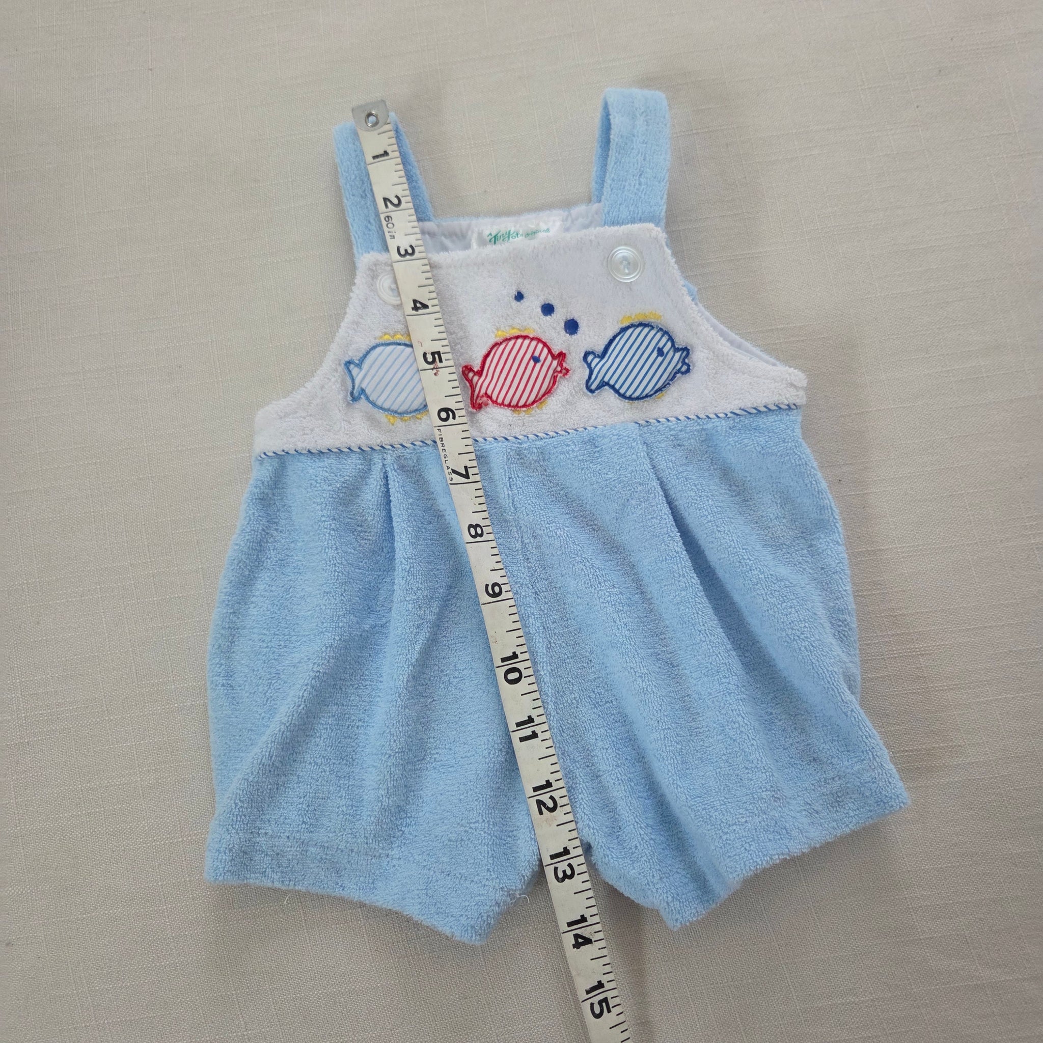 Vintage Tiny Tots blue terrycloth bubble romper with fish embroidery on chest! Please see all photos for condition and measurements