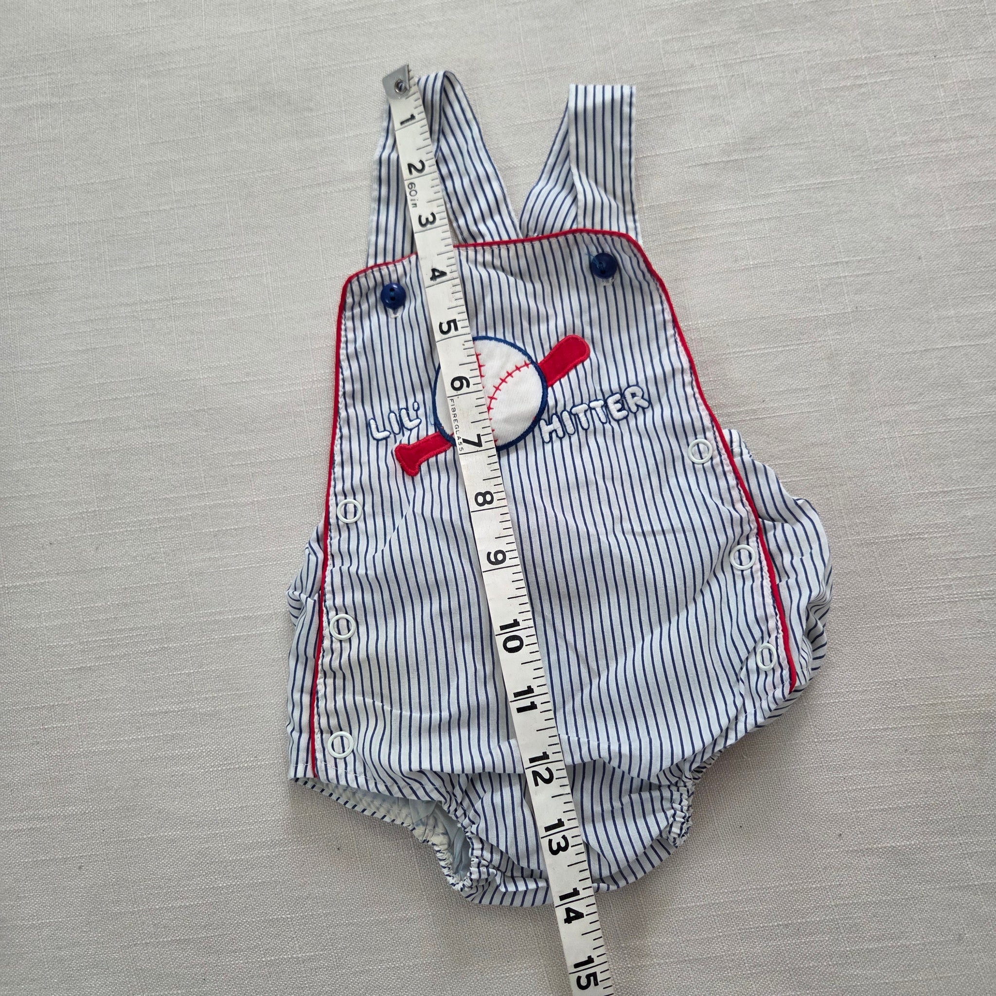 Vintage white and navy blue thin striped sunsuit with "Lil hitter" baseball detail on chest! Please see all photos for condition and measurements