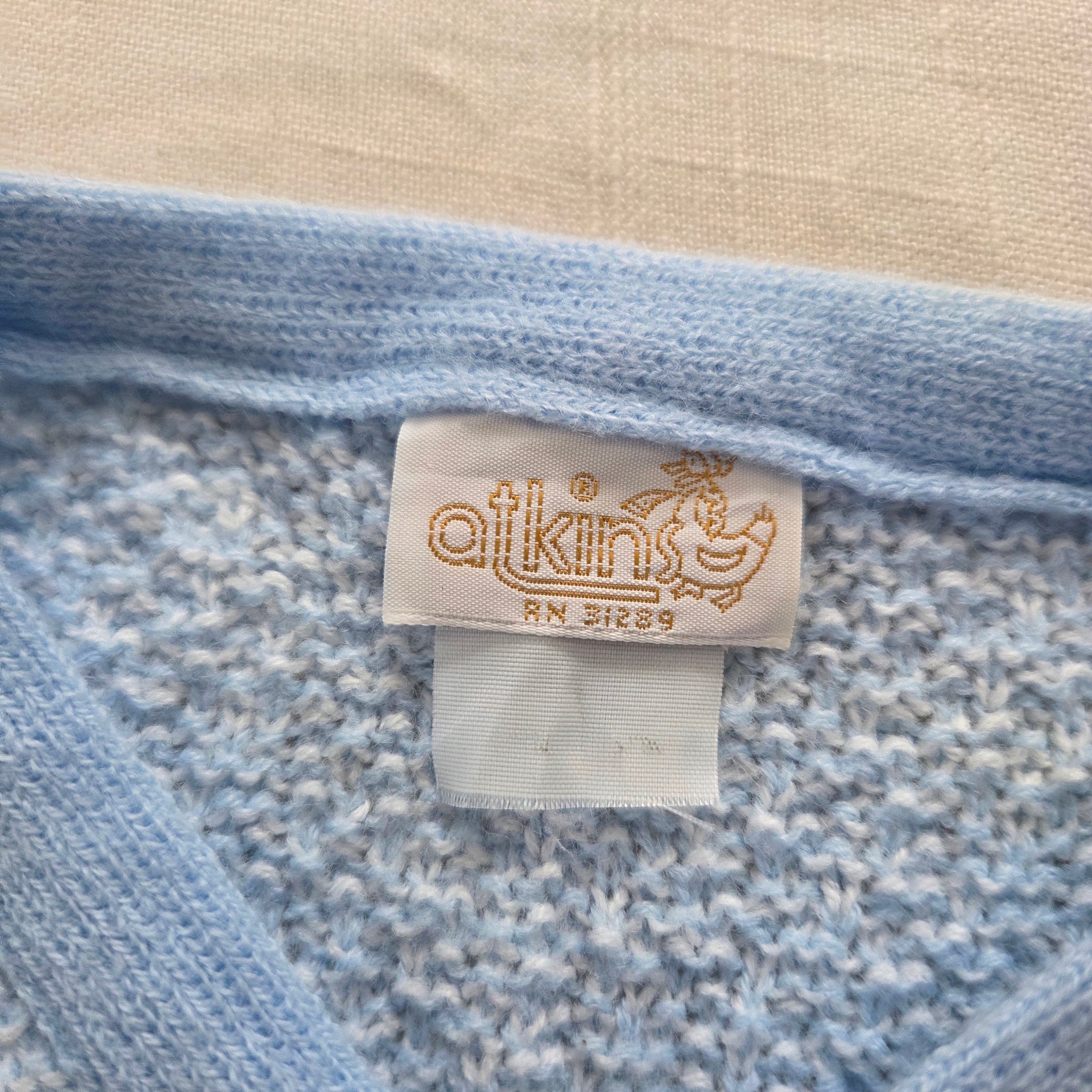 Vintage Atkin brand blue cardigan sweater with sailboats on chest! Please see all photos for condition and measurements