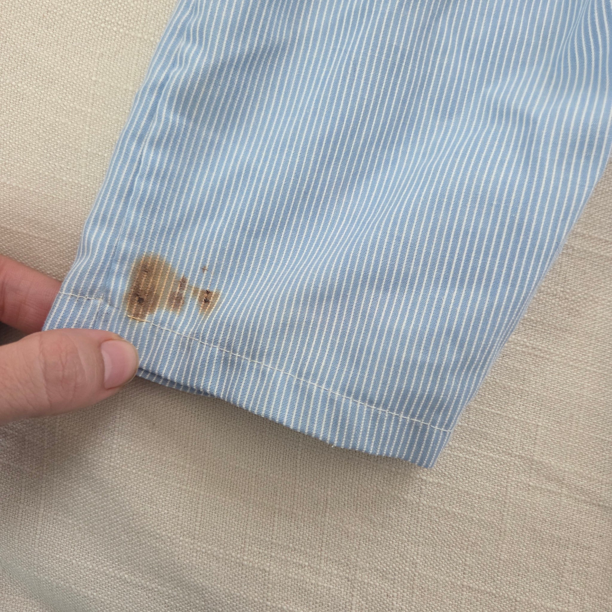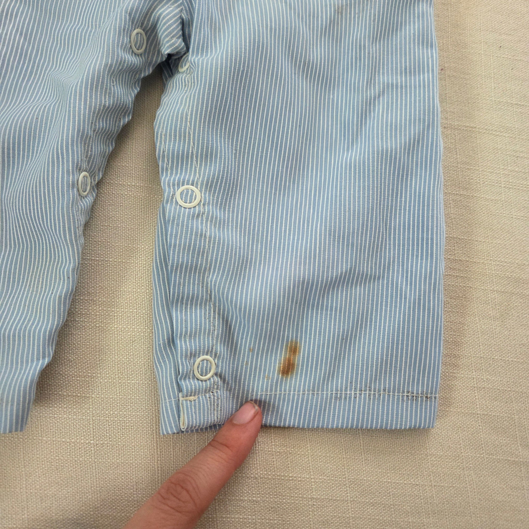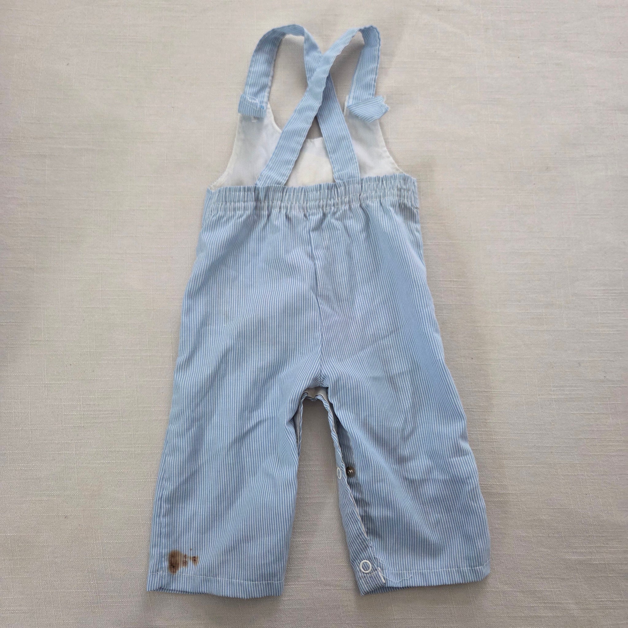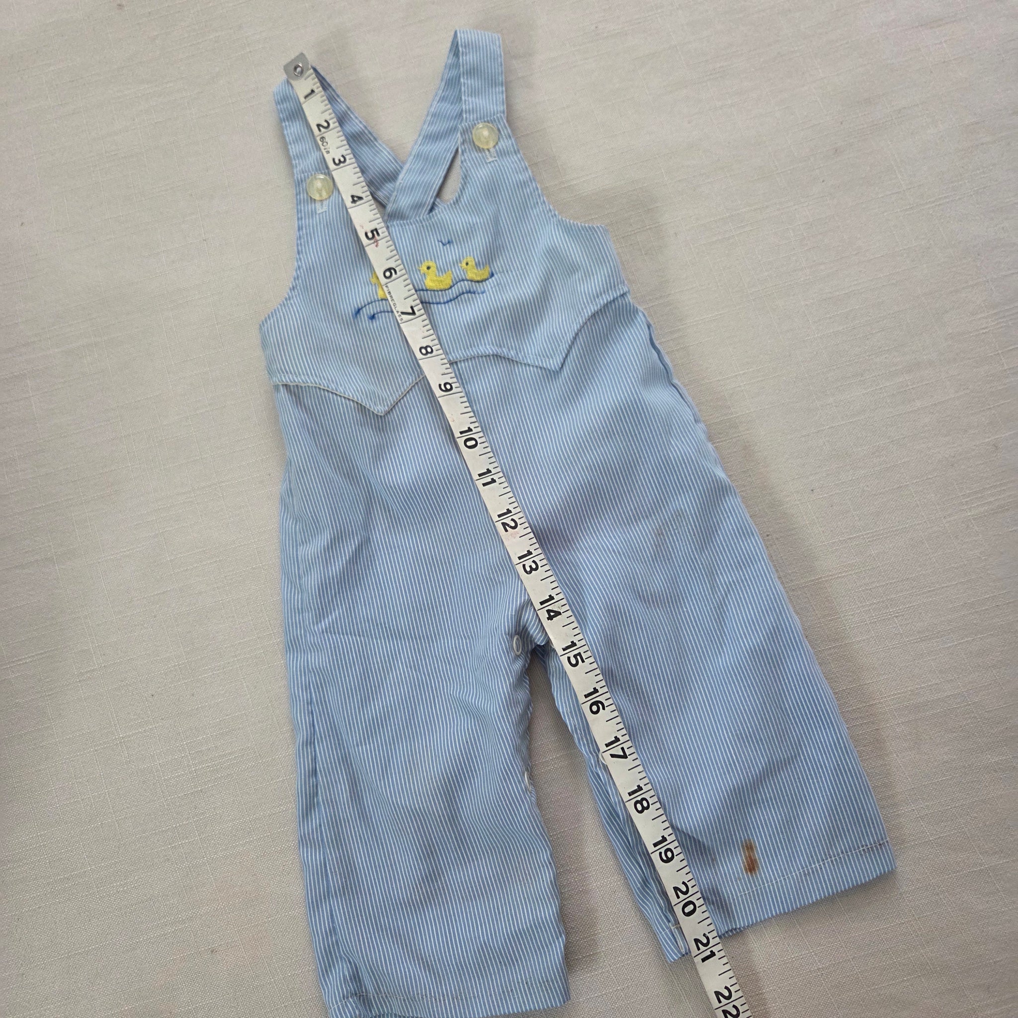 Vintage blue striped overalls with little yellow ducks embroidery on chest! Note a spot on front and back of one leg shown near ankle hem. Please see all photos for condition and measurements