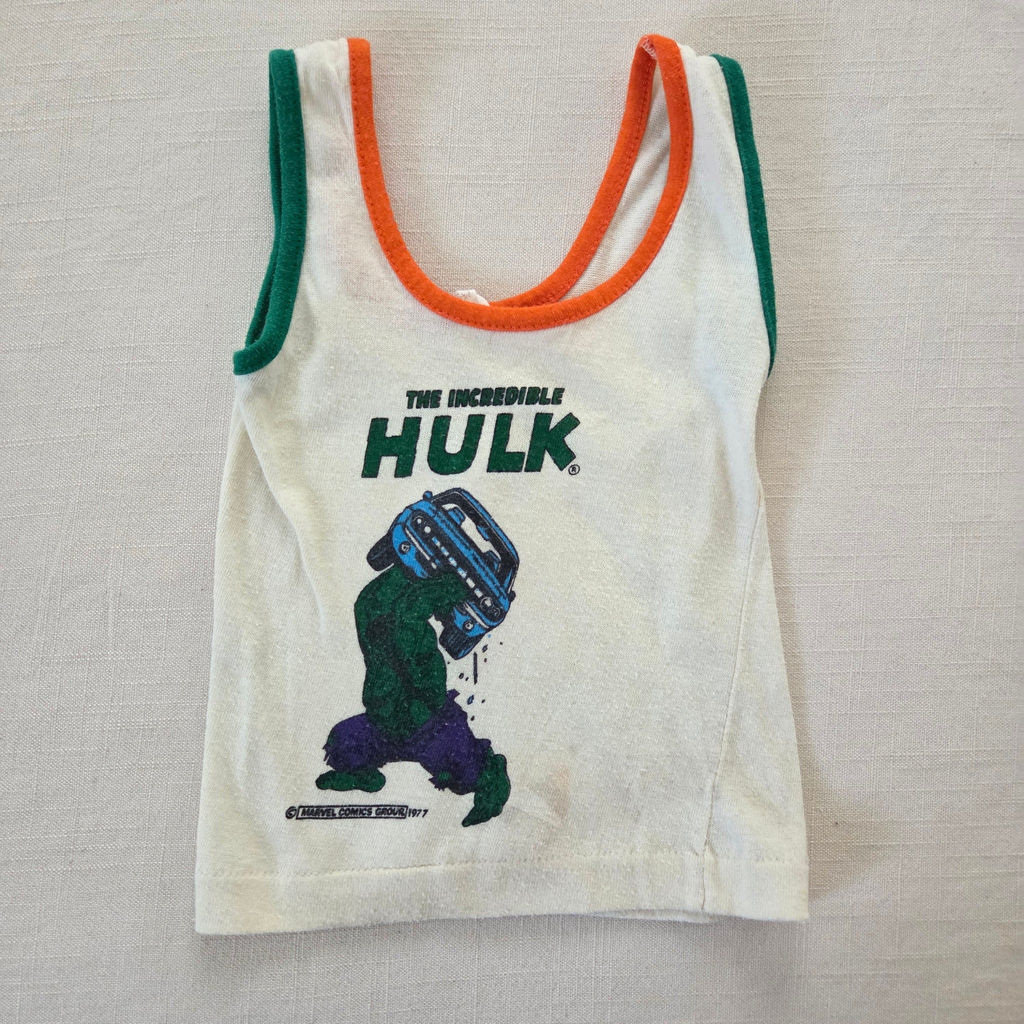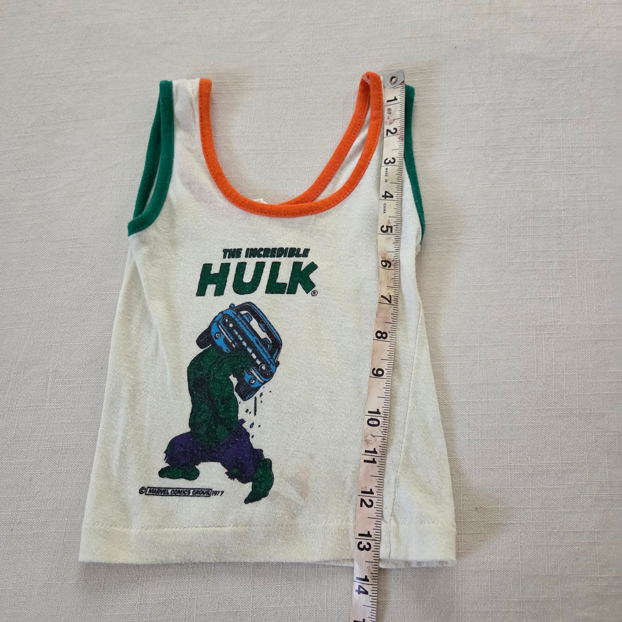Vintage 1977 dated The Incredible Hulk tank top! Note a spot shown, untreated by me. Graphic also doesn't seem totally centered. Please see all photos for condition and measurements