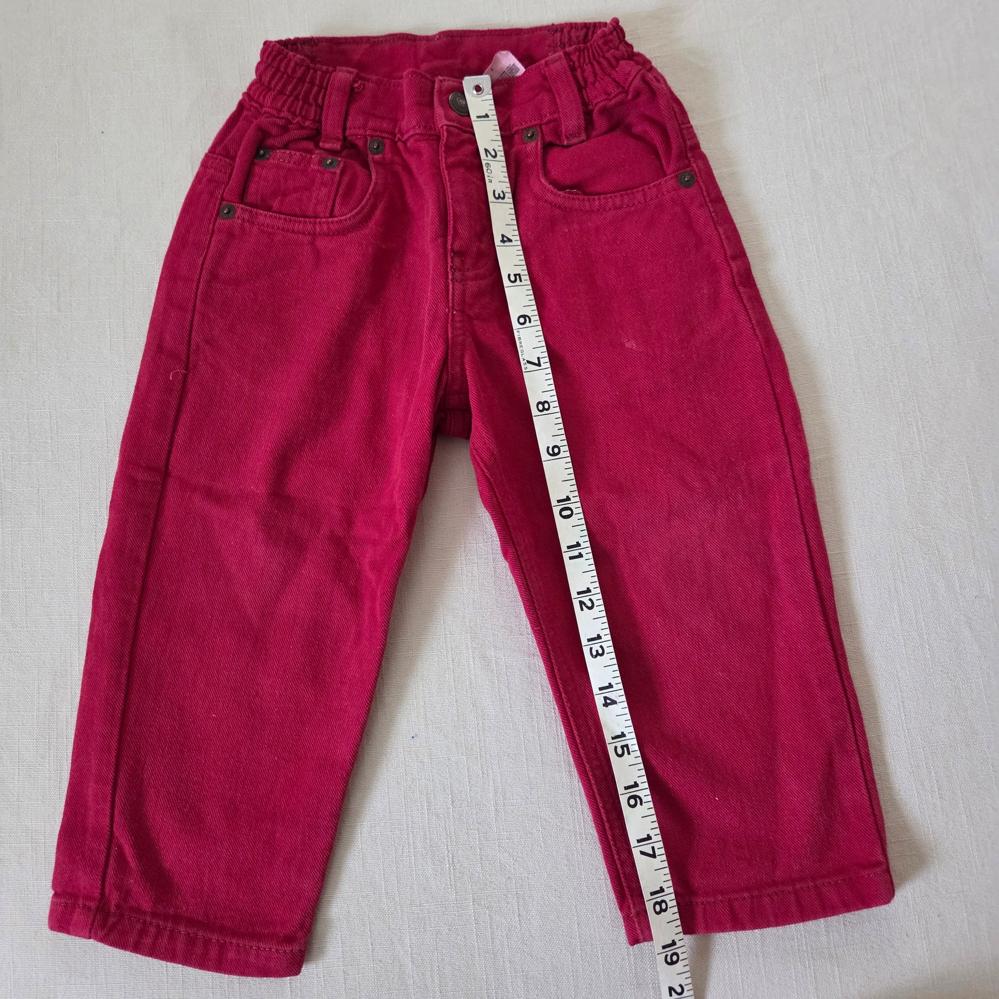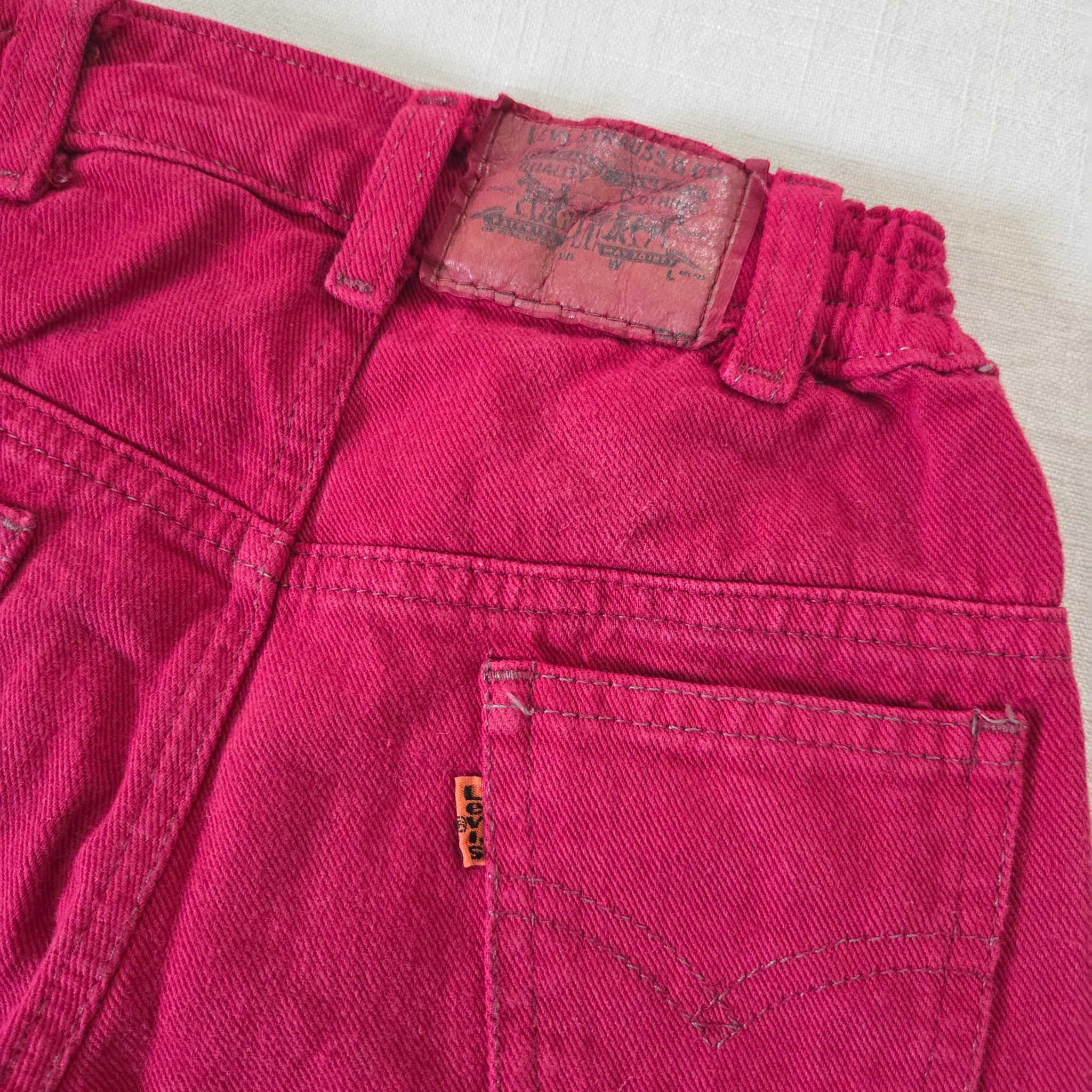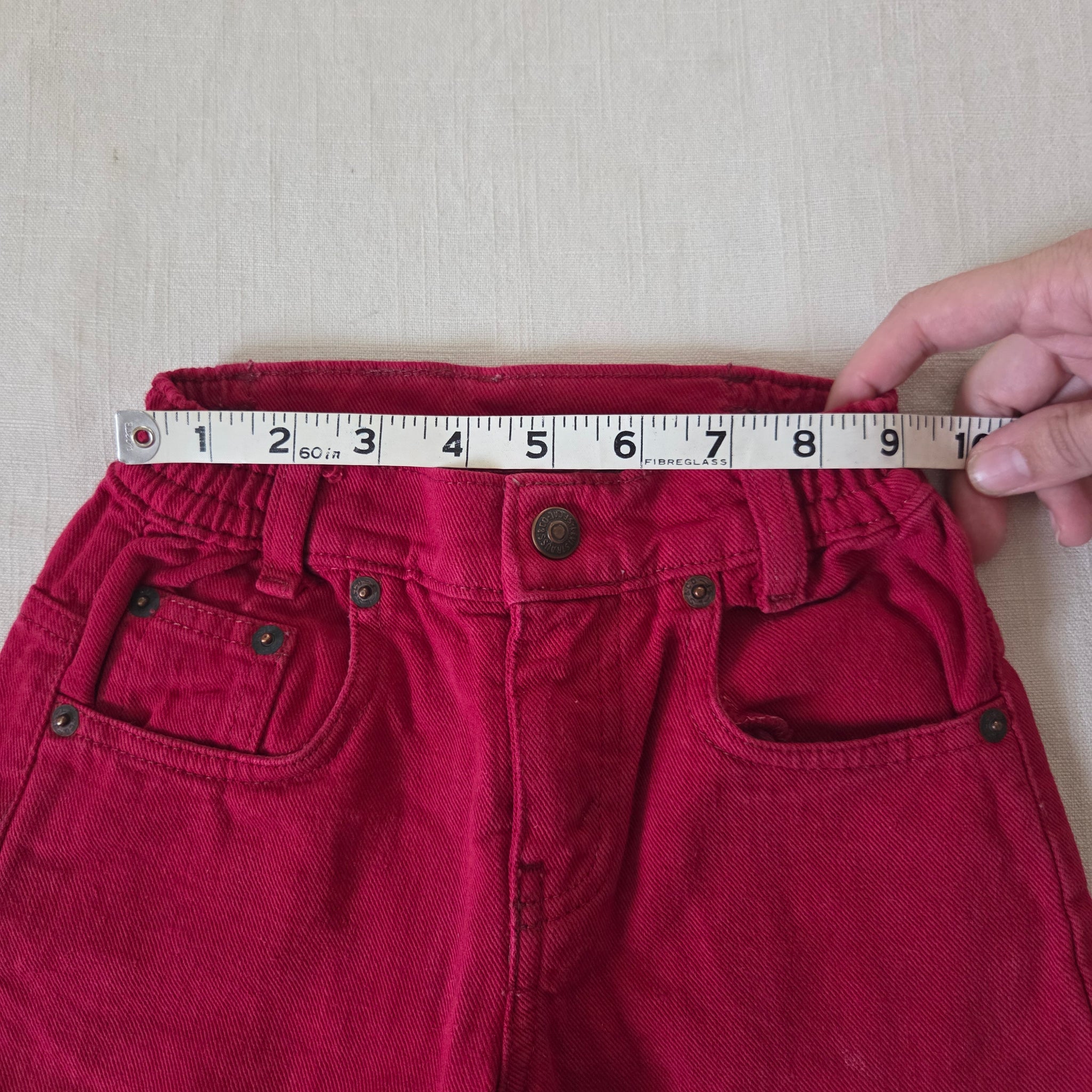 Vintage Levi's red jeans featuring cinched elastic waist, orange tab, and leather patch! Please see all photos for condition and measurements