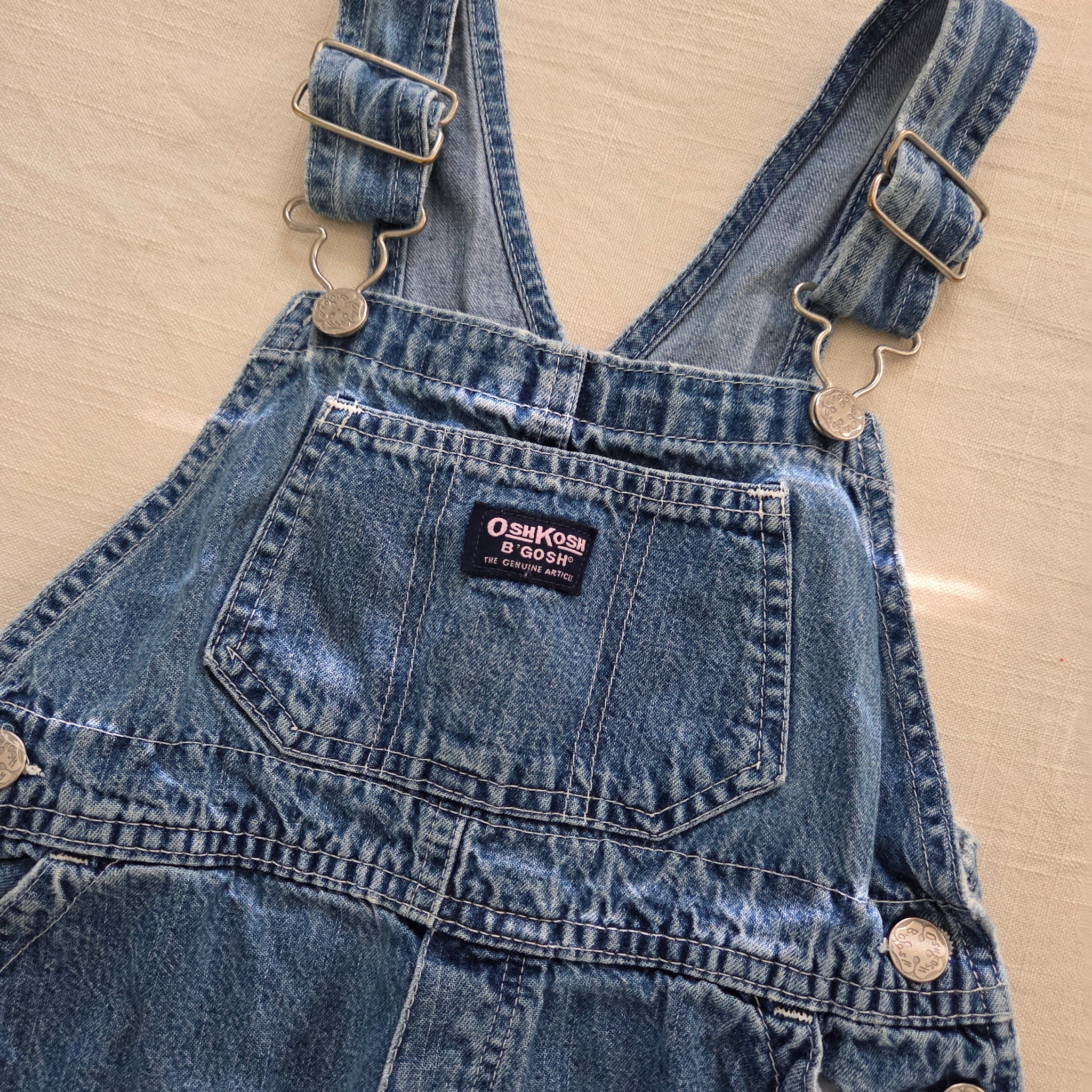 Vintage 90s/Y2K Oshkosh B'gosh classic denim overalls with the navy and pink letter patch! Please see all photos for condition and measurements