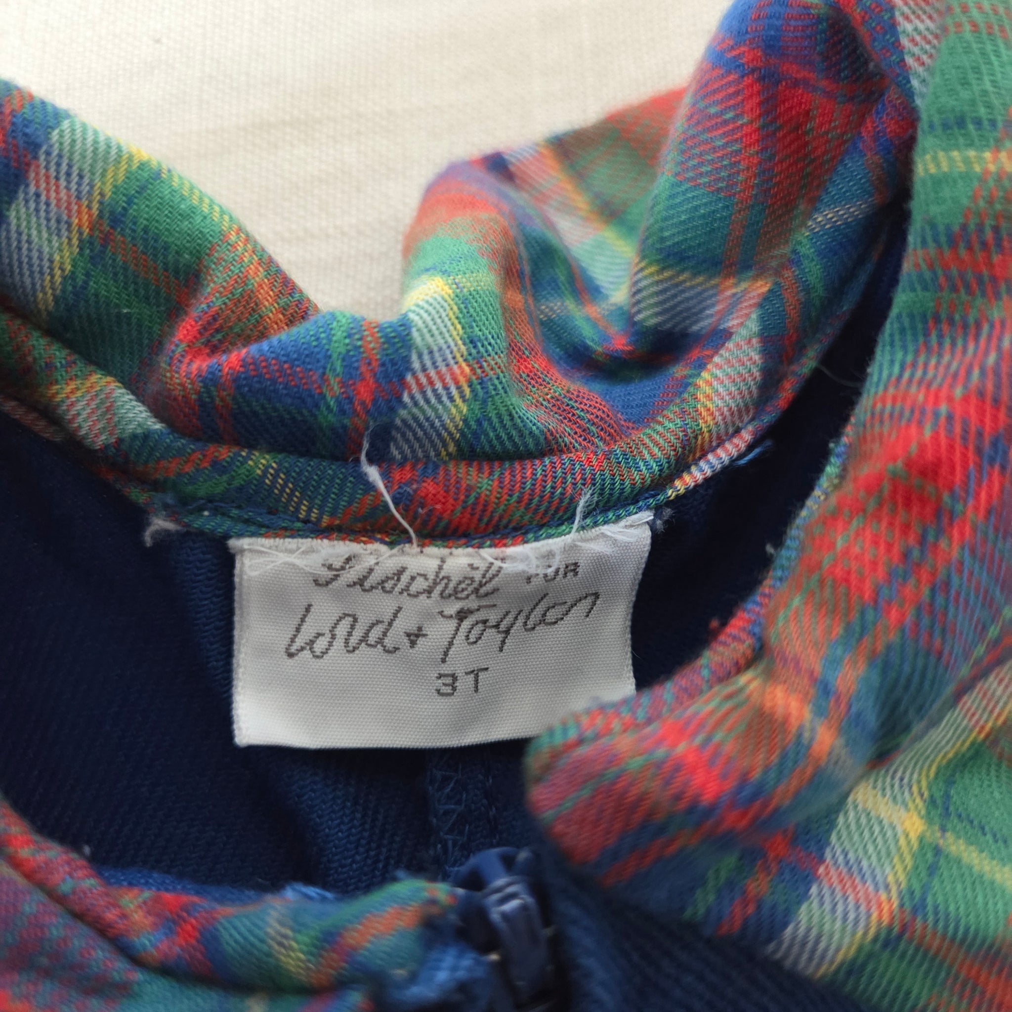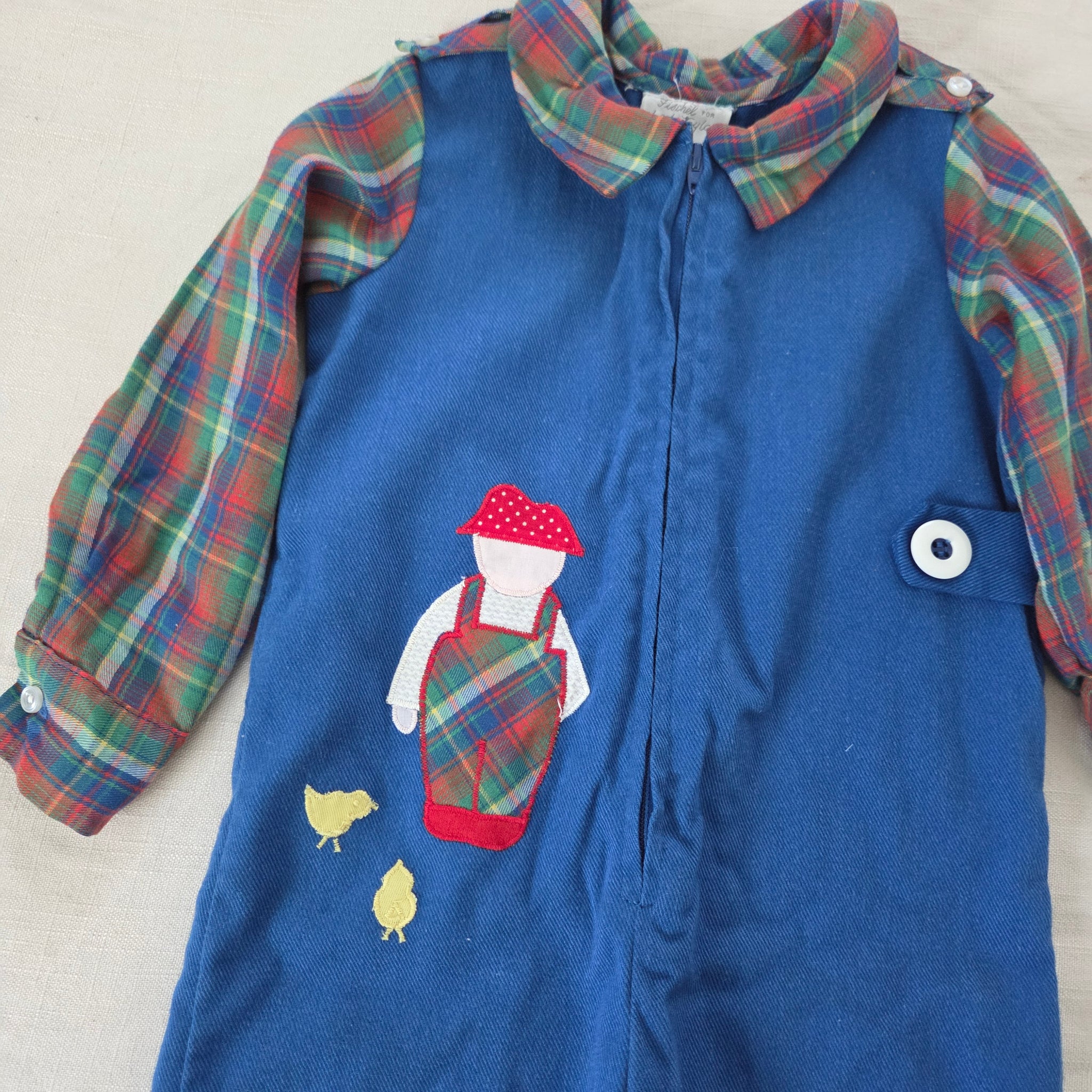 Vintage Fischel brand blue and red/green/blue plaid bodysuit with zipper down the middle and kid with chicks applique! Please see all photos for condition and measurements