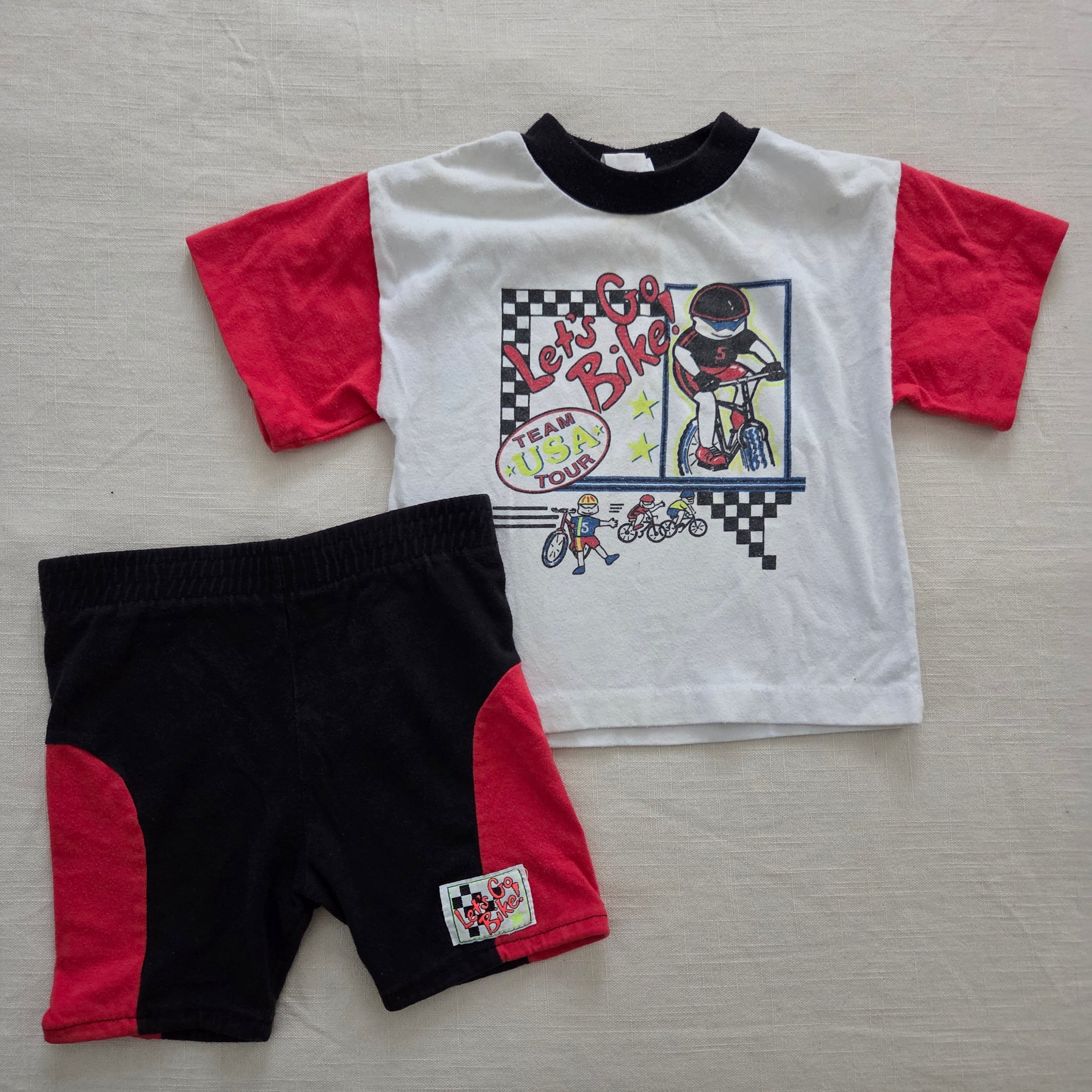 Vintage Buster Brown brand "bike tour" tee and matching black shorts set! Note the elastic on shorts is mostly relaxed so best for husky fit or needs replacing. Please see all photos for condition and measurements