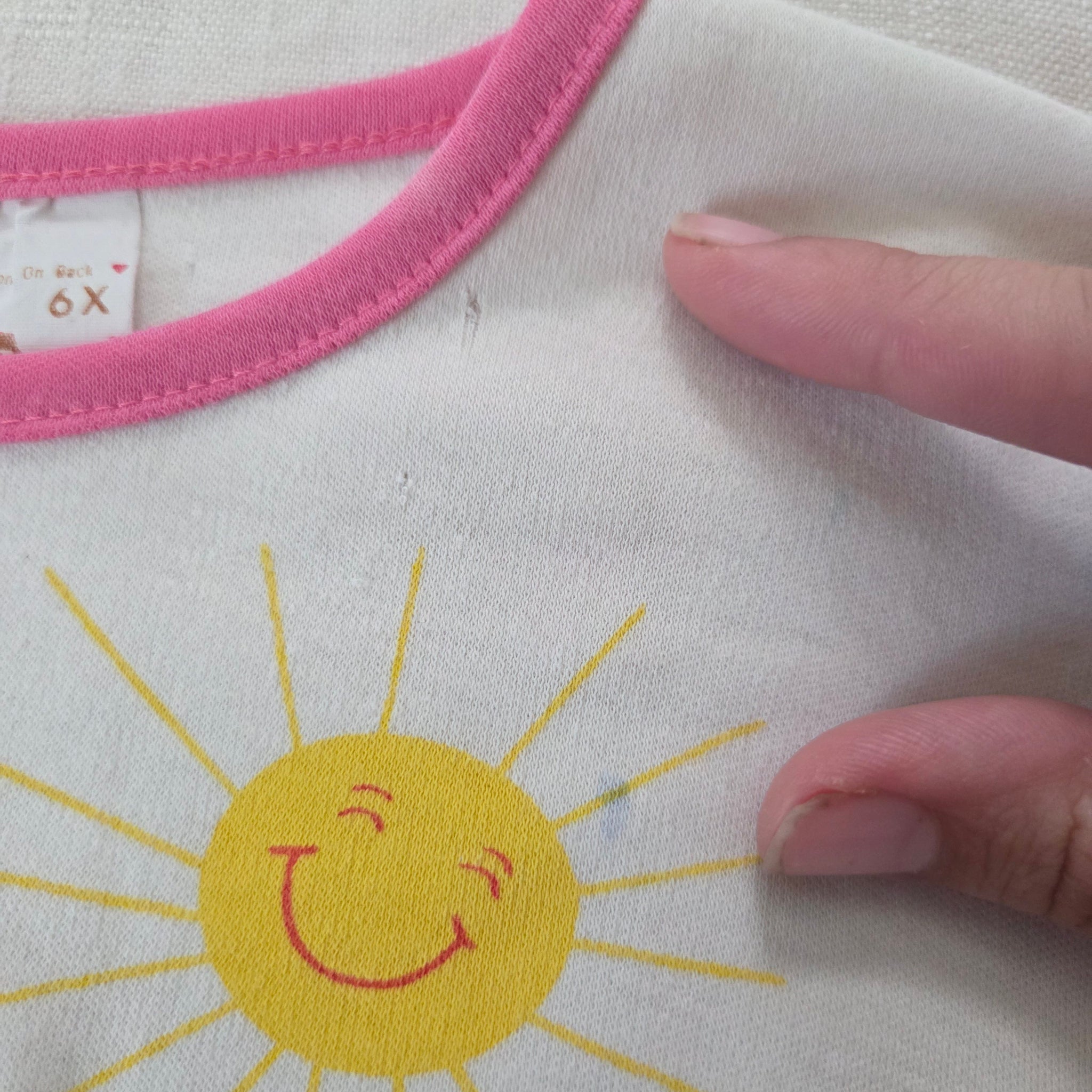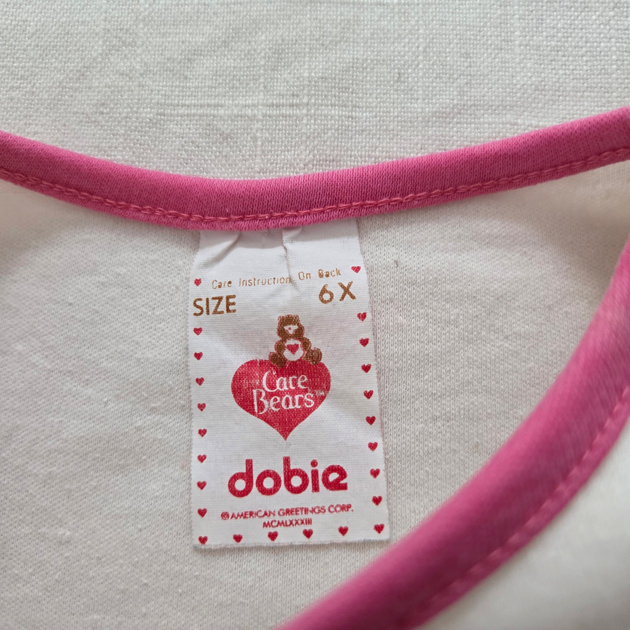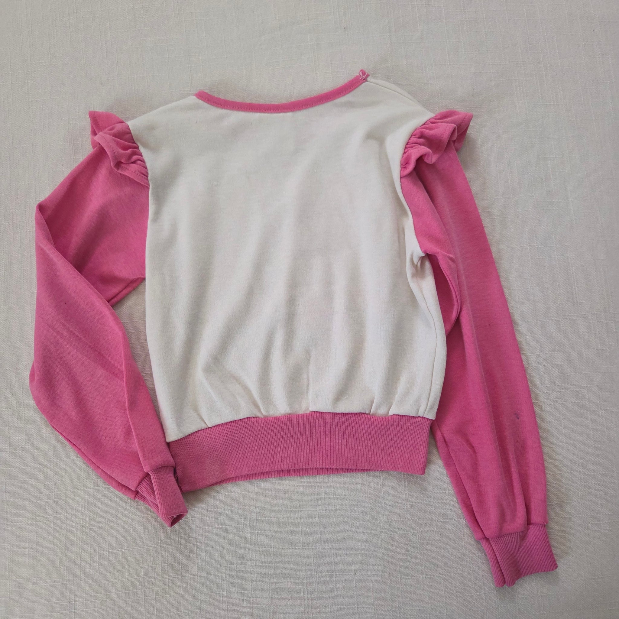 Vintage Care Bears rainbow "sprinkle love everywhere" pink long sleeve shirt with ruffles at shoulders! Note a small faint spot on belly, not treated by me. Please see all photos for condition and measurements