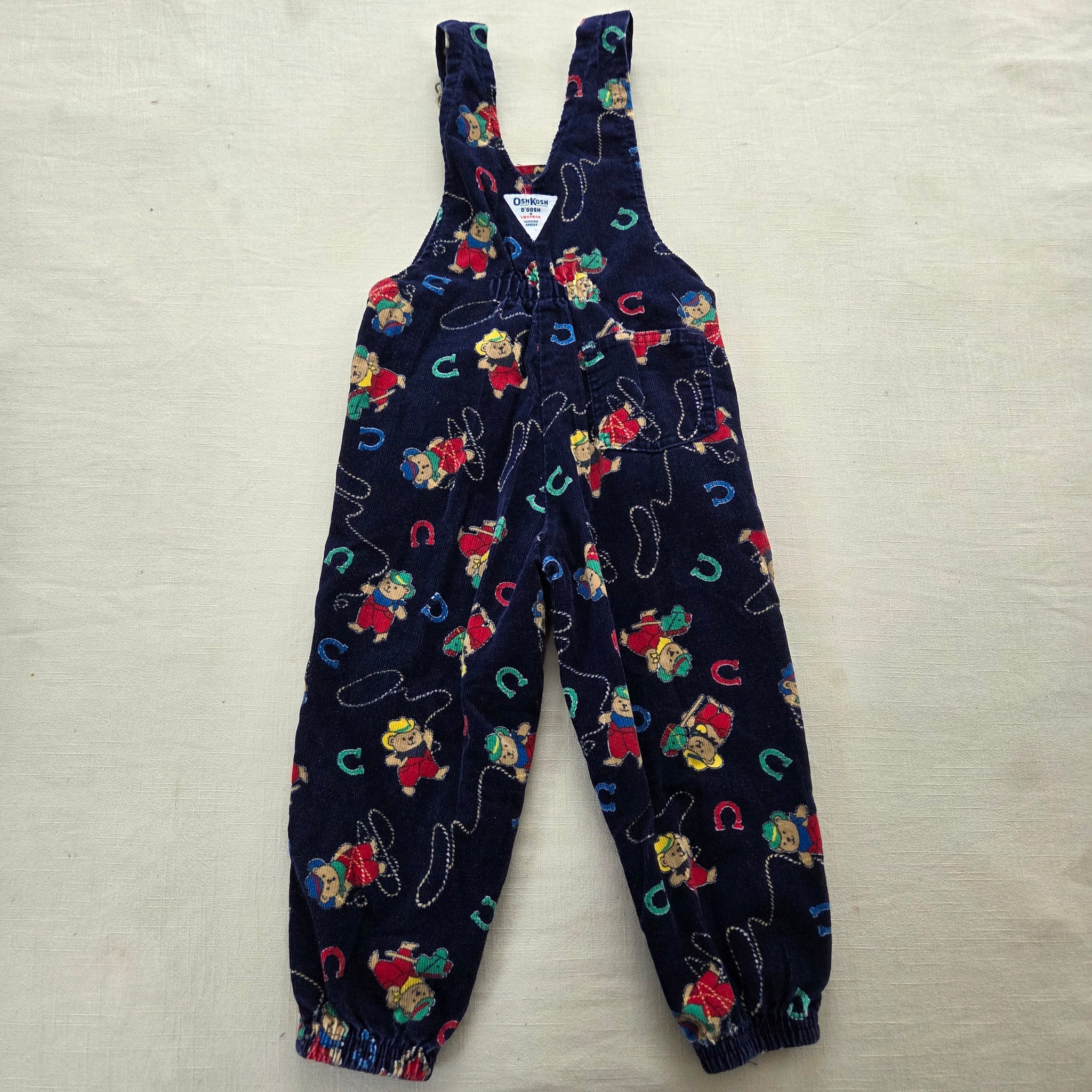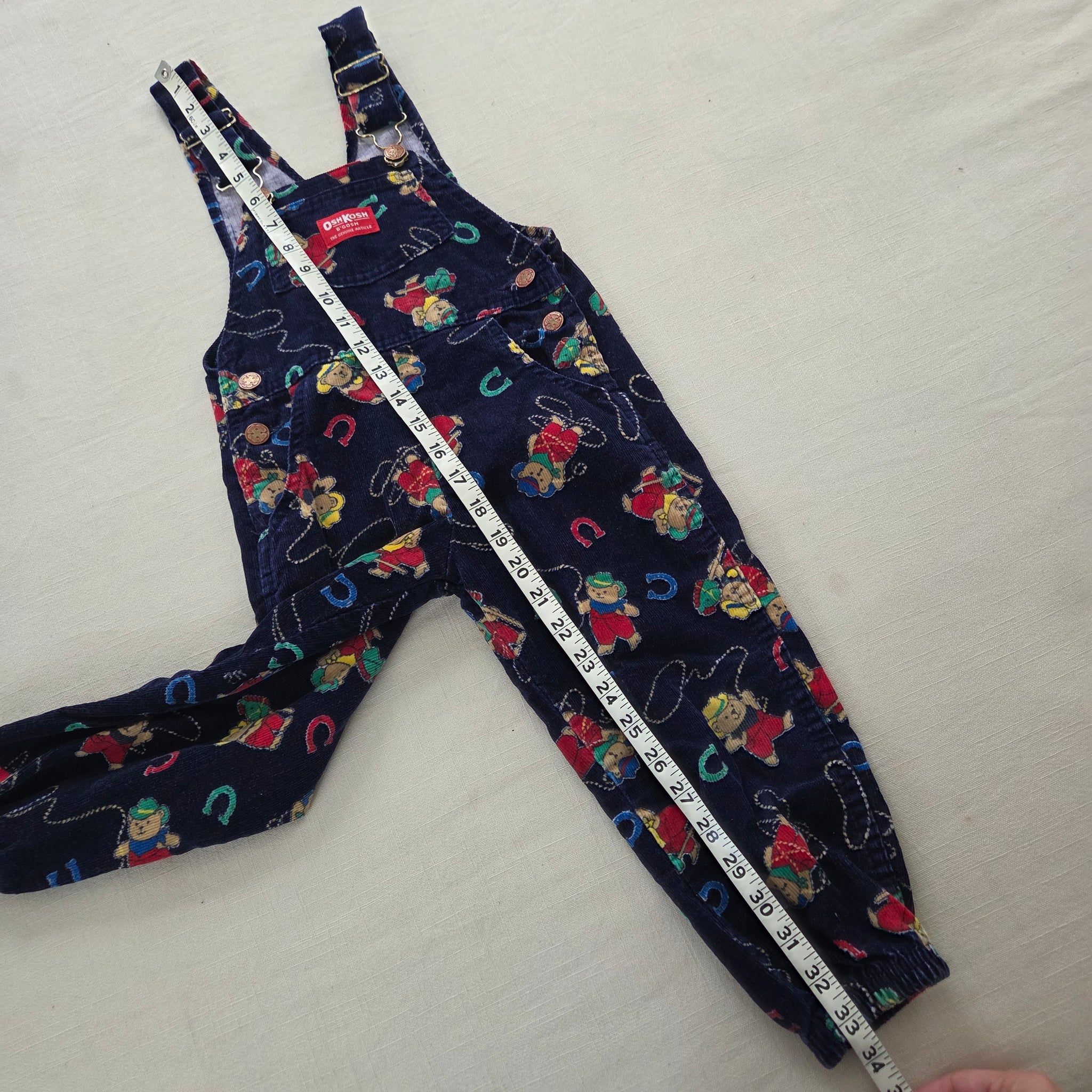 Vintage Oshkosh navy blue corduroy overalls with jogger ankles and cowboy bears pattern all over! Please see all photos for condition and measurements