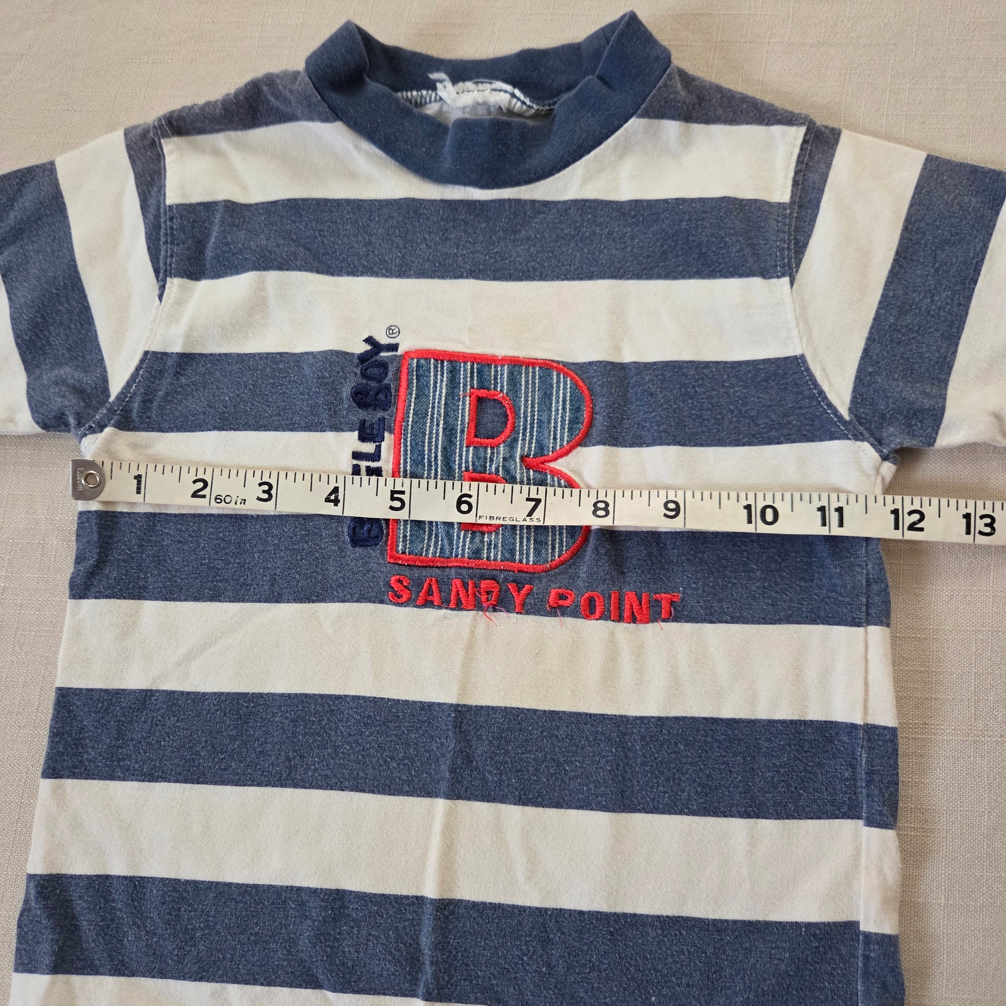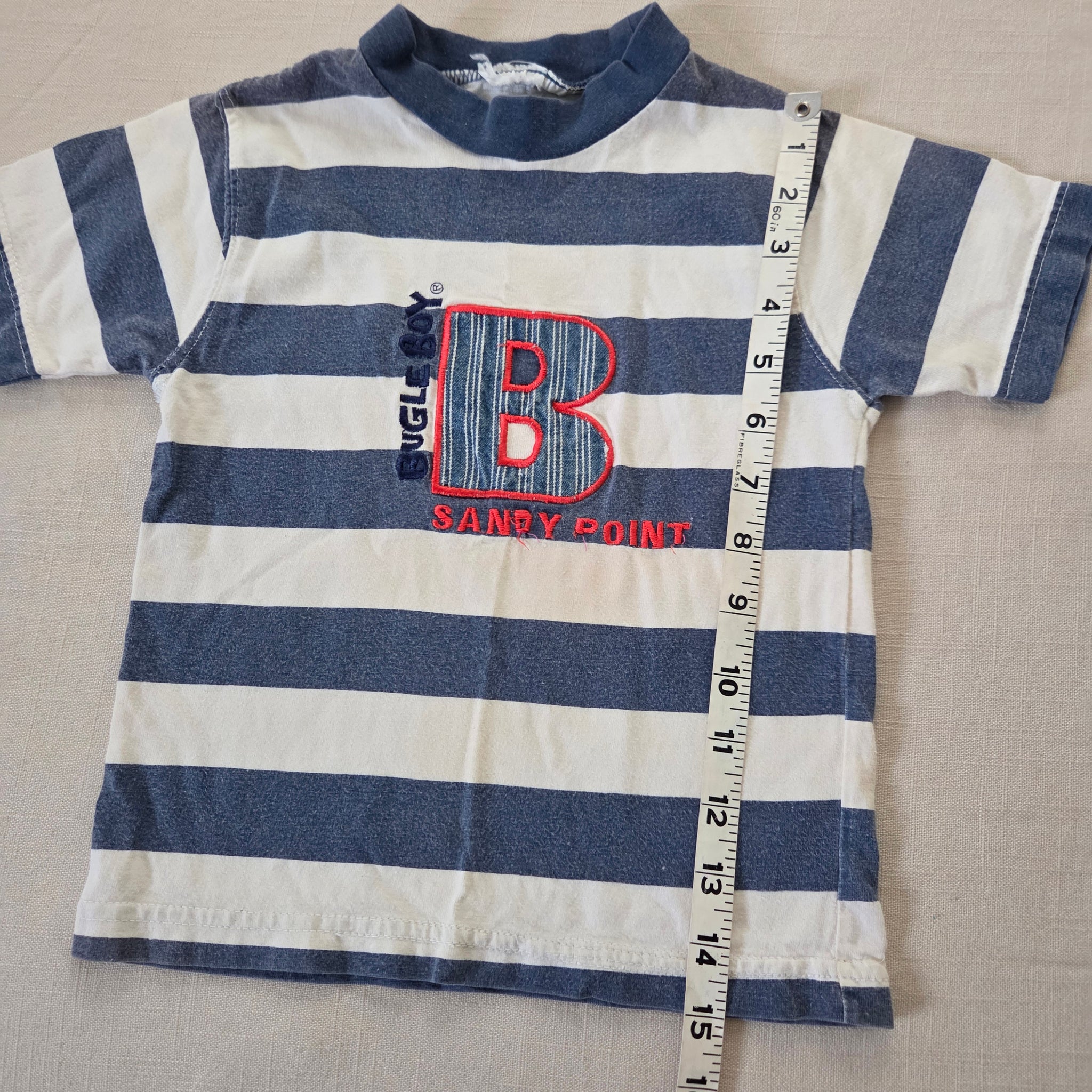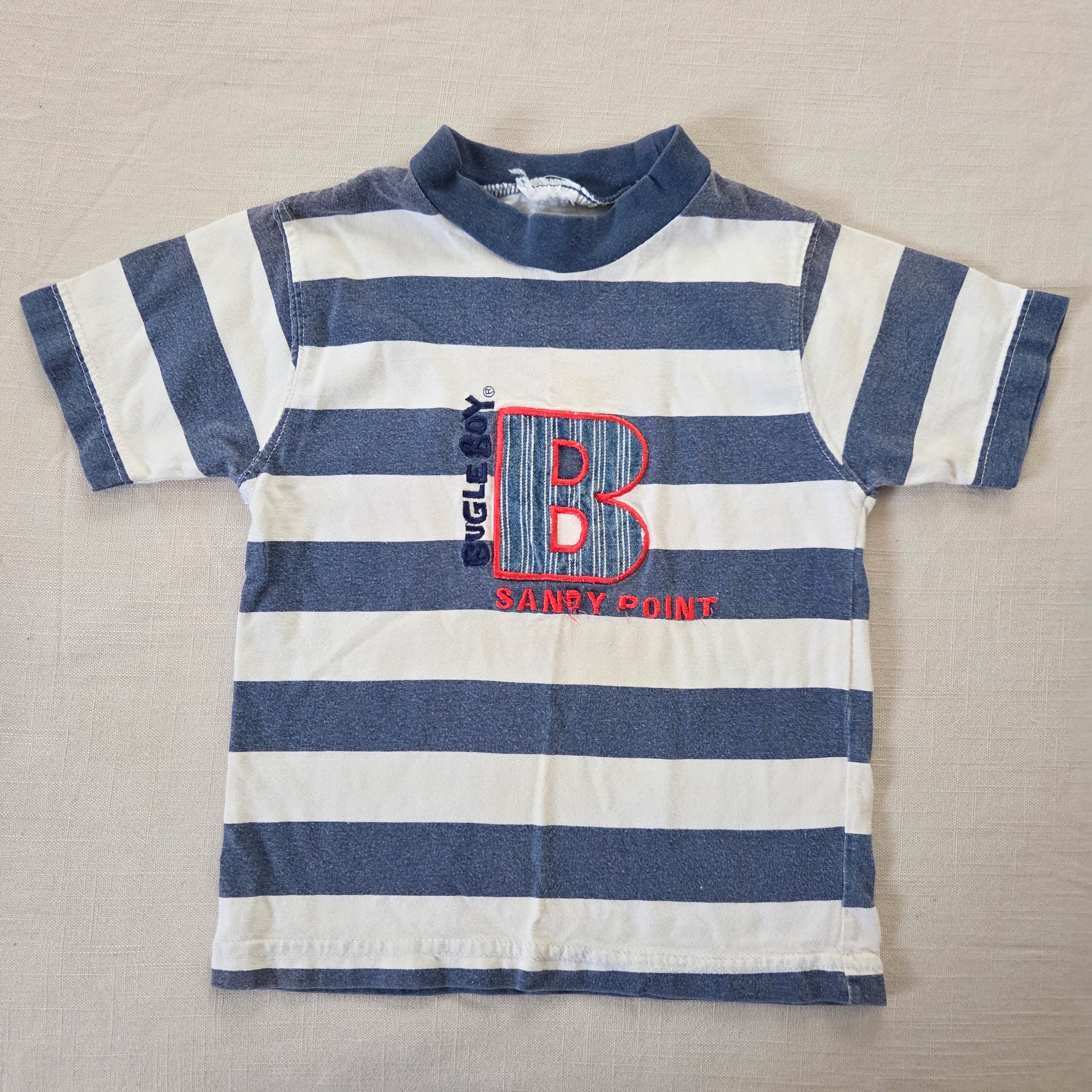 Vintage Bugle Boy brand faded blue and white striped shirt with logo and "Sandy Point" embroidery on chest! Please see all photos for condition and measurements