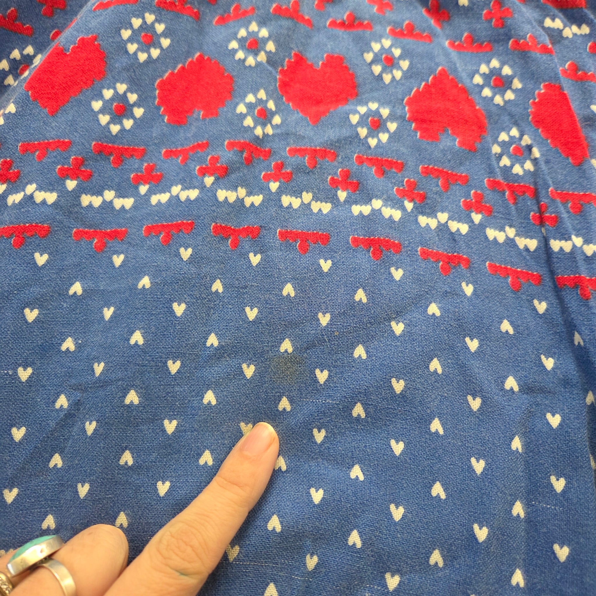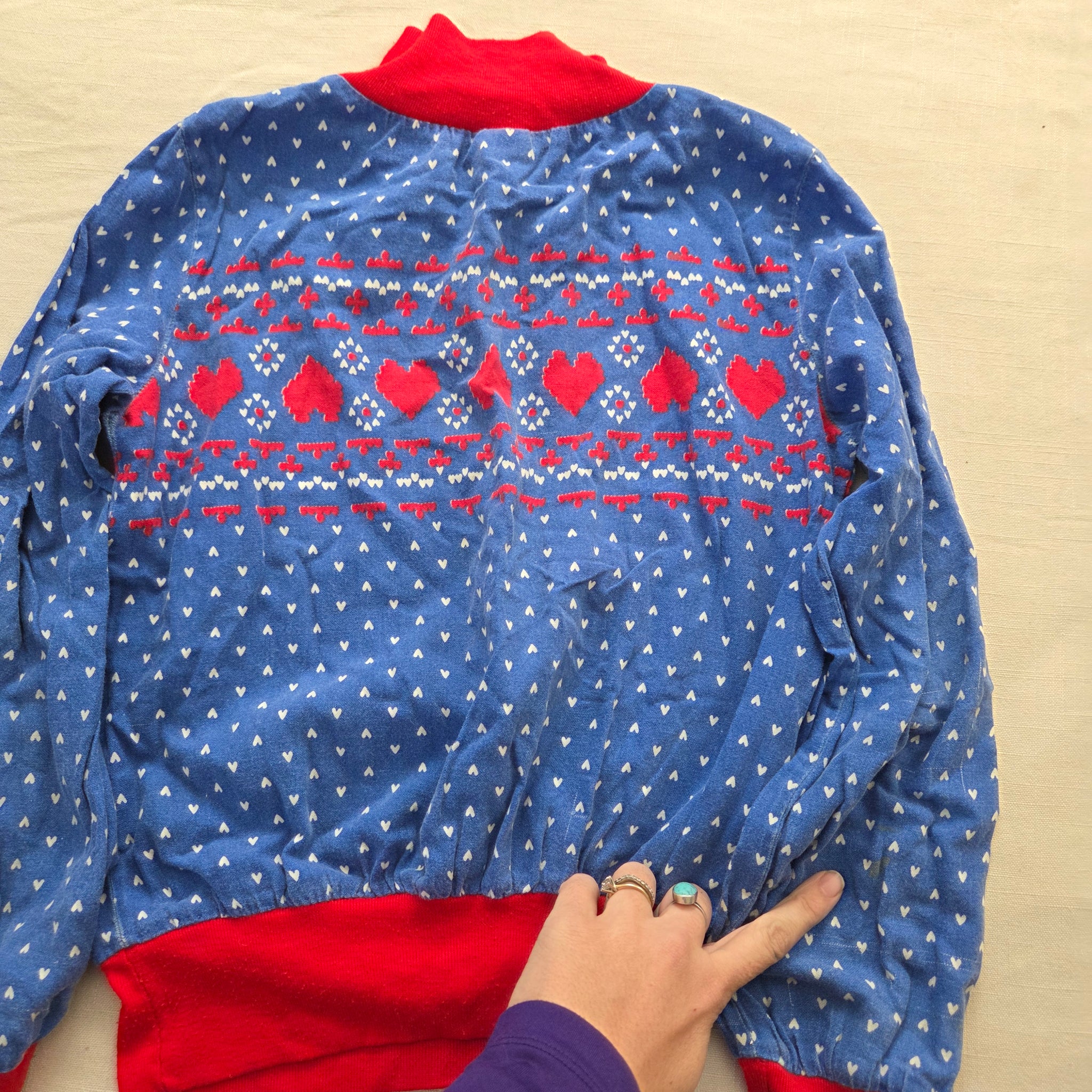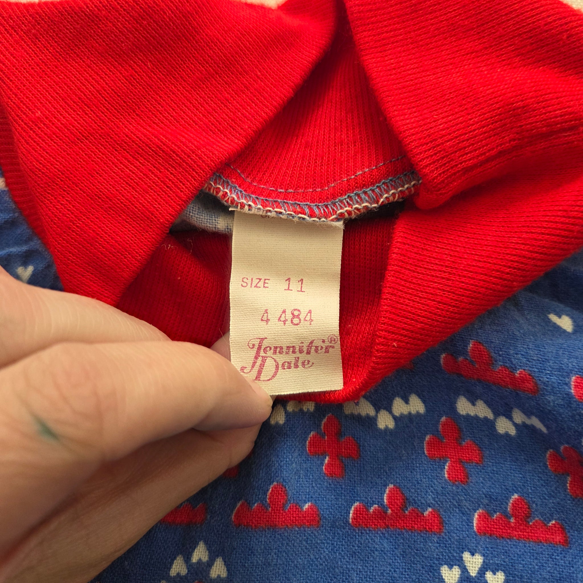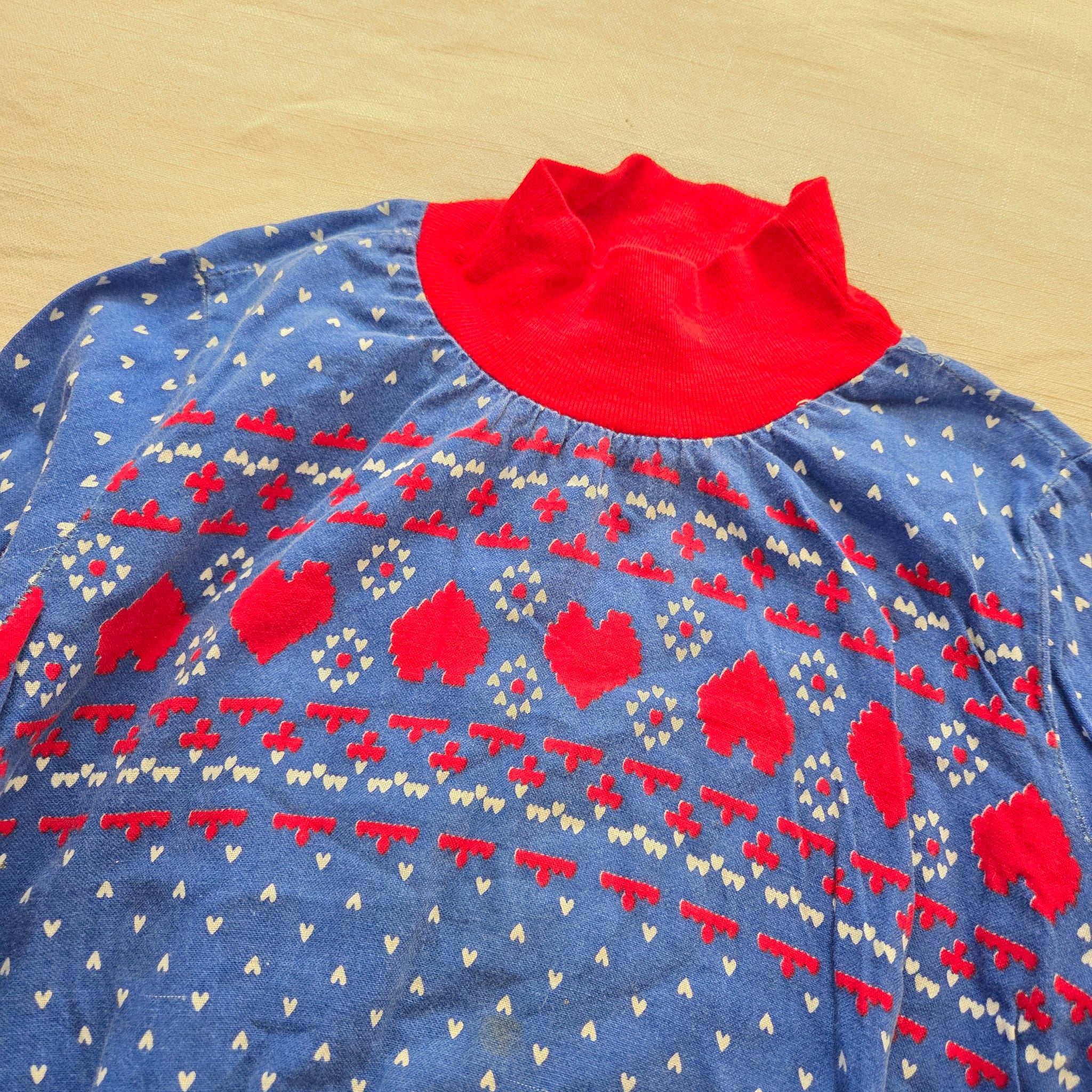 Vintage Jennifer Dale brand heart pattern blue long sleeve shirt with red mock neck and cheat detail too! Note a light spot on chest and back of one wrist shown as well as small pull/flaw on sleeve shown in pics. Please see all photos for condition and measurements