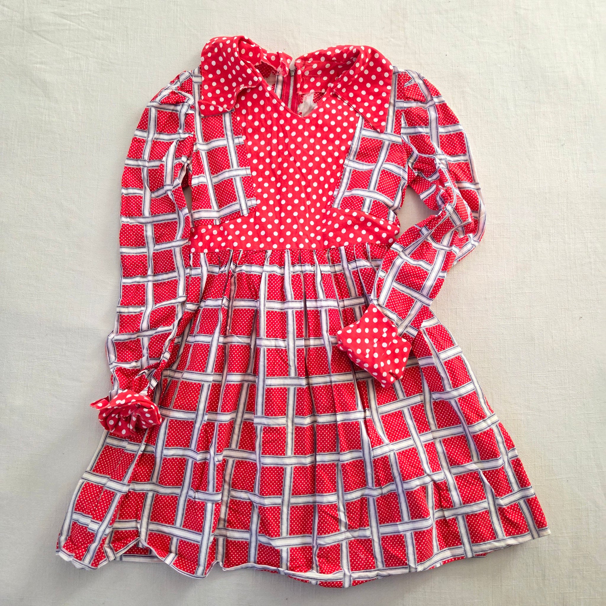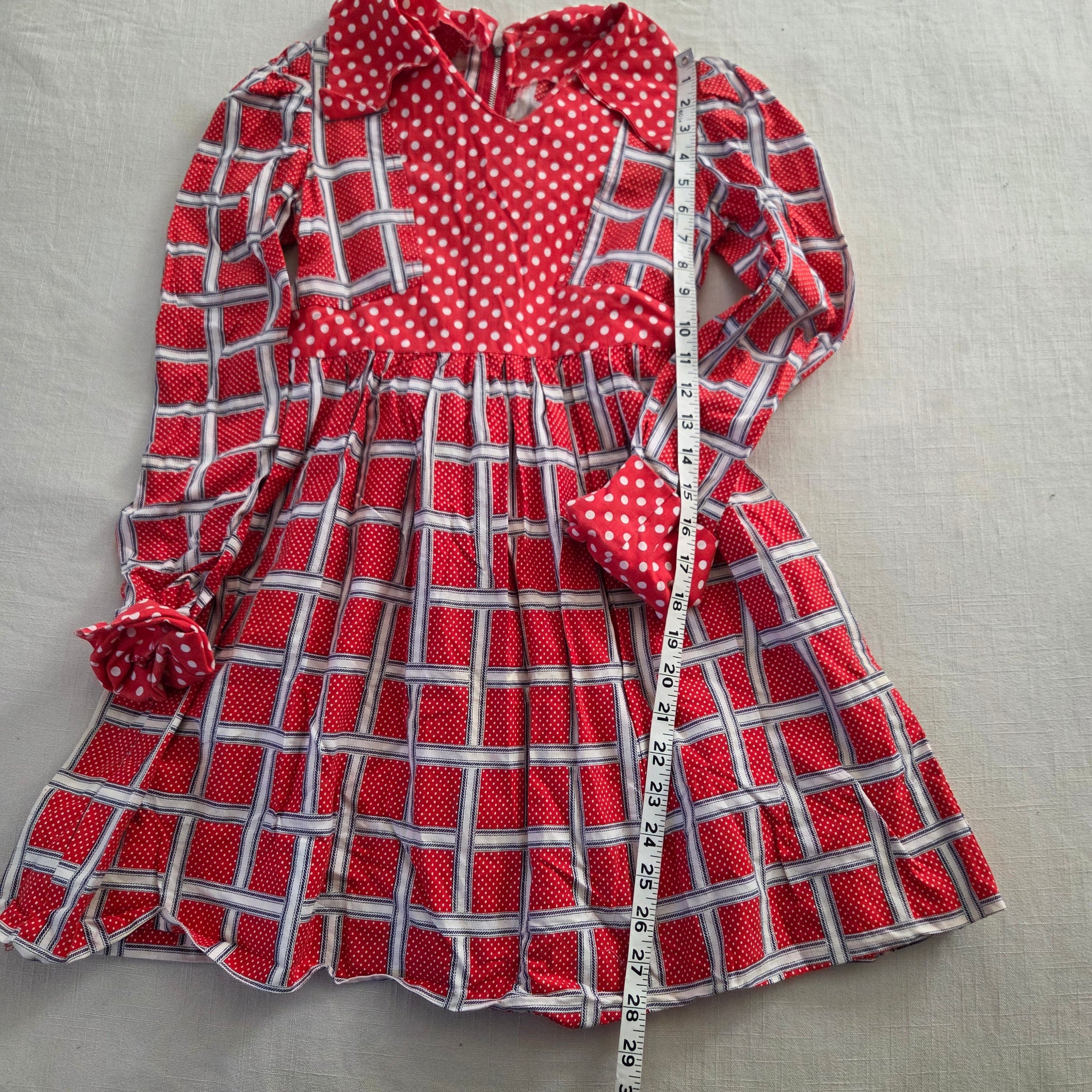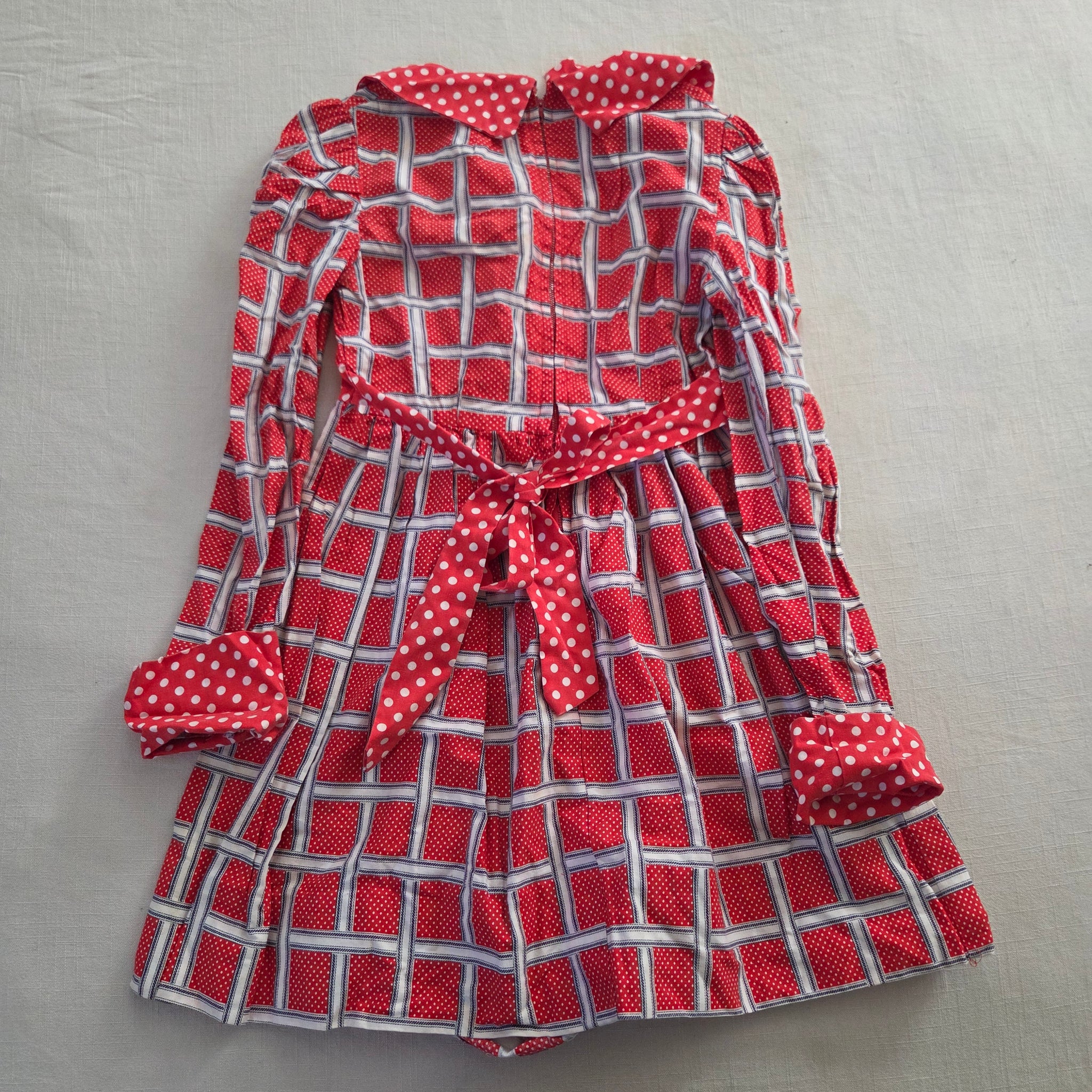 Vintage red and white grid and dotted long sleeve dress with tie in the back! Please see all photos for condition and measurements