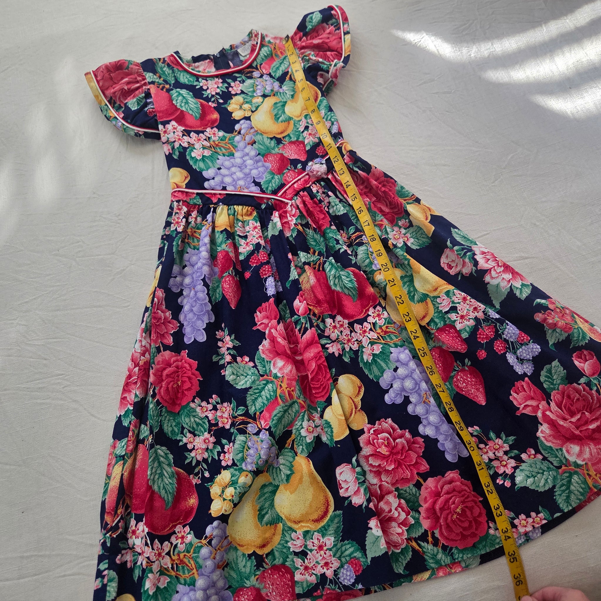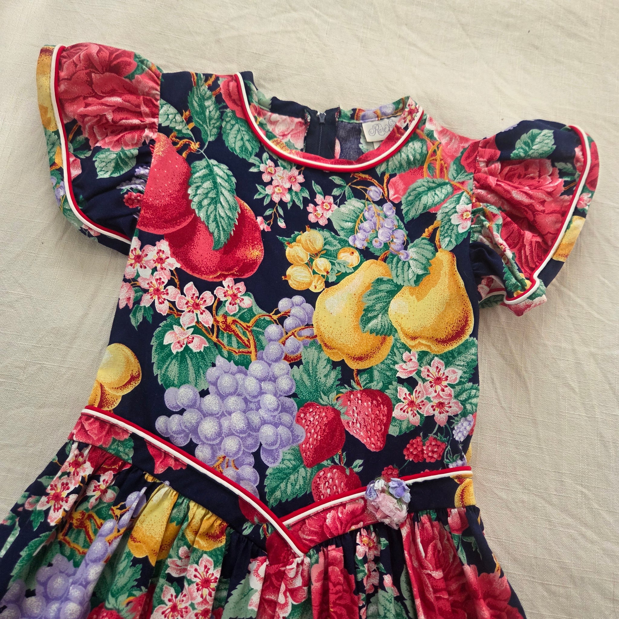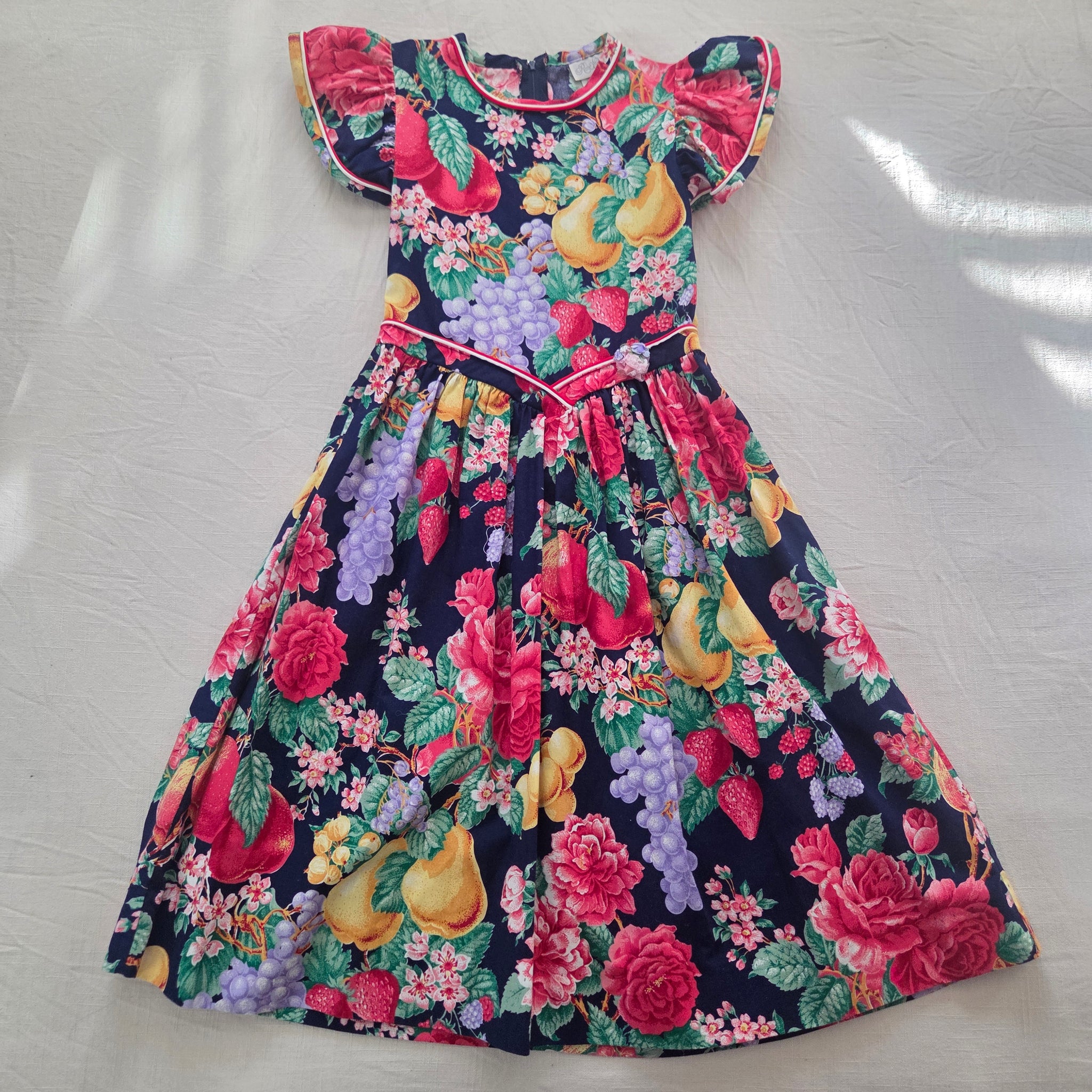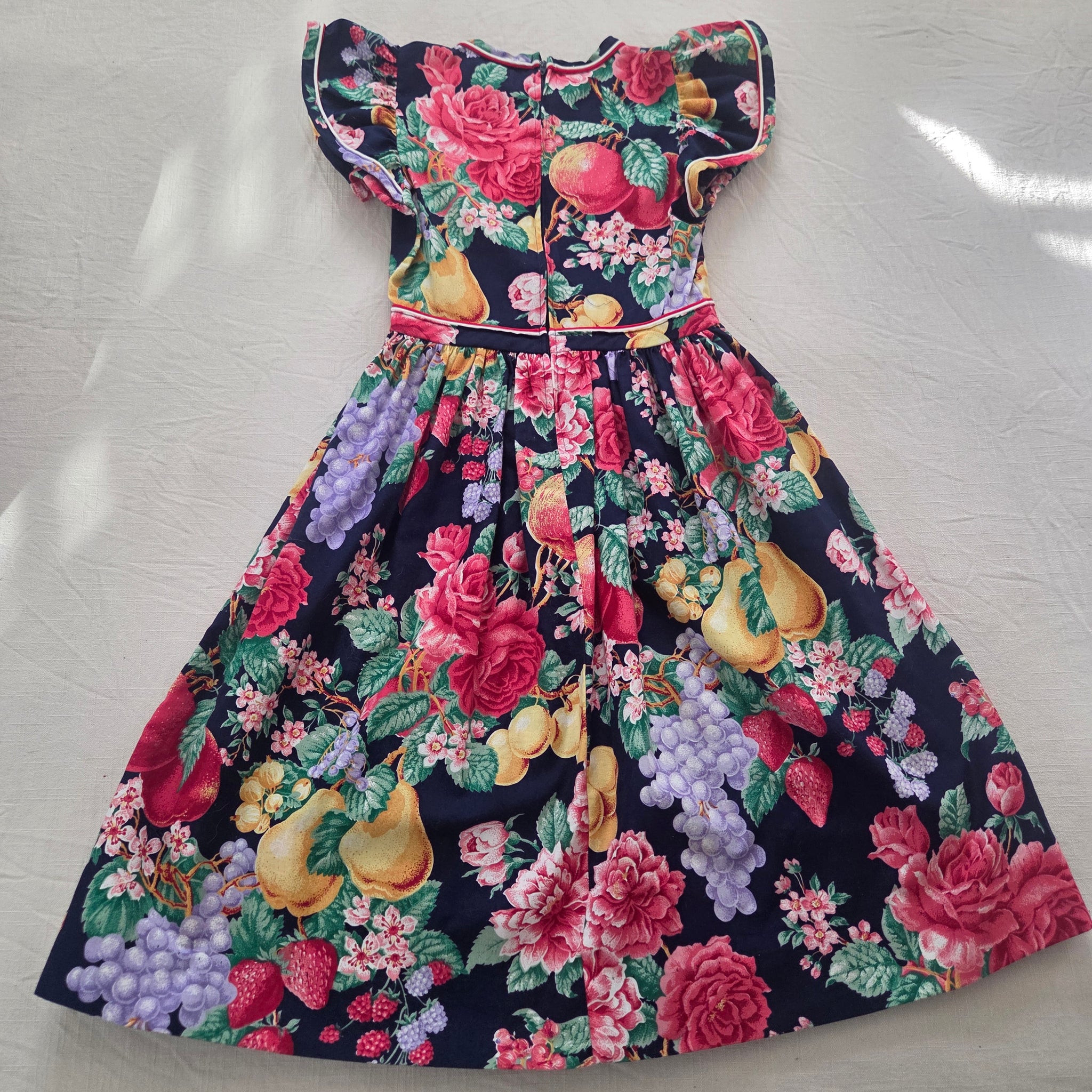 Vintage Rare Editions 100% cotton fruit and floral pattern dress with flutter sleeves! Please see all photos for condition and measurements