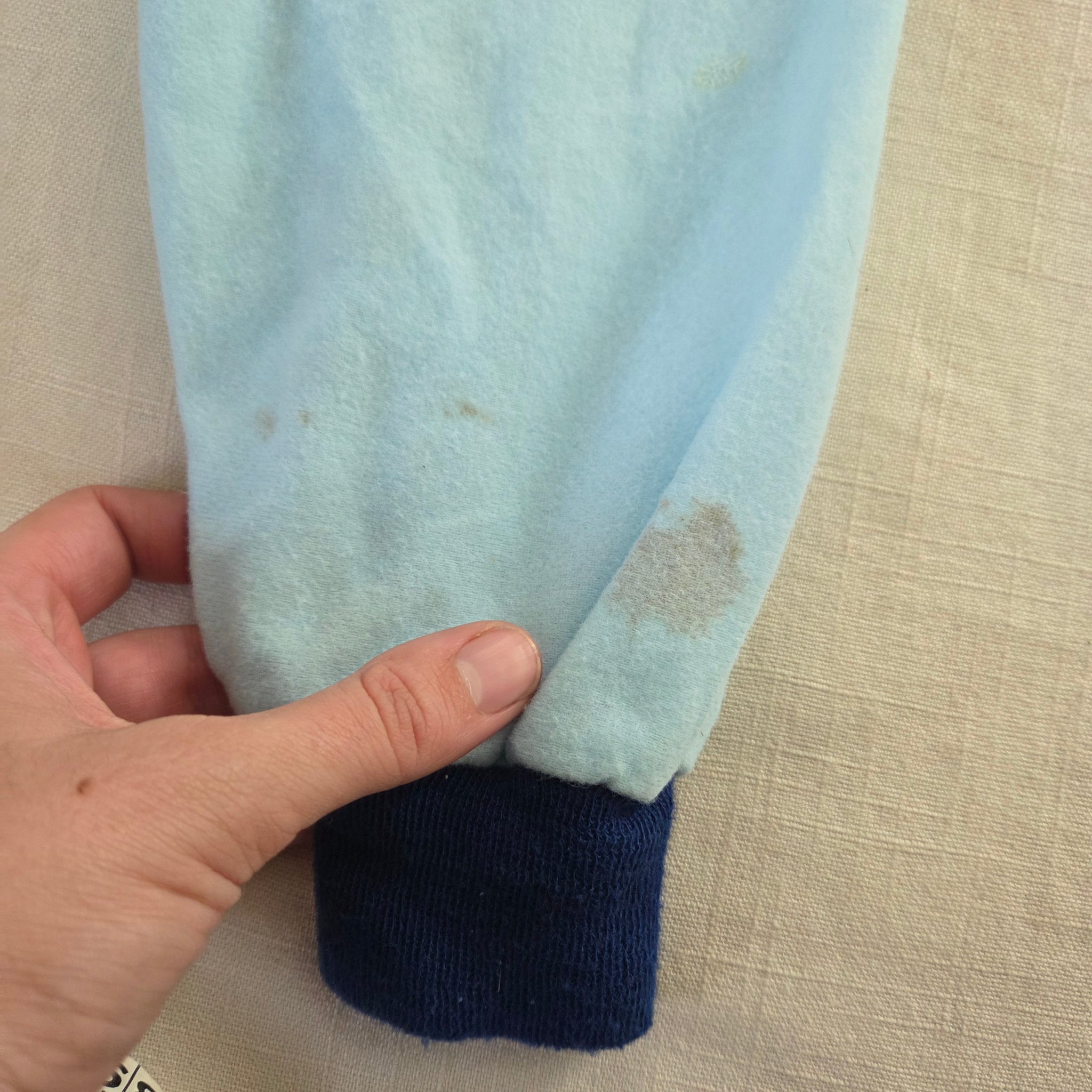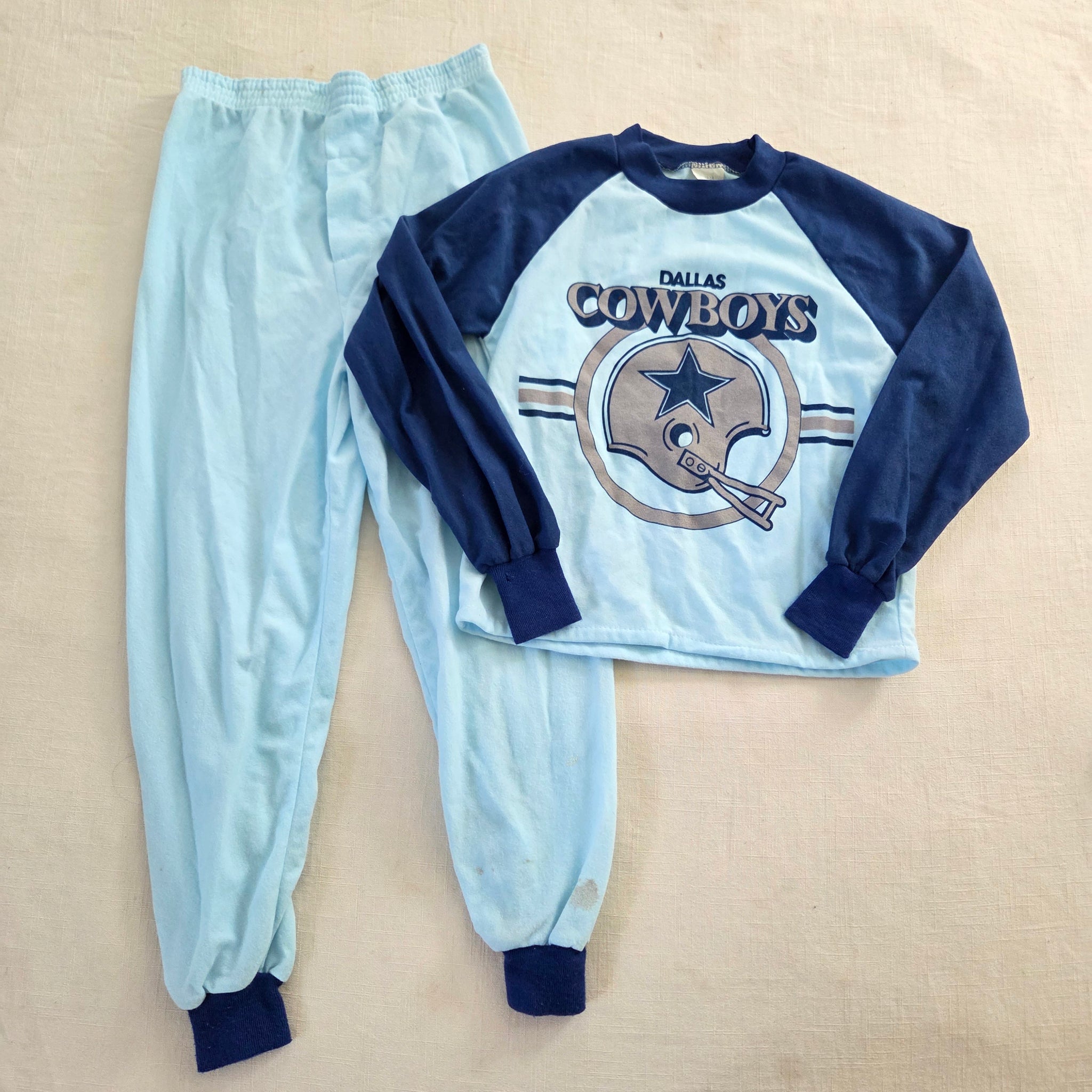 Vintage Dallas Cowboys blue soft fleece pajamas shirt and pants with stretchy elastic waist! Note 2 spots on ankle of one pants leg shown in pics. Please see all photos for condition and measurements