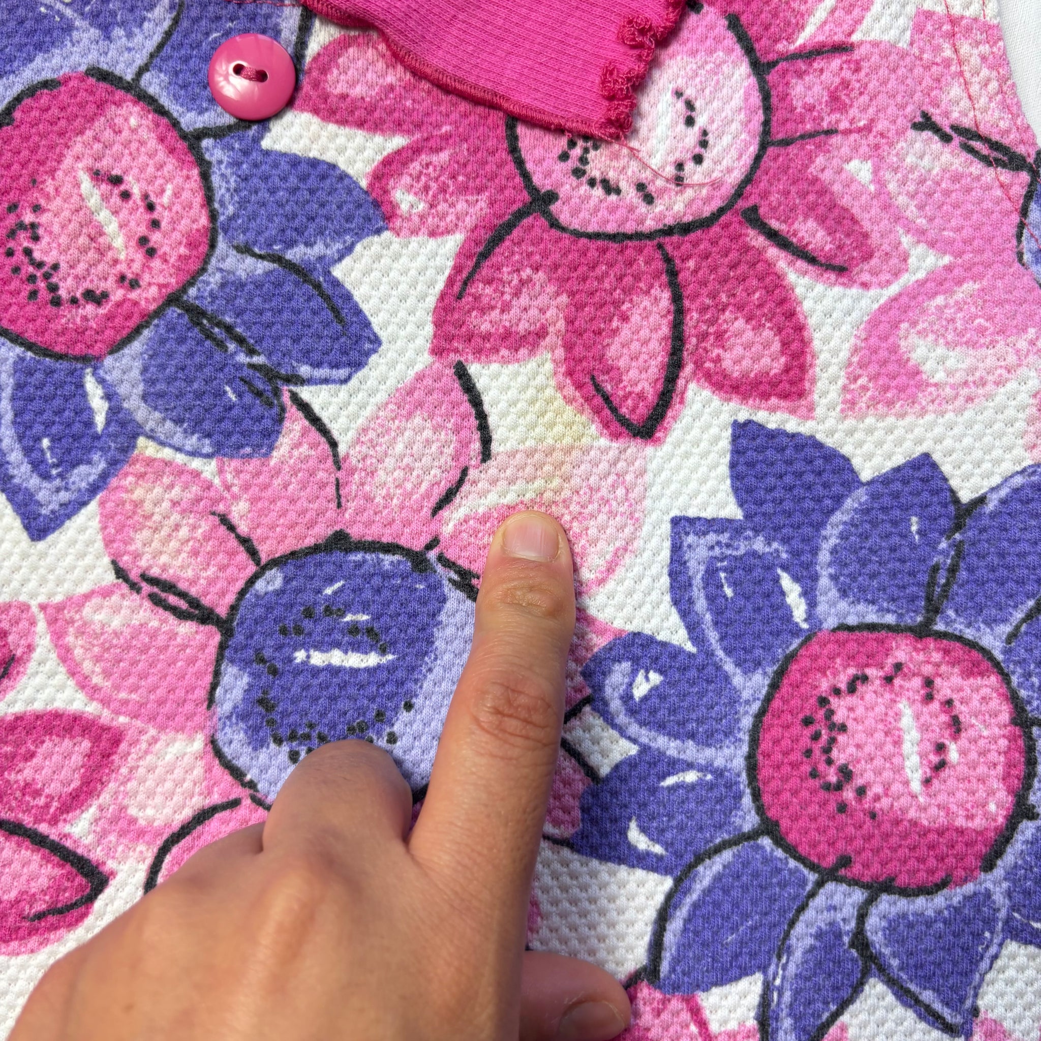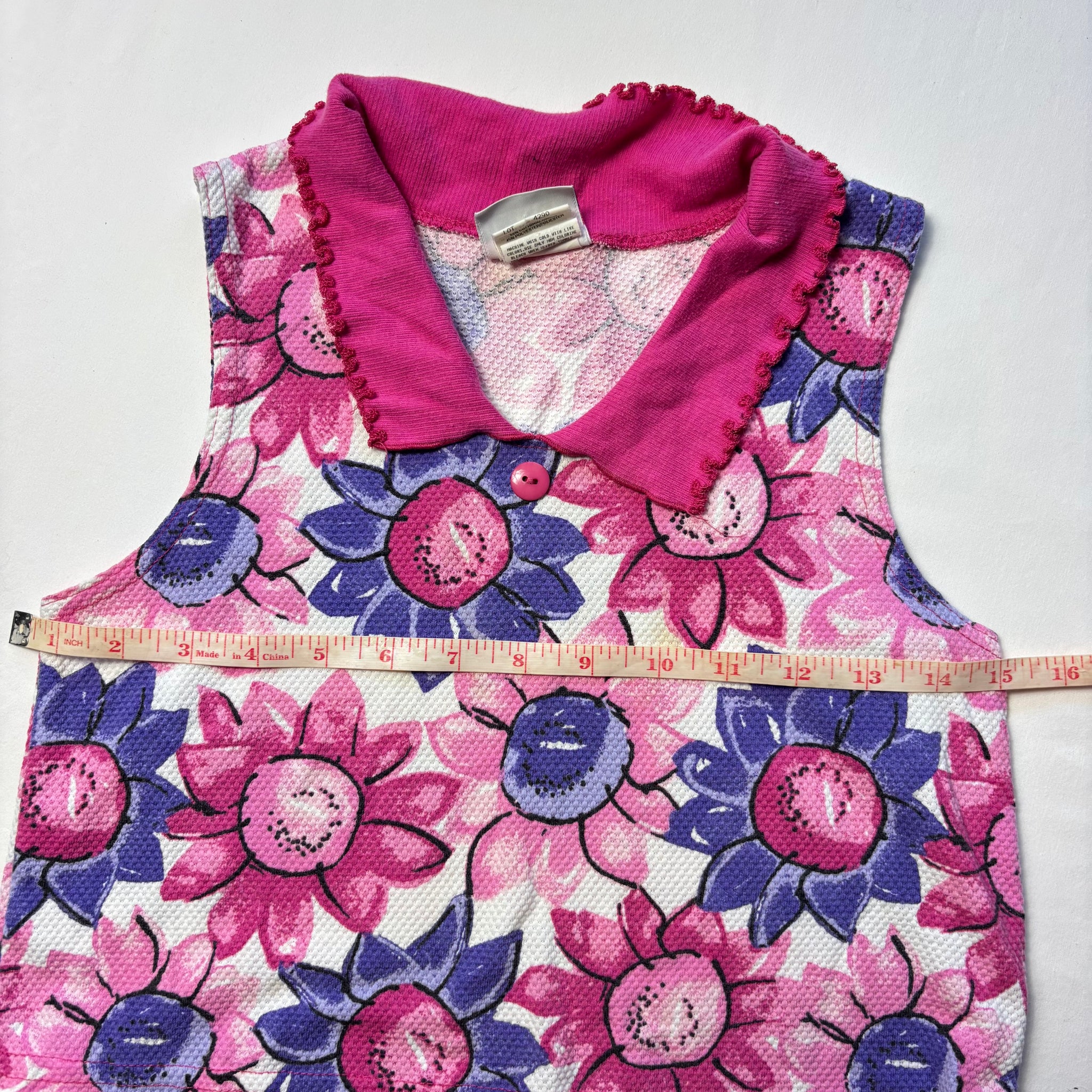 Vintage Basic Image pink and purple floral sleeveless shirt with shorter fit! Note a small light spot shown. Please see all photos for condition and measurements