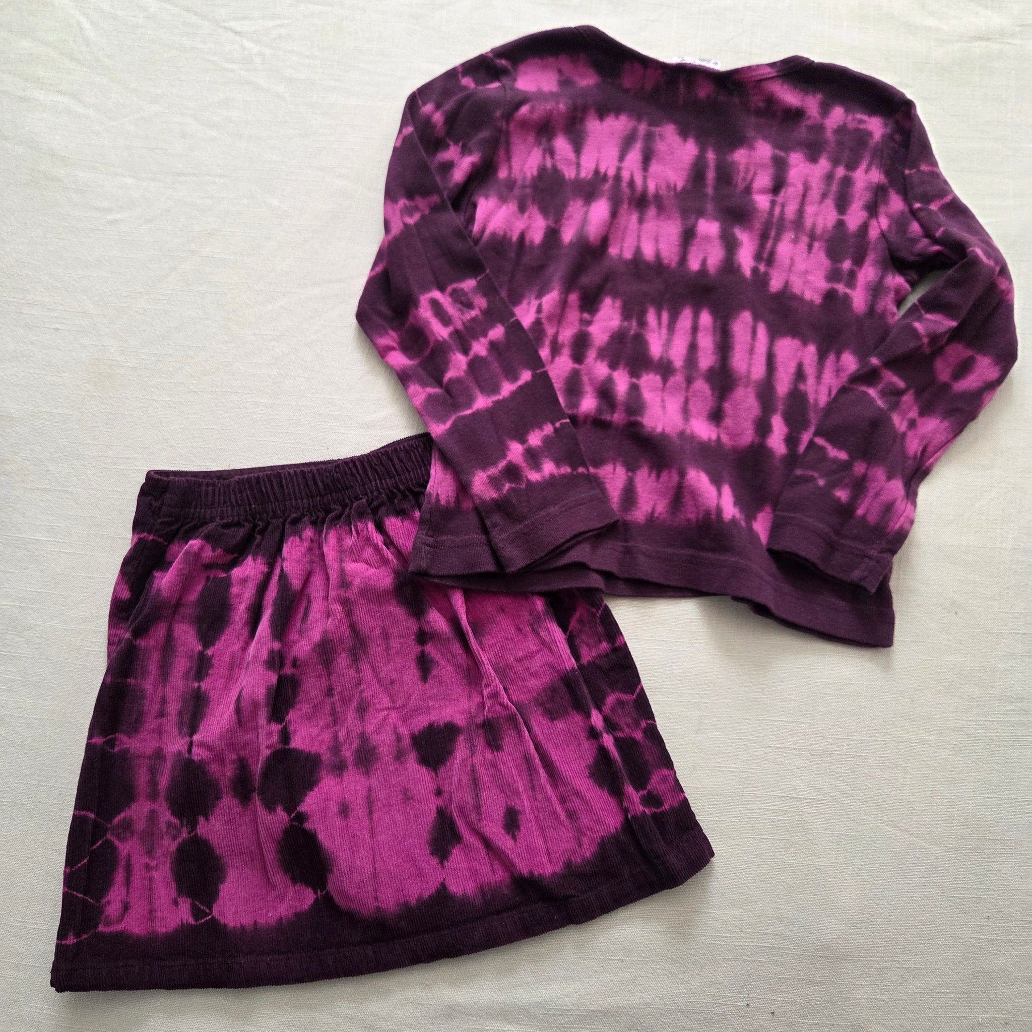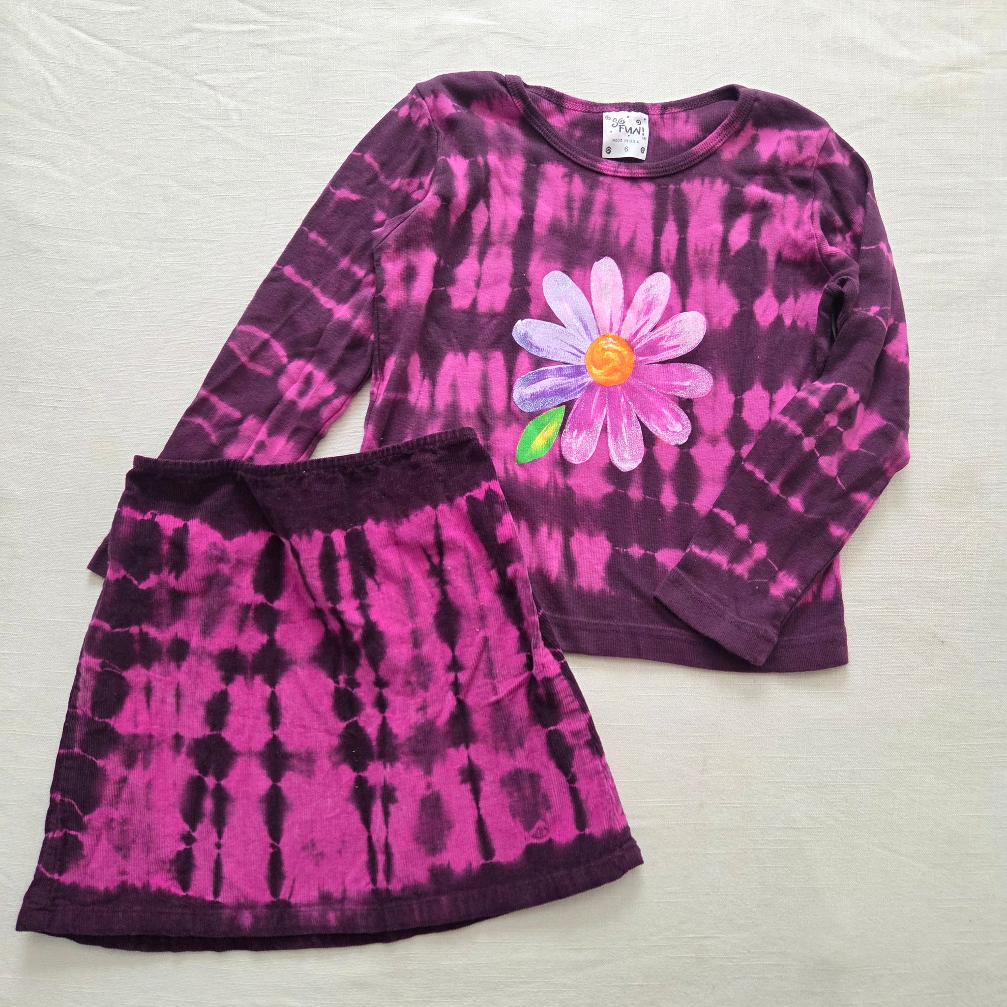 Vintage So Fun! brand purple tie-dye matching flower long sleeve shirt and skirt set! Skirt has nice stretchy elastic waist for flexible fit! Please see all photos for condition and measurements