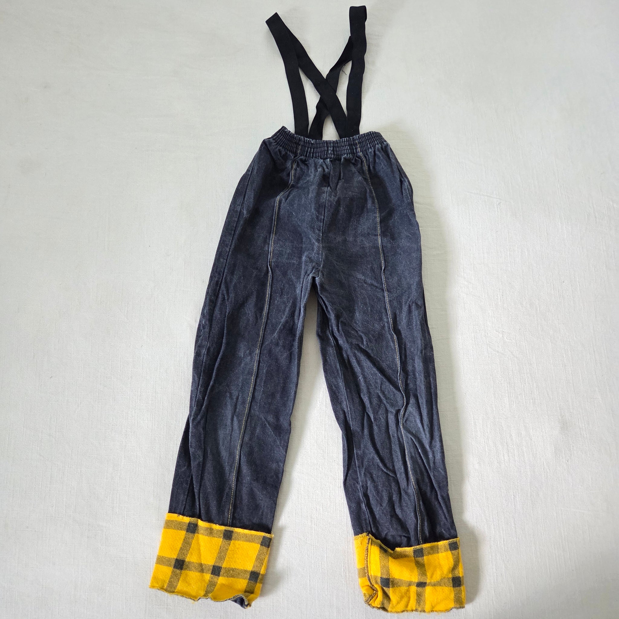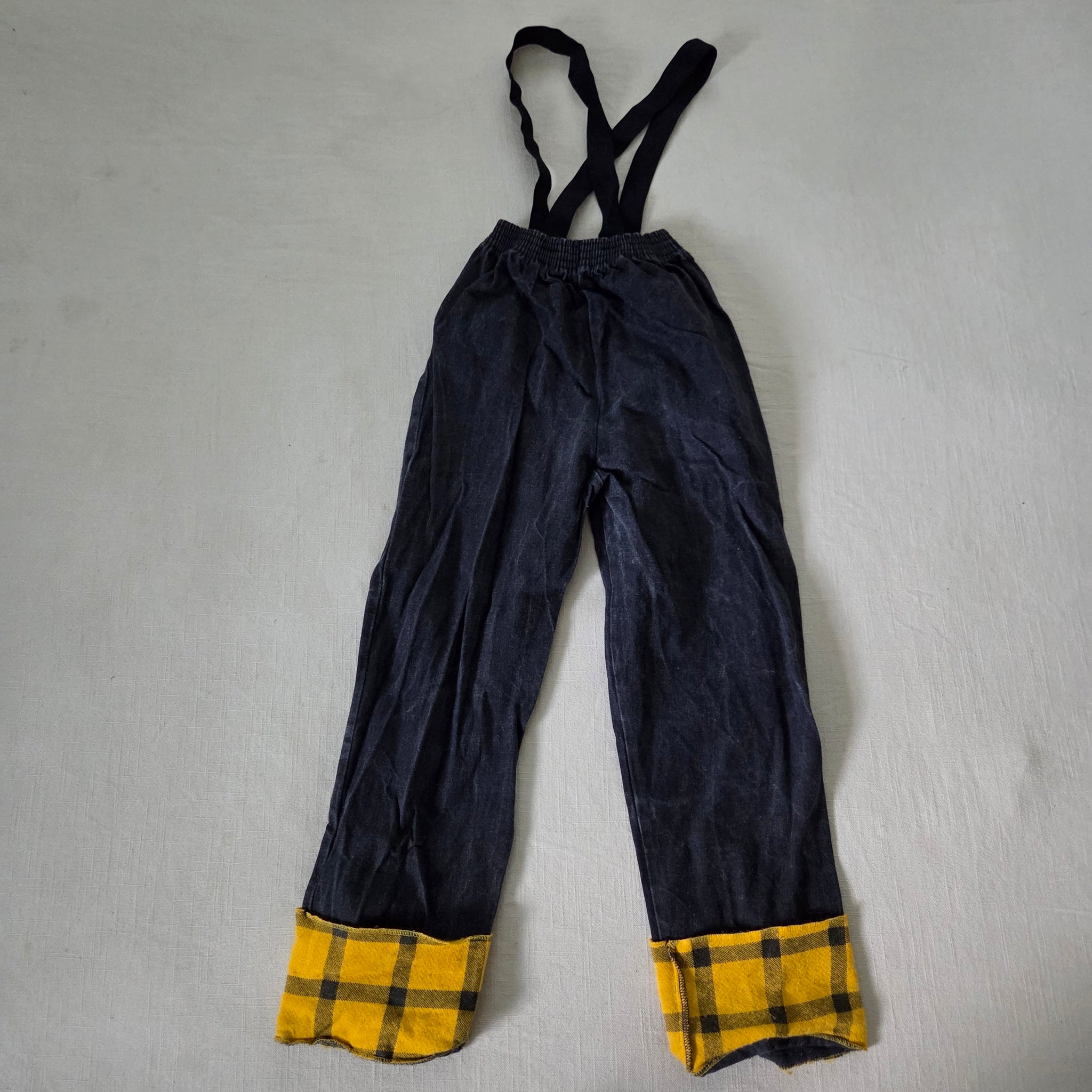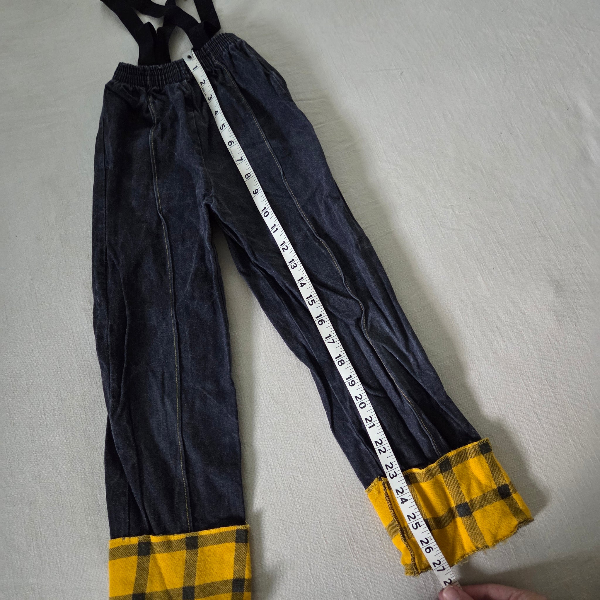 Vintage Pilgrim brand black suspender jeans with yellow plaid ankle cuffs and stretchy elastic waist! Please see all photos for condition and measurements