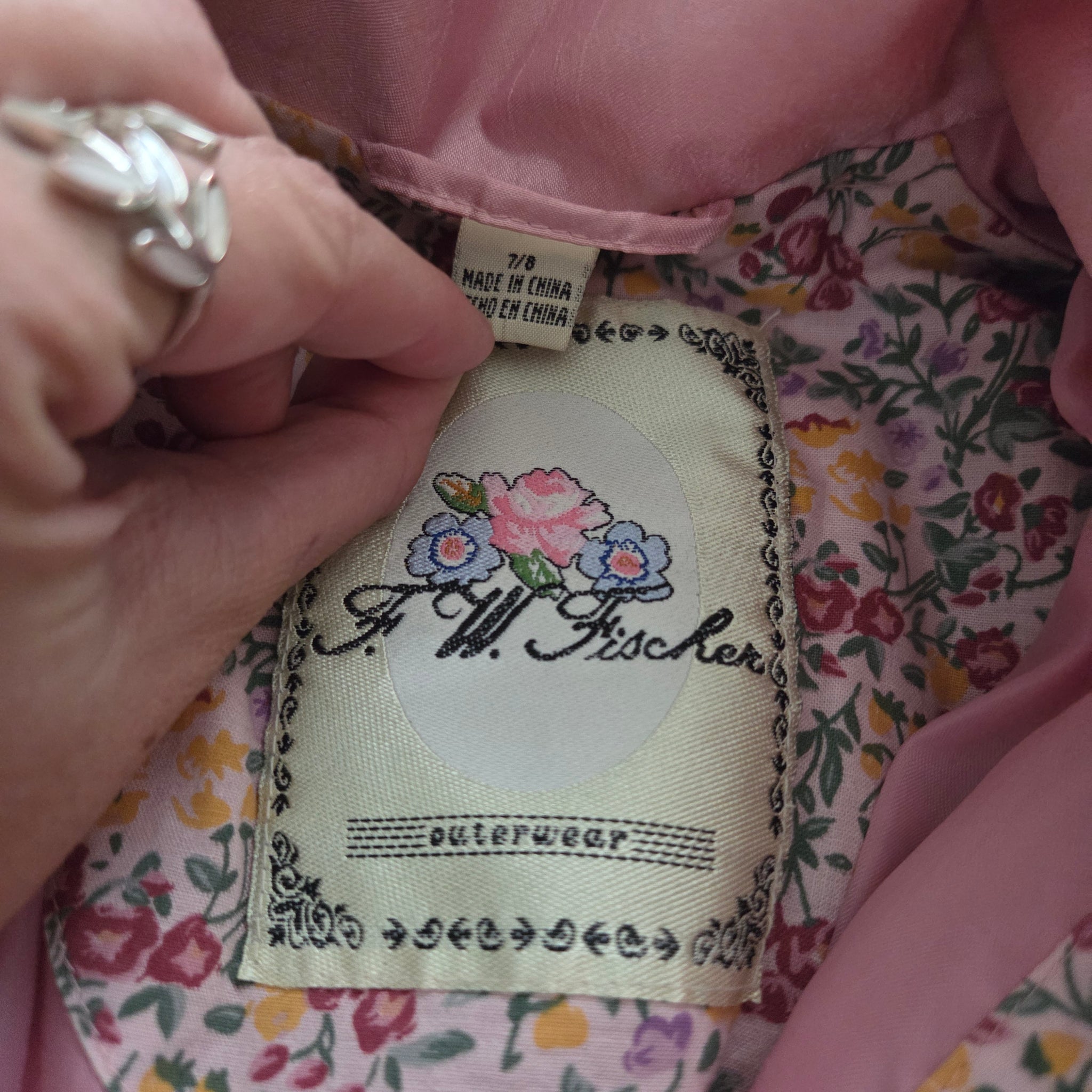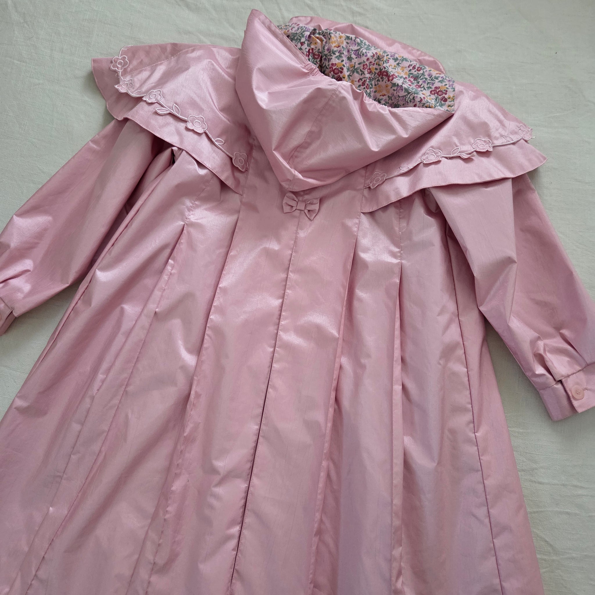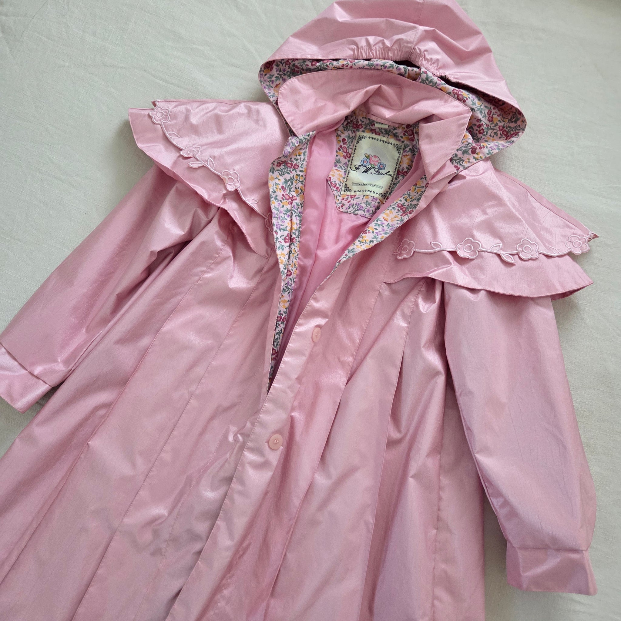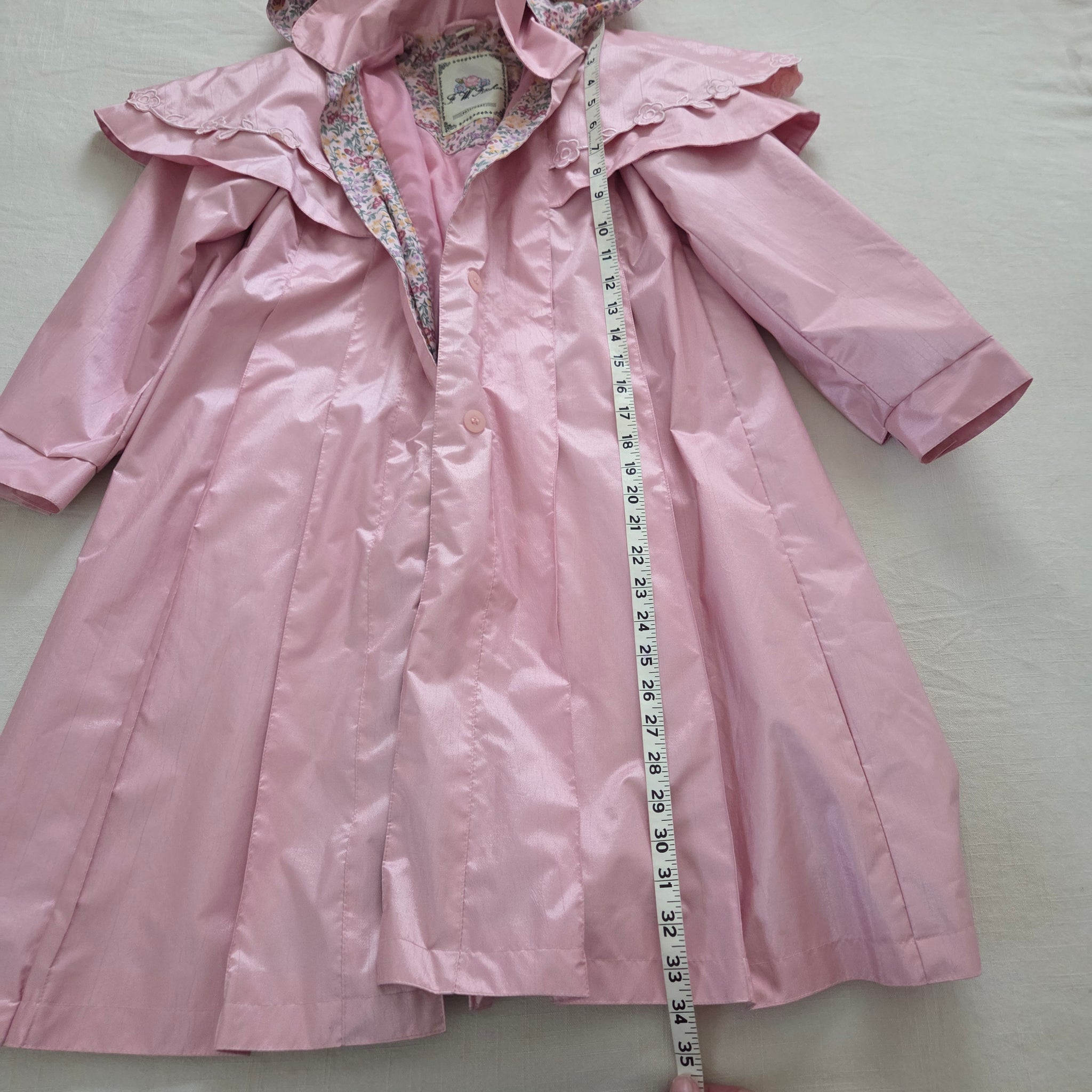 Vintage F.W. Fisher brand pink wind resistant long jacket/coat with flower details! Please see all photos for condition and measurements