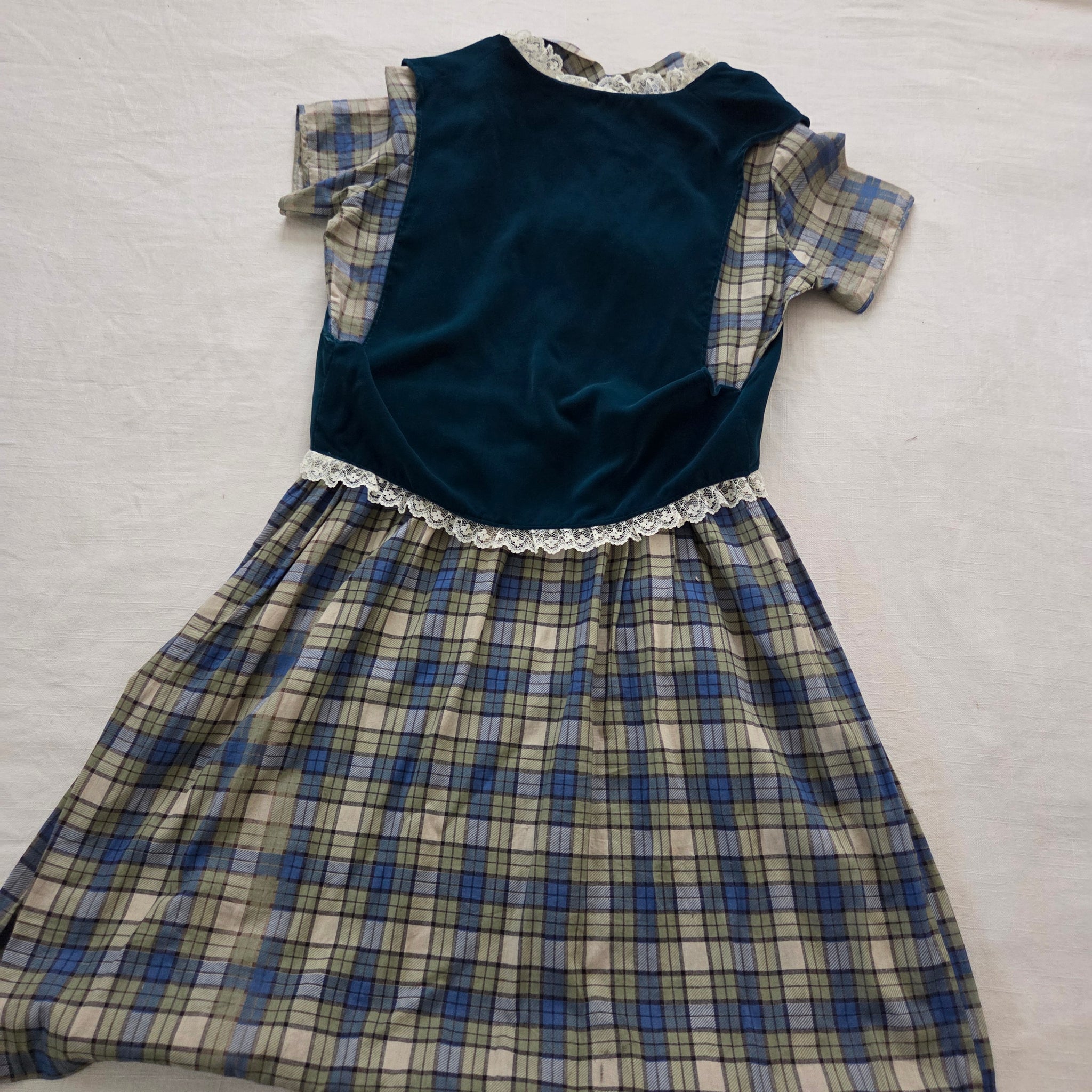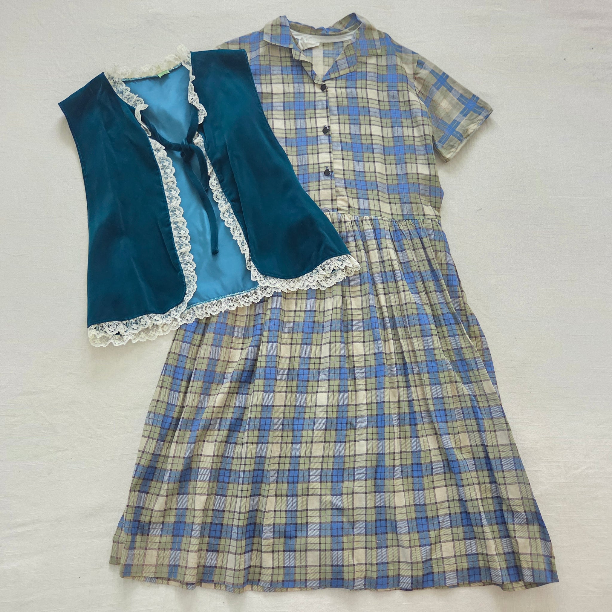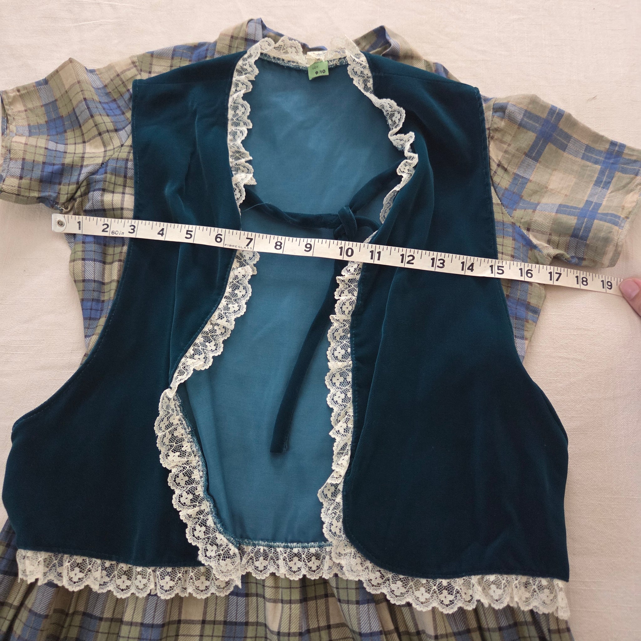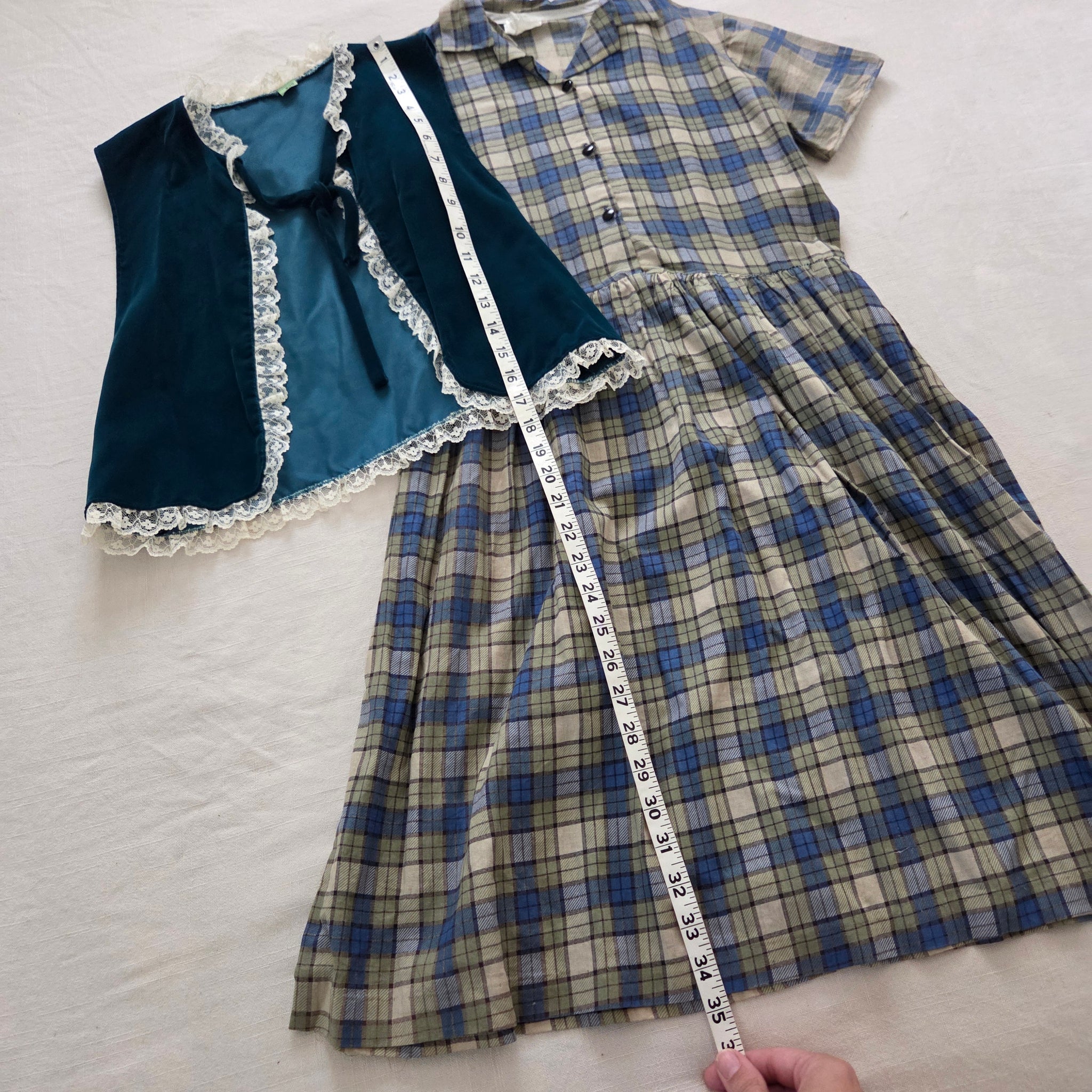 Vintage warm plaid dress and blue velvet vest bundle that go so well together! Please see all photos for condition and measurements