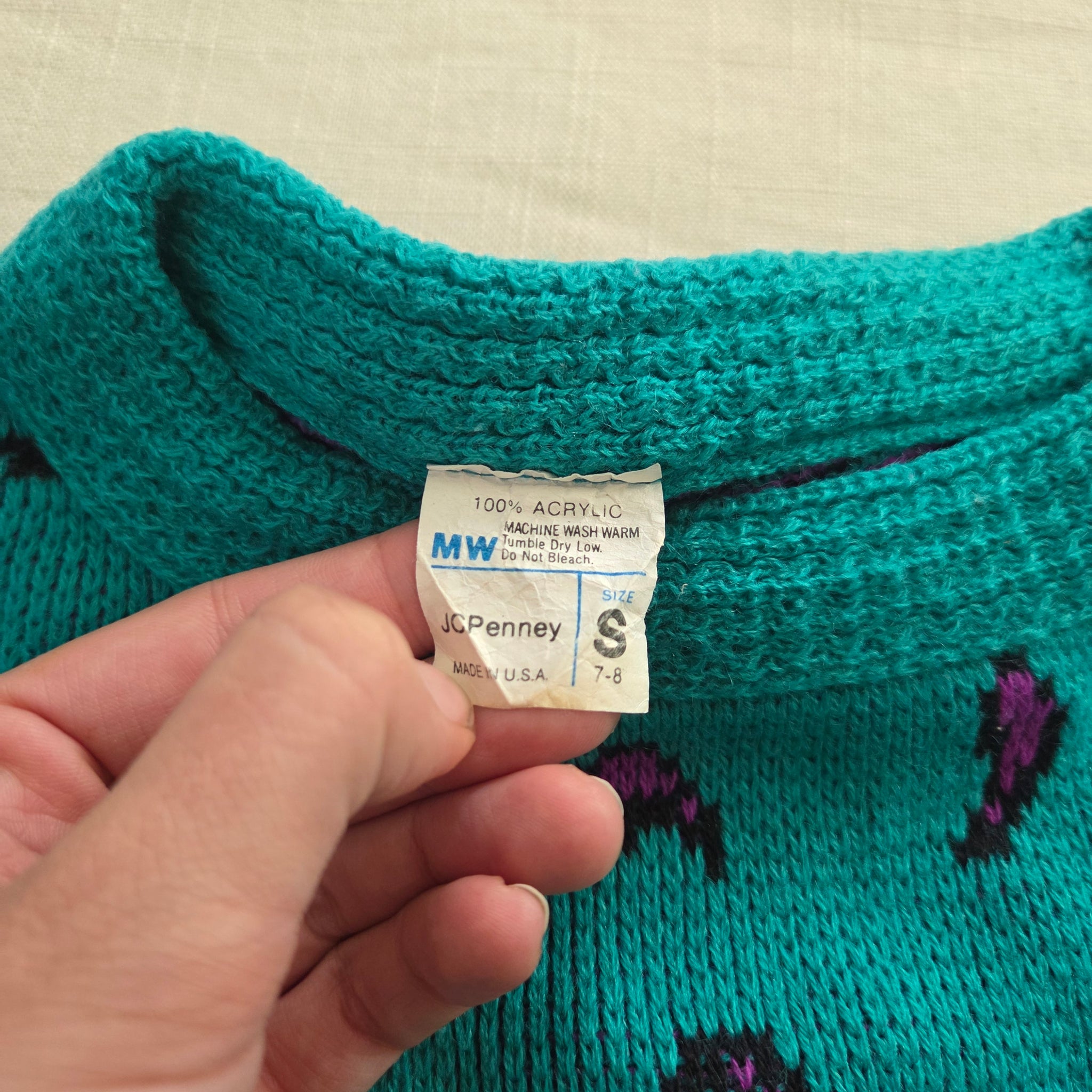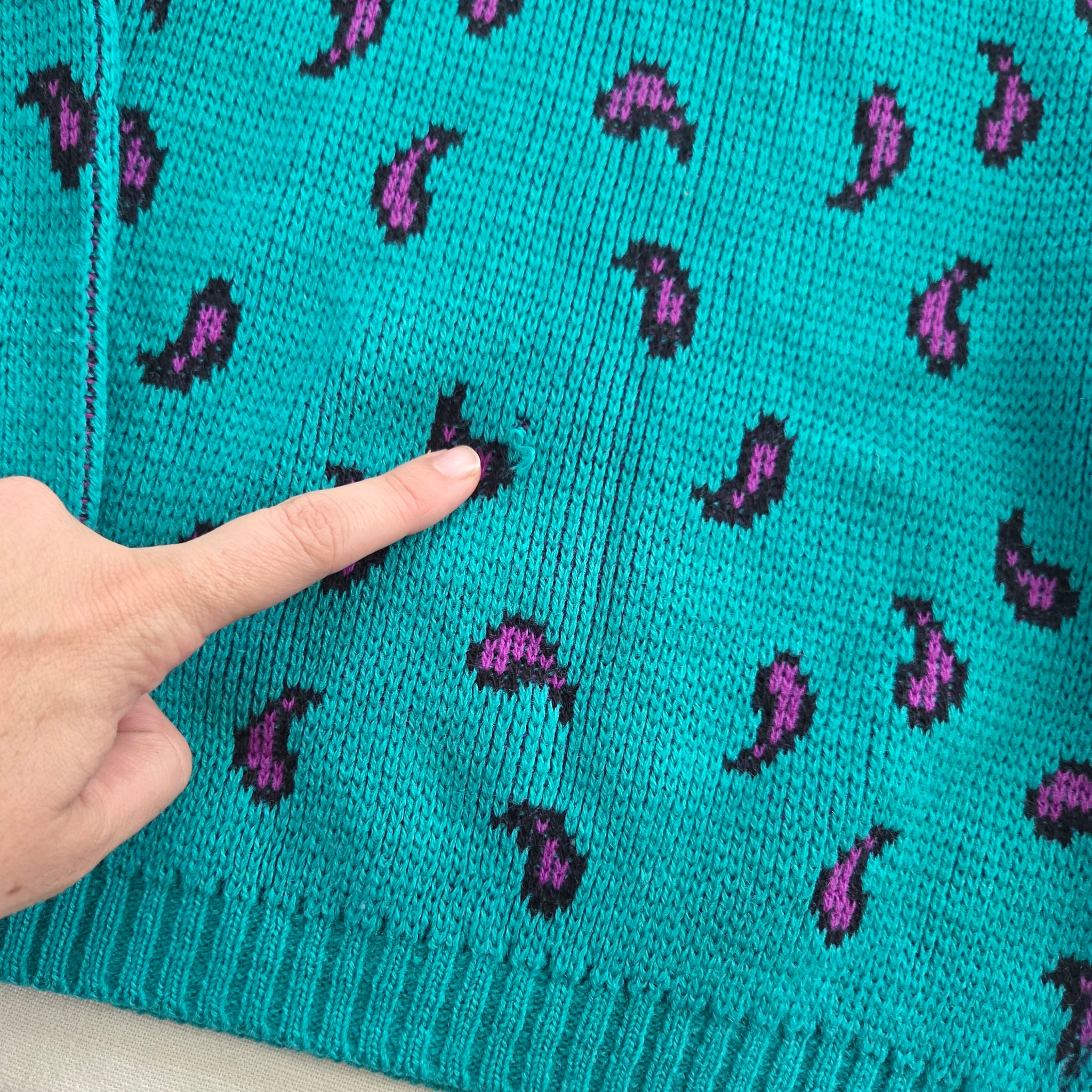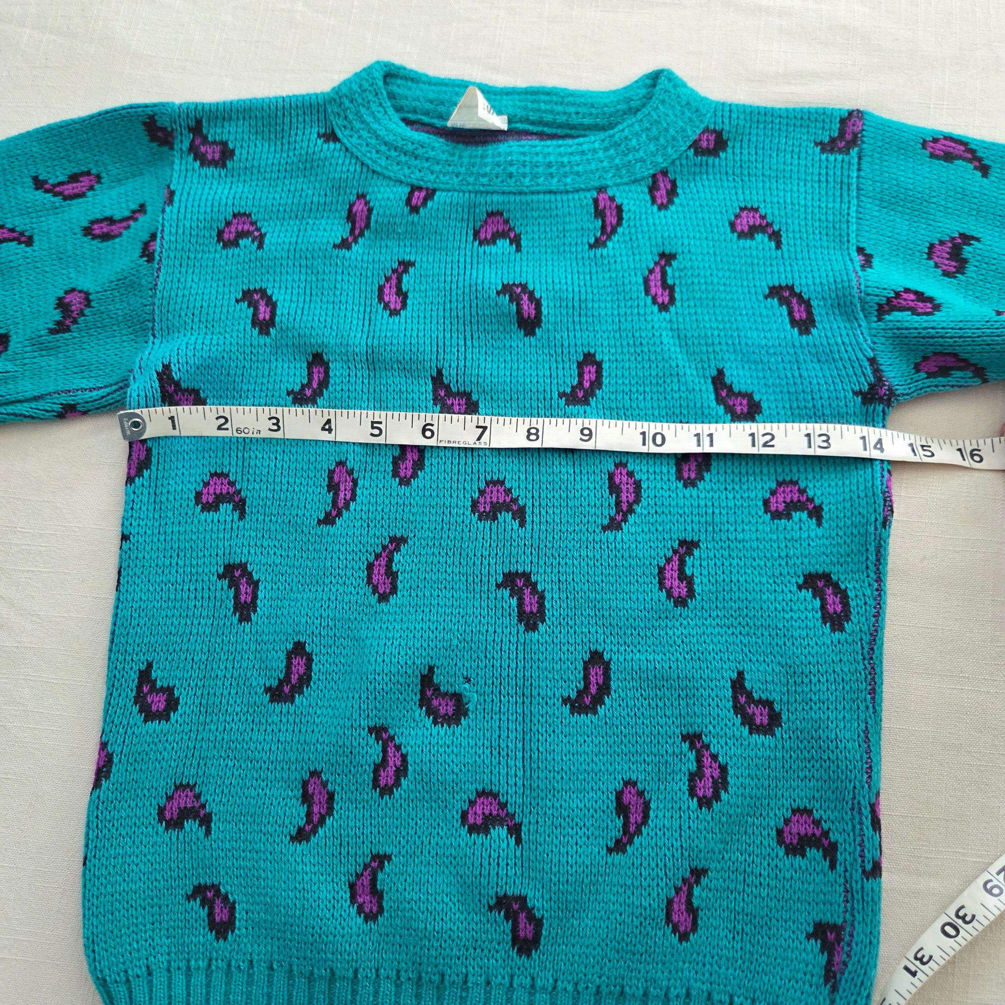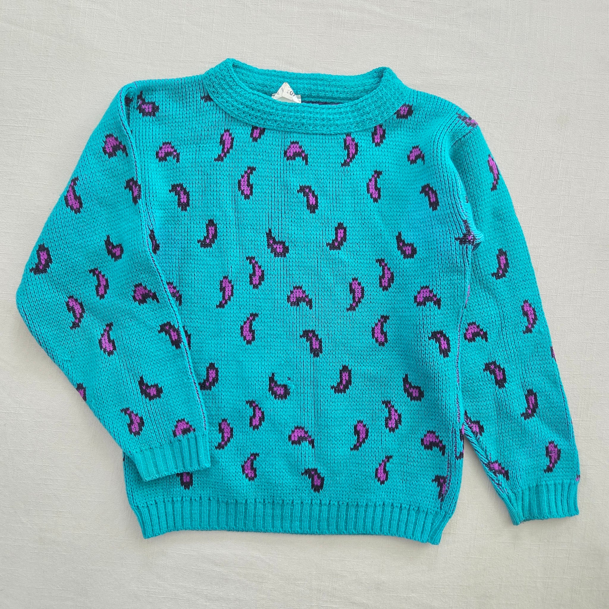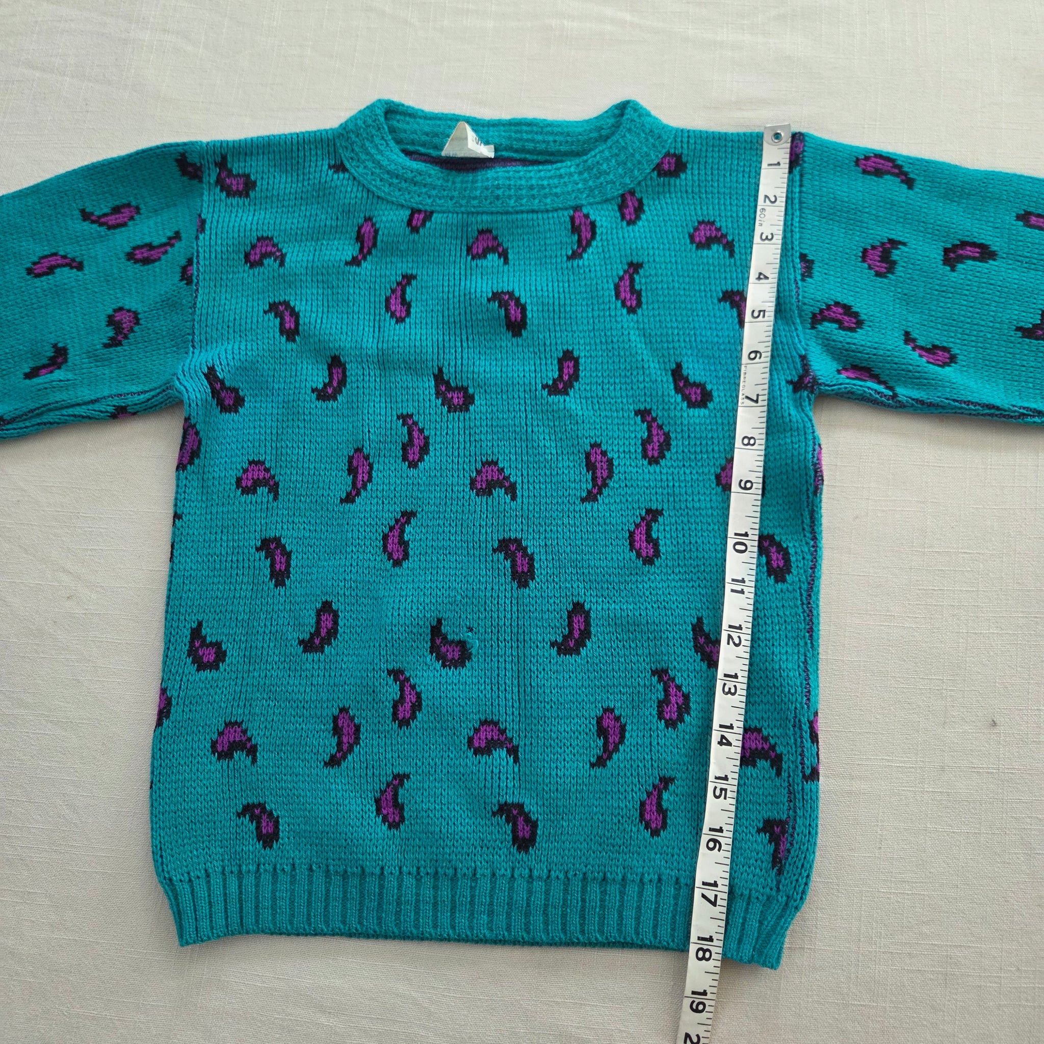Vintage JcPenney turquoise and purple paisley pattern knit sweater! Note one very small hole on belly shown. Please see all photos for condition and measurements