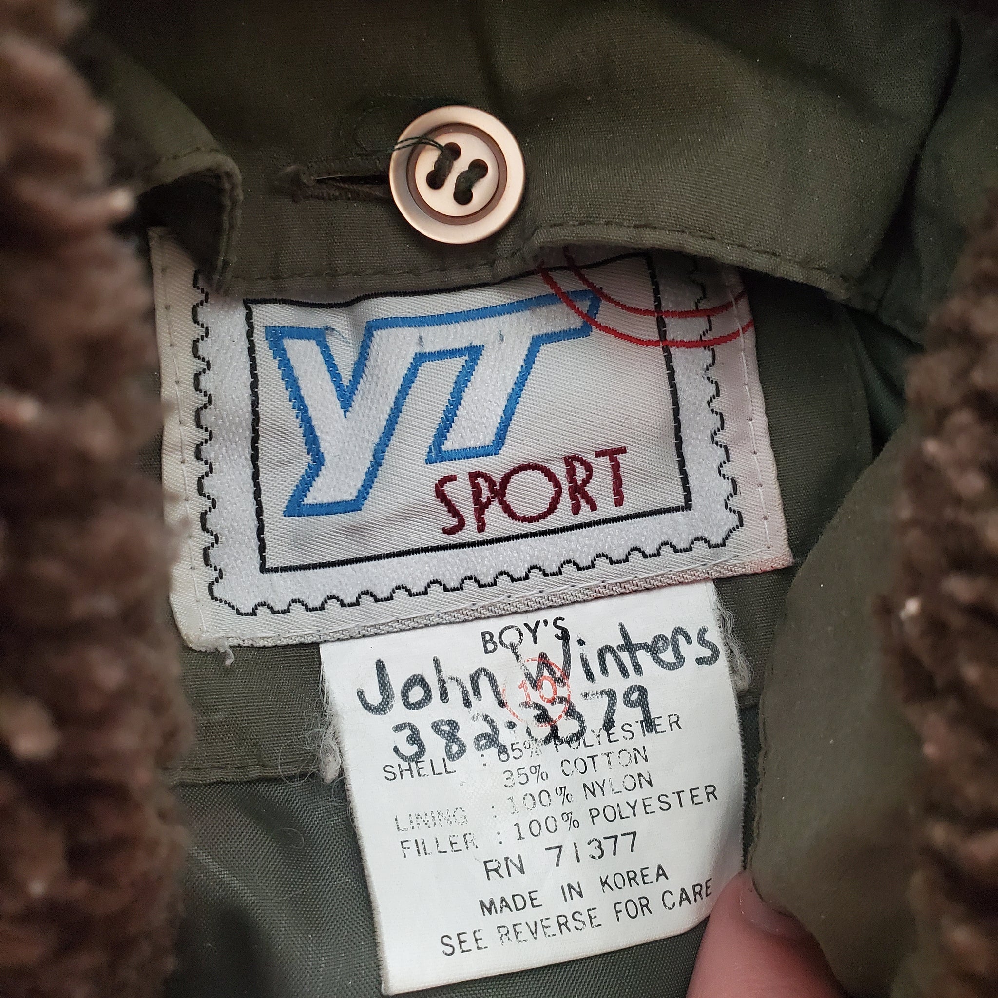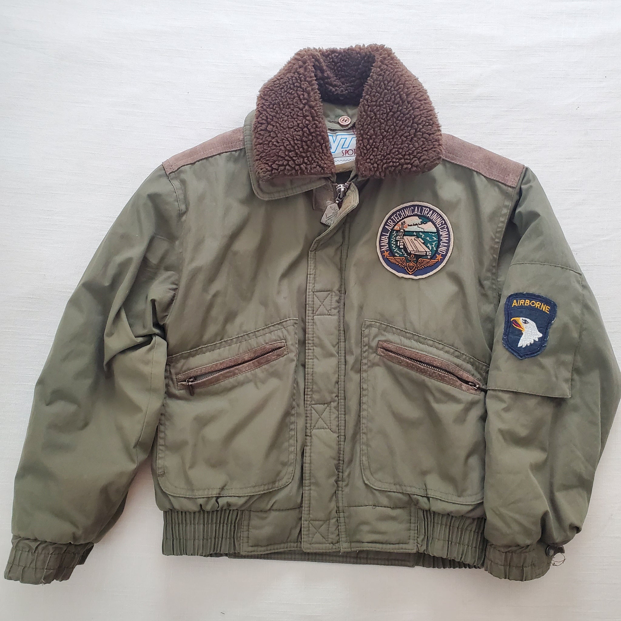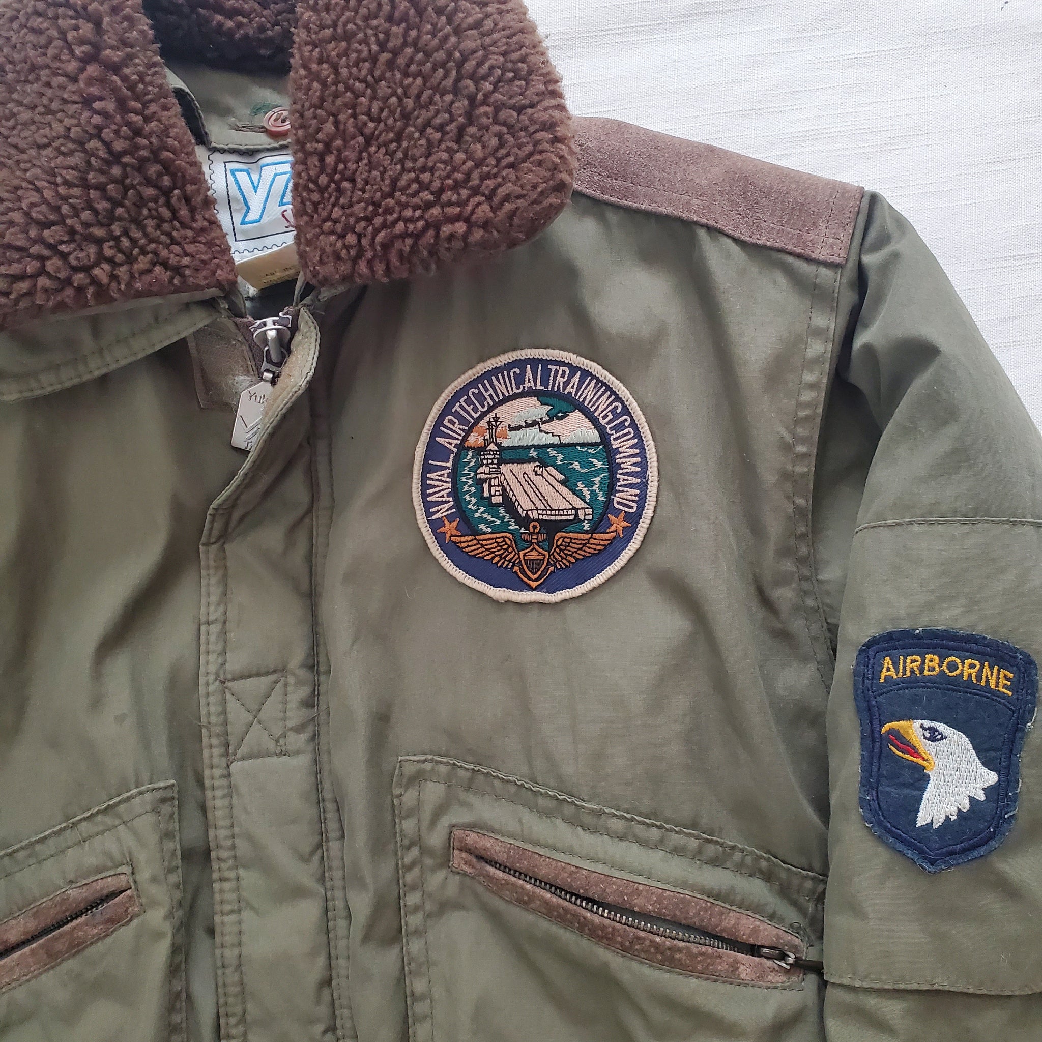 Vintage YT Sport brand army green coat with naval air technical training command patch on chest and "airborne" patch on sleeve! Please see all photos for condition and measurements