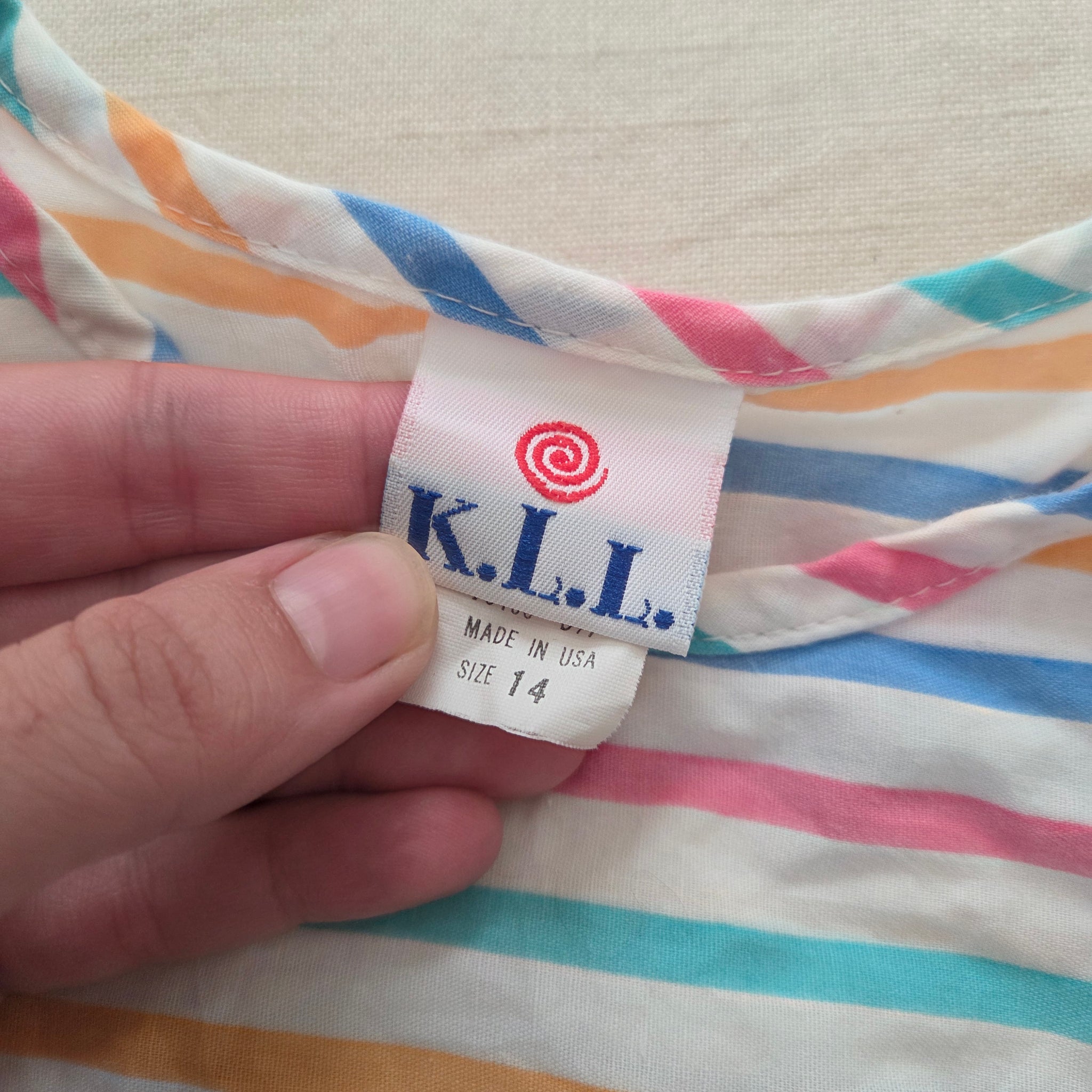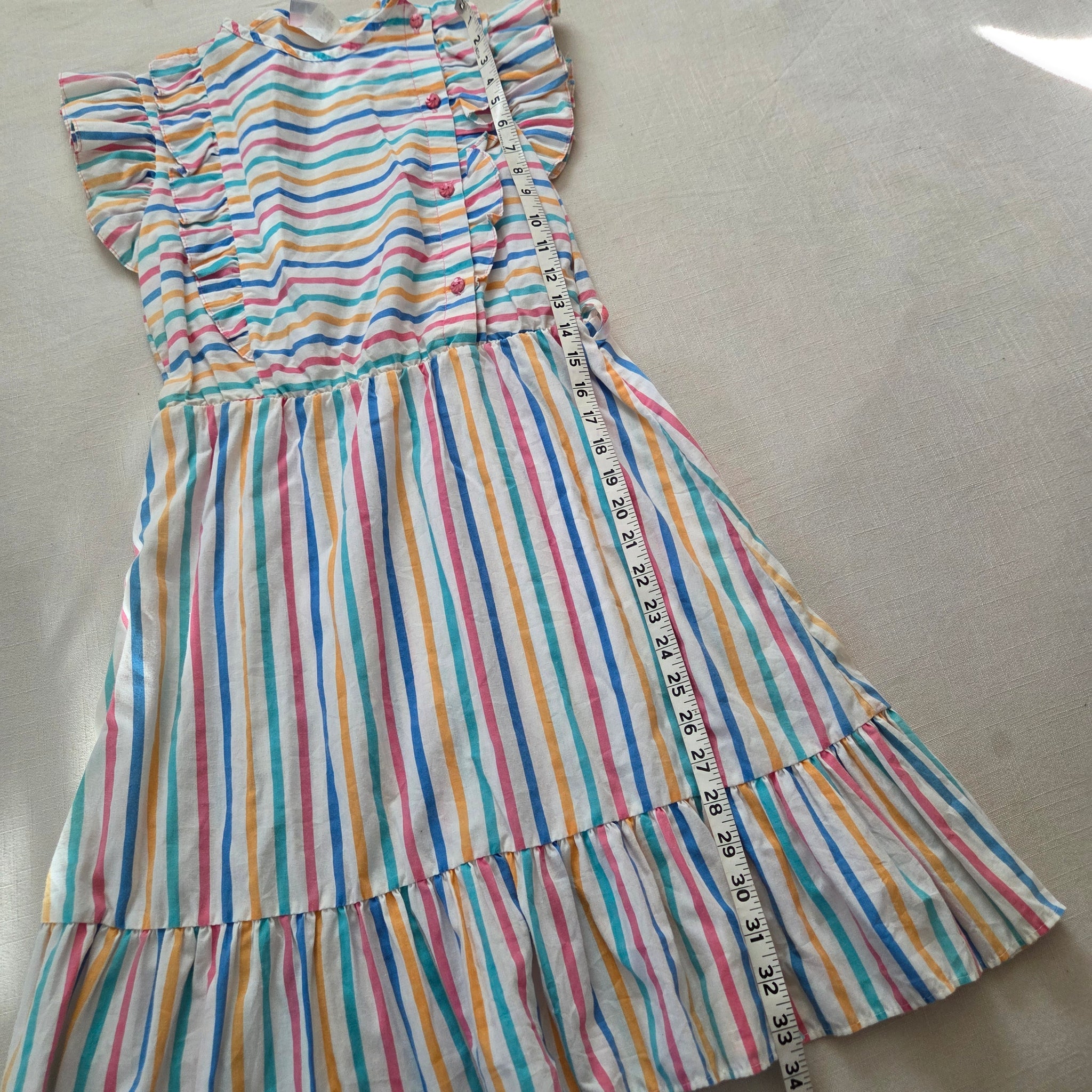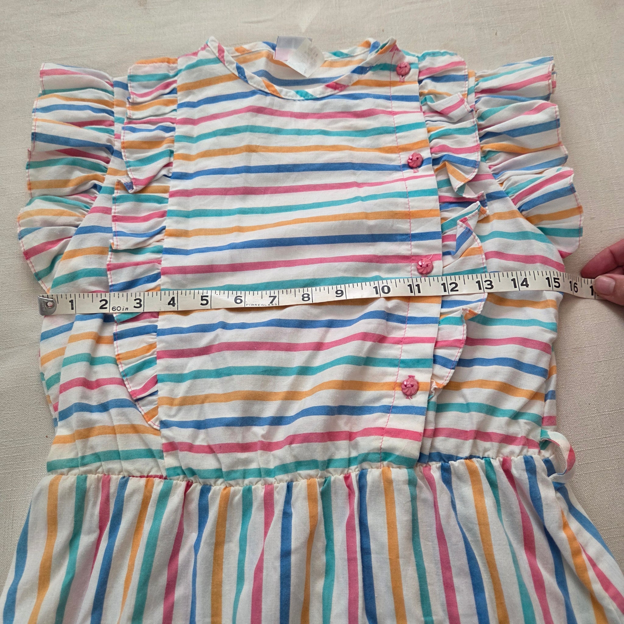 Vintage KLL brand multicolored striped dress with cute ruffled details on chest and sleeves! Please see all photos for condition and measurements
