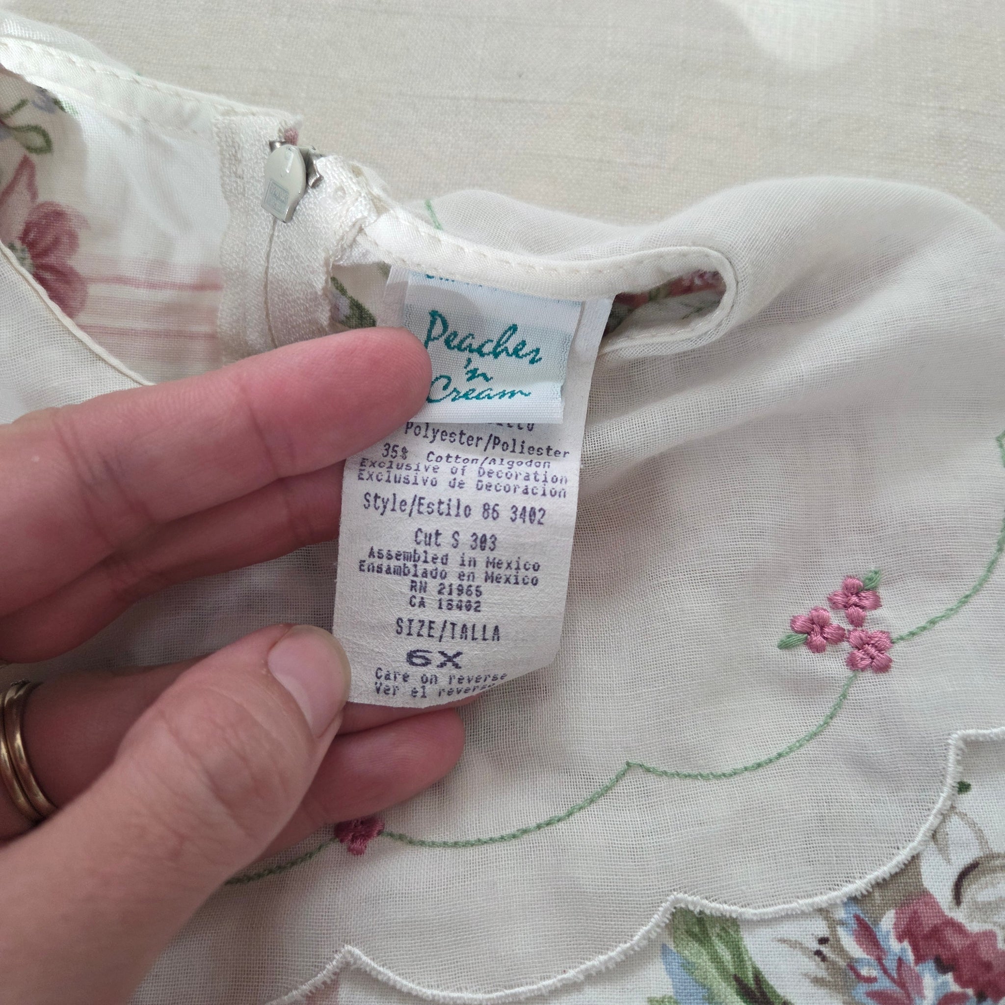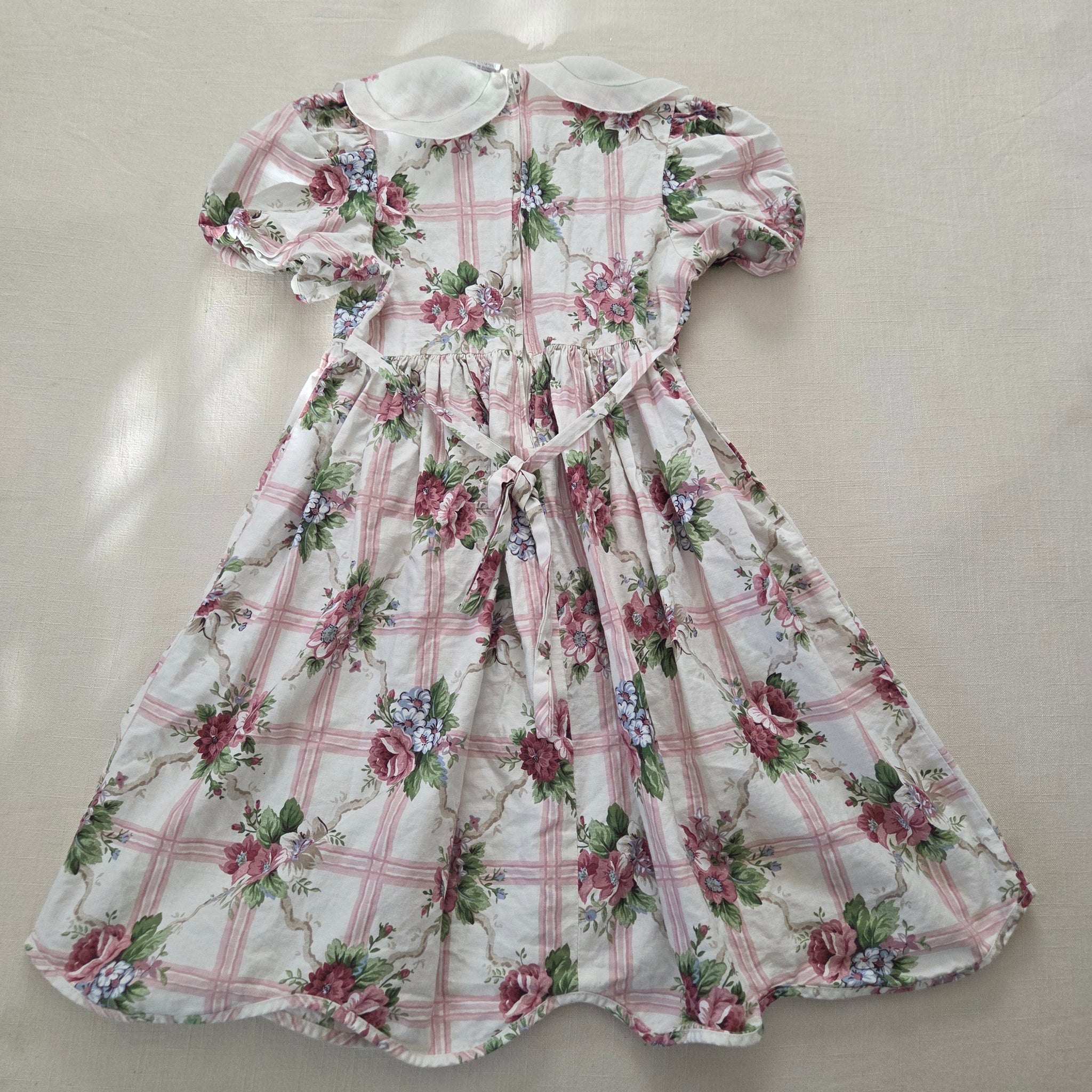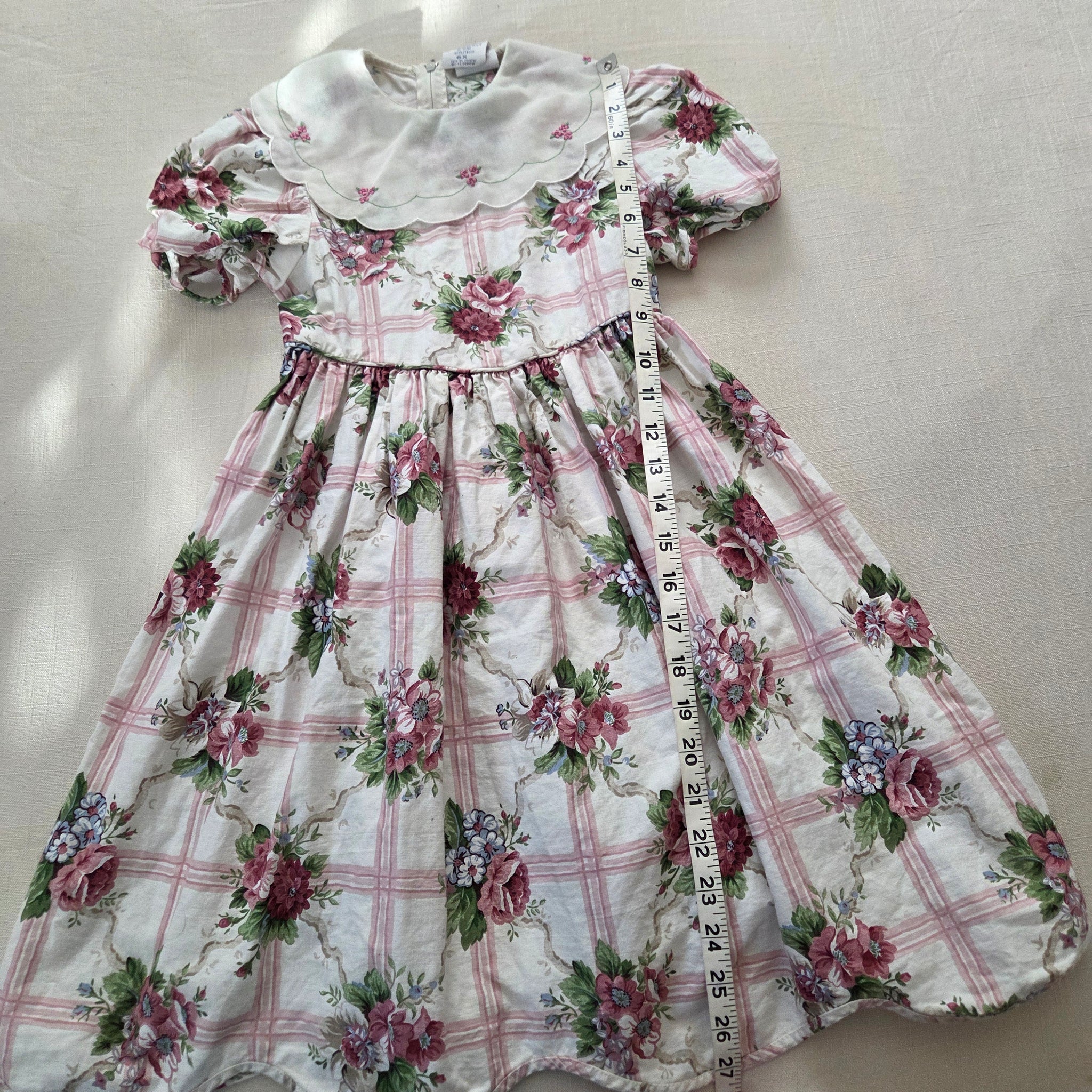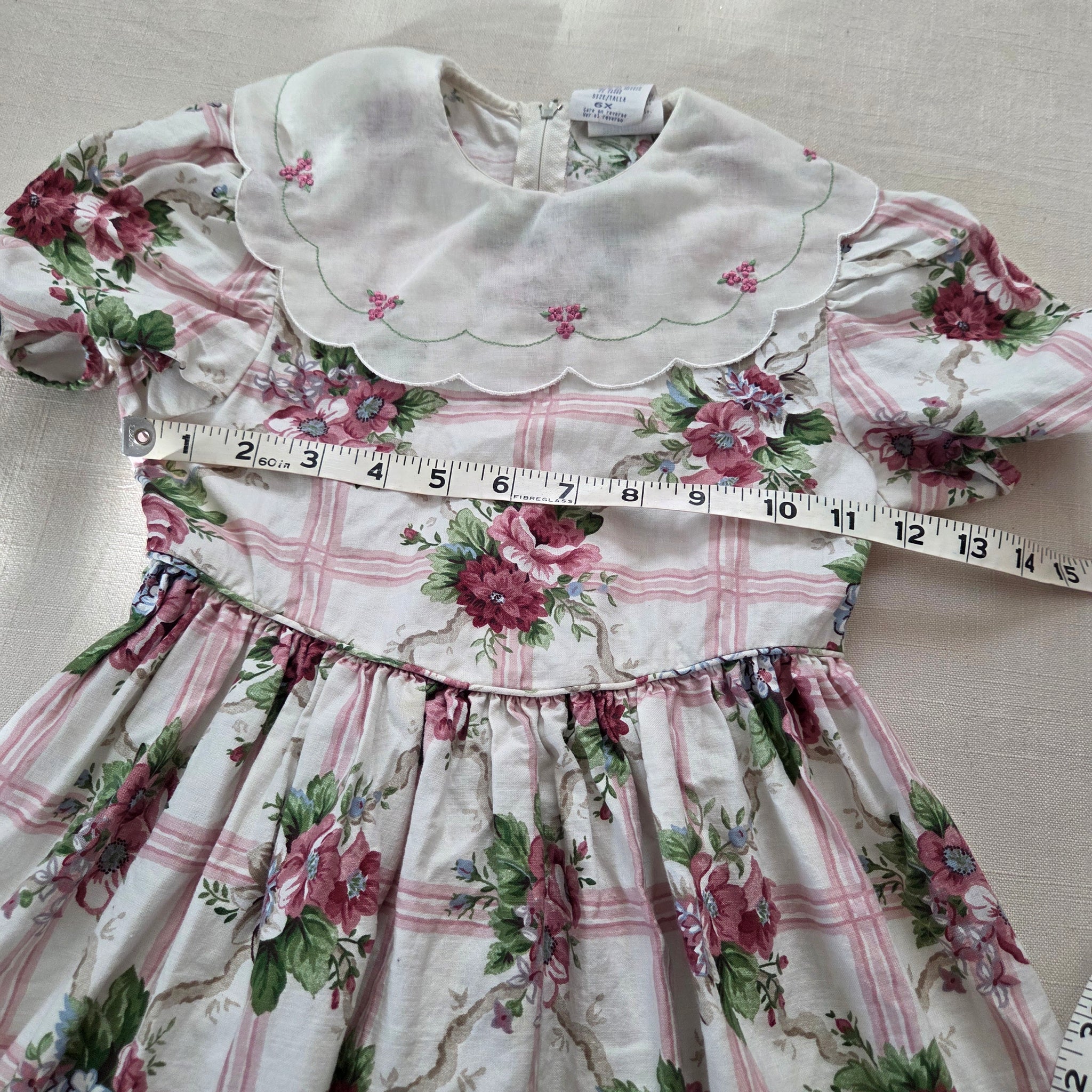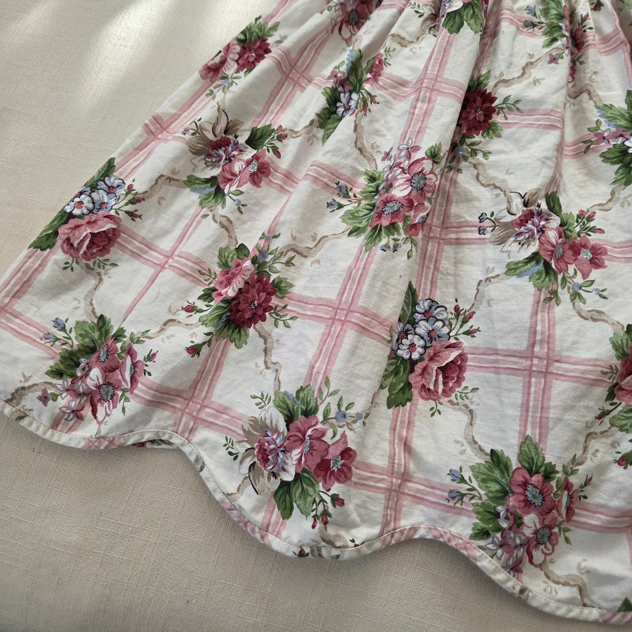 Vintage Peaches N Cream brand pink and cream grid/plaid floral dress with embroidered bib and scalloped trim! Please see all photos for condition and measurements