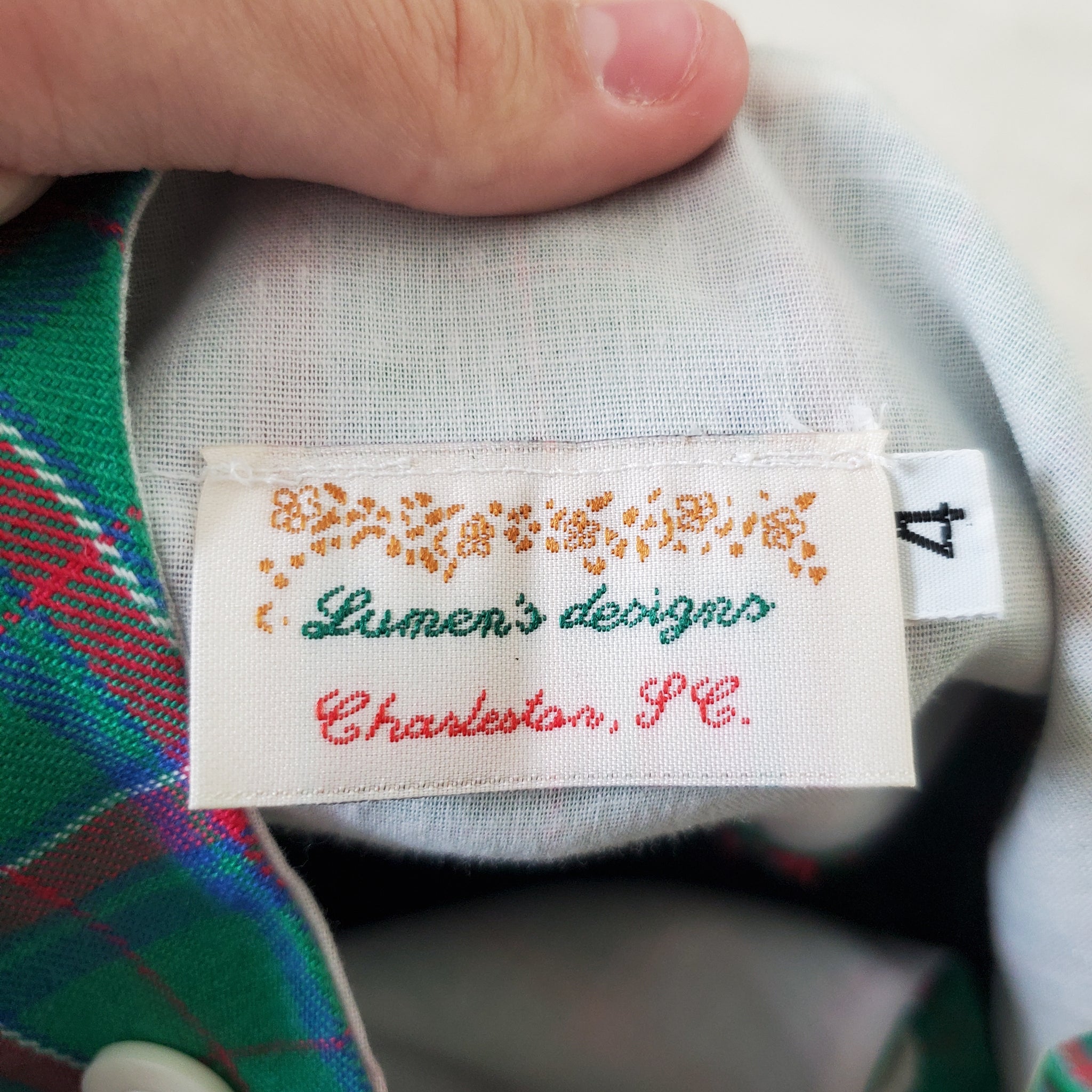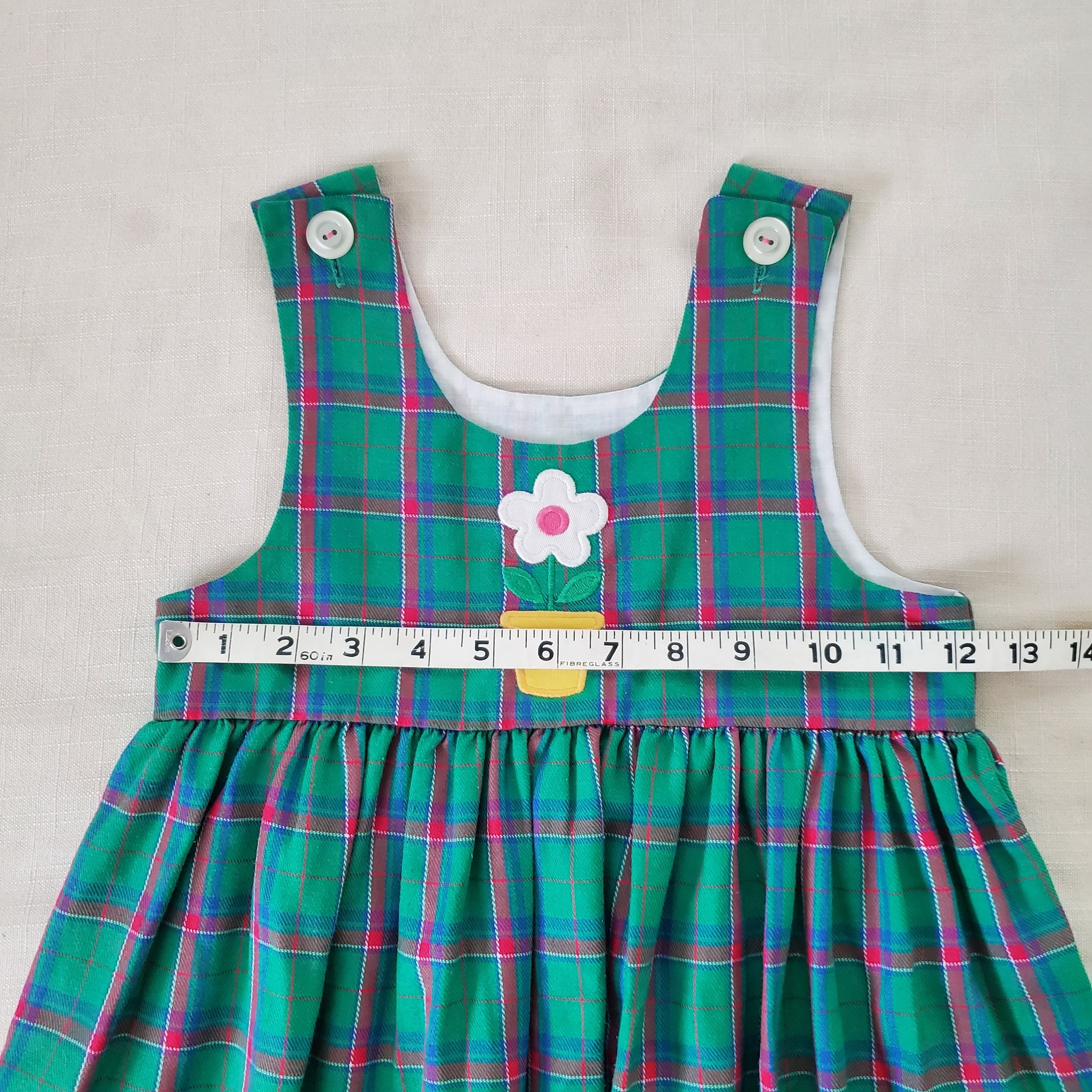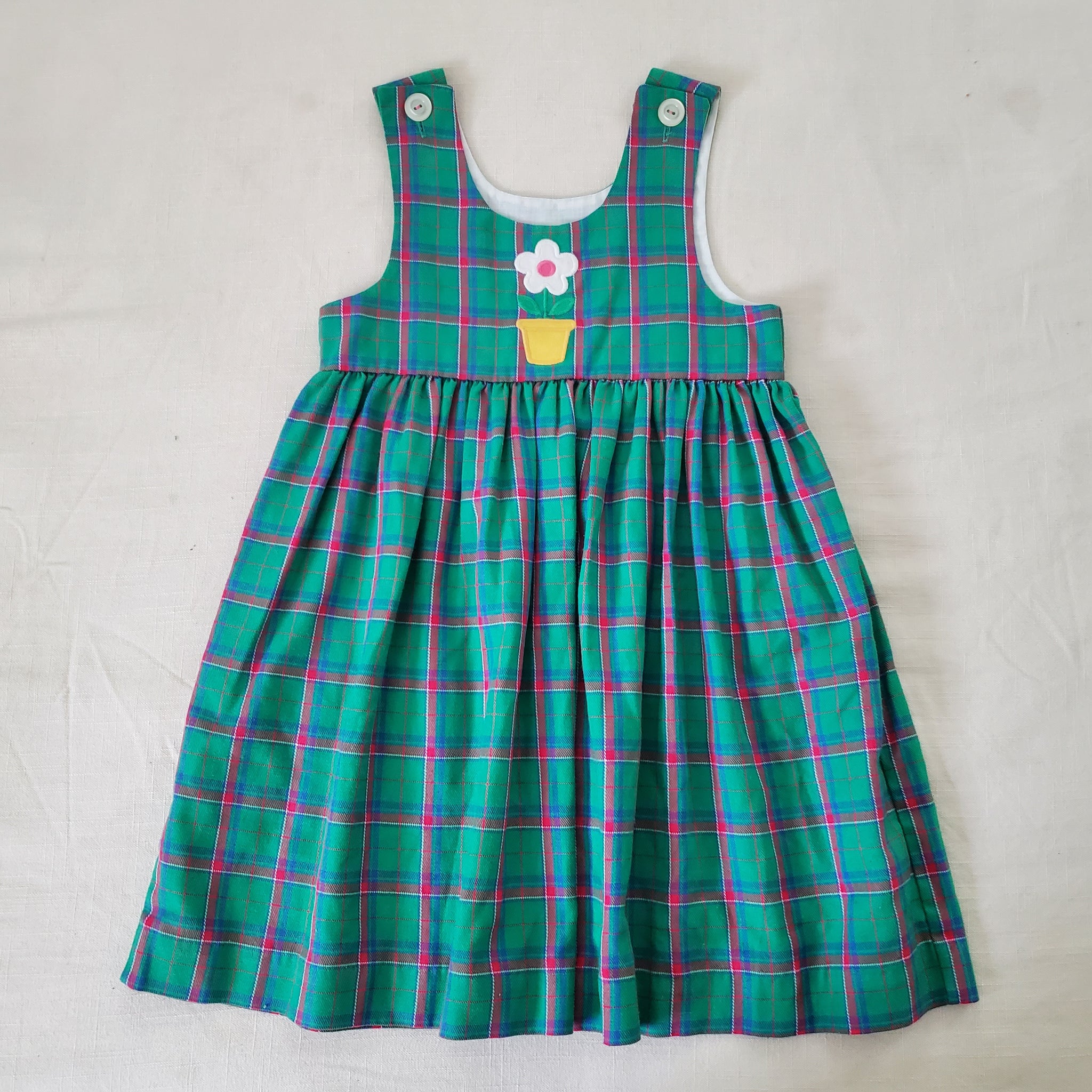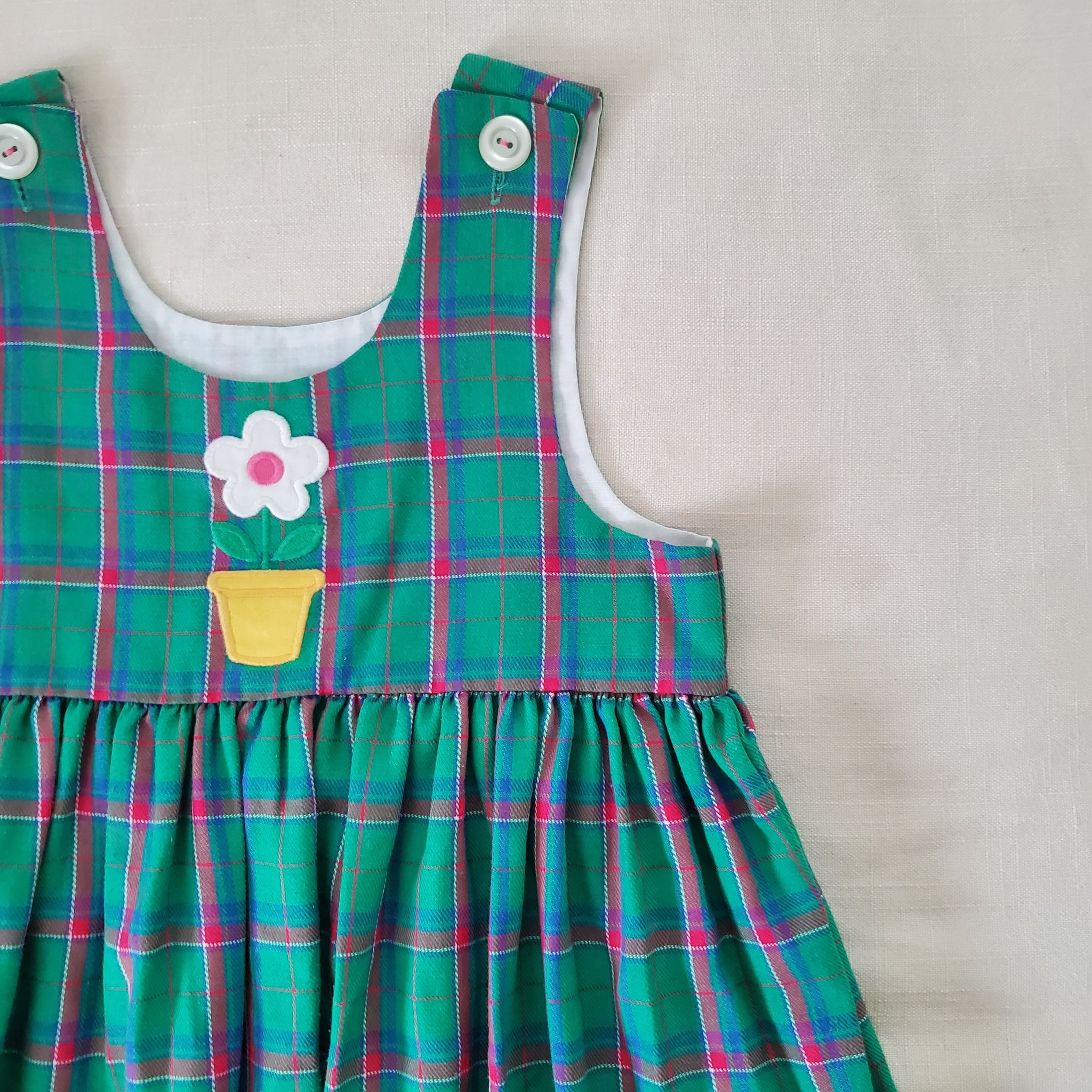 Vintage Lumen's Designs brand green and pink plaid sleeveless dress with flower in pot applique on chest! Cute layered over shirt or as is! Please see all photos for condition and measurements