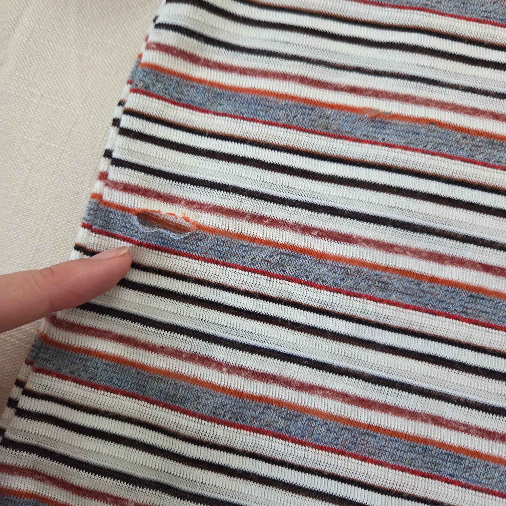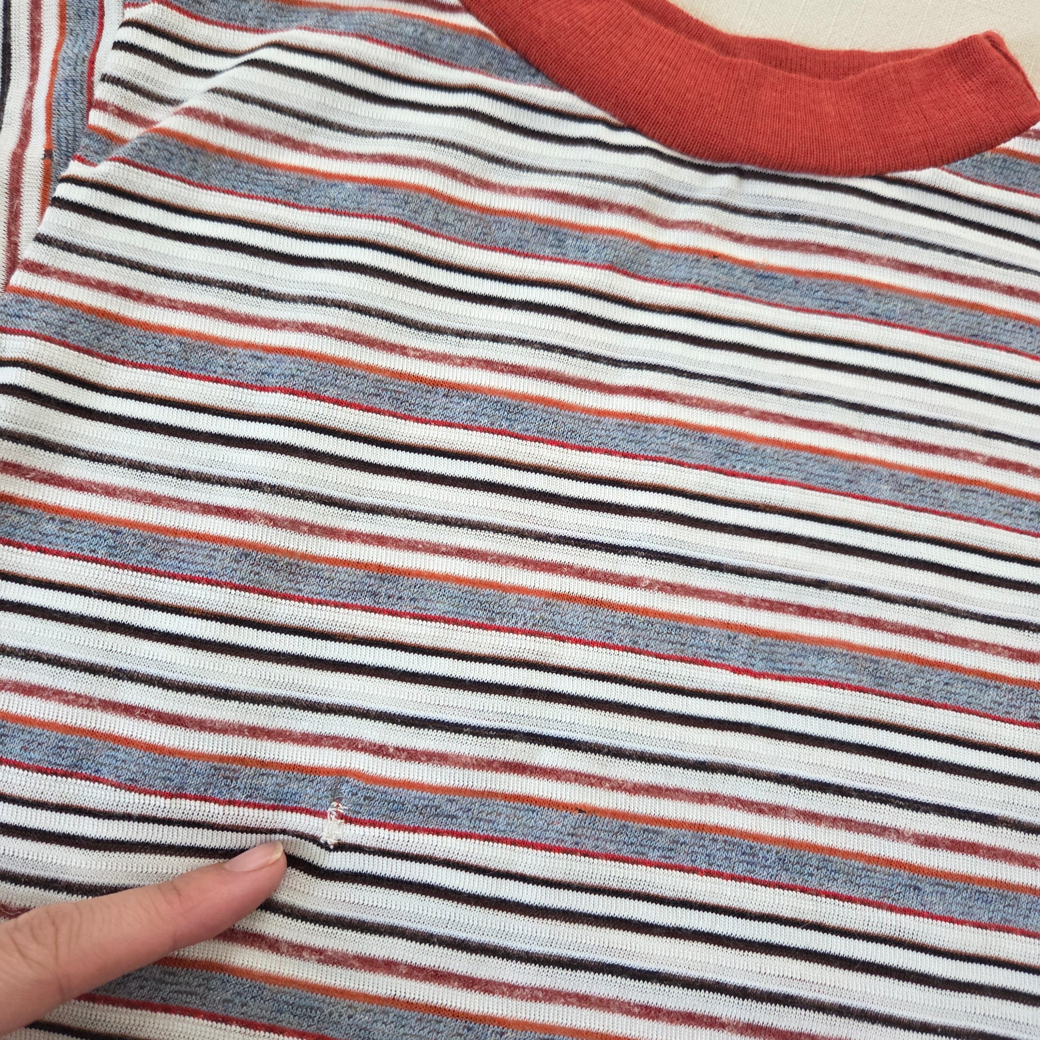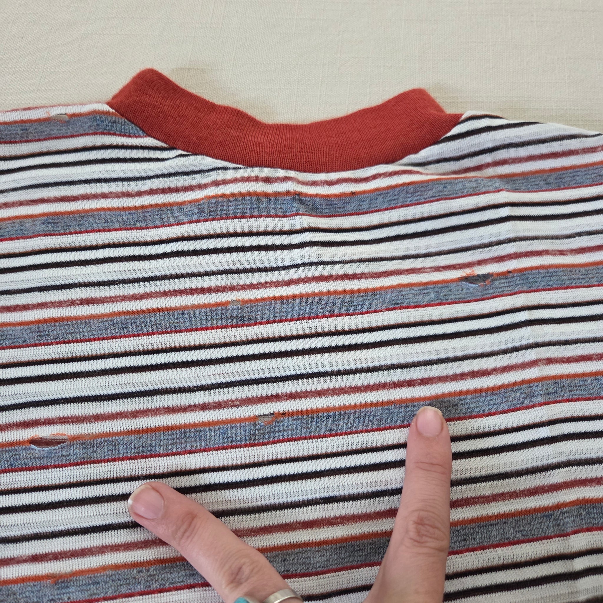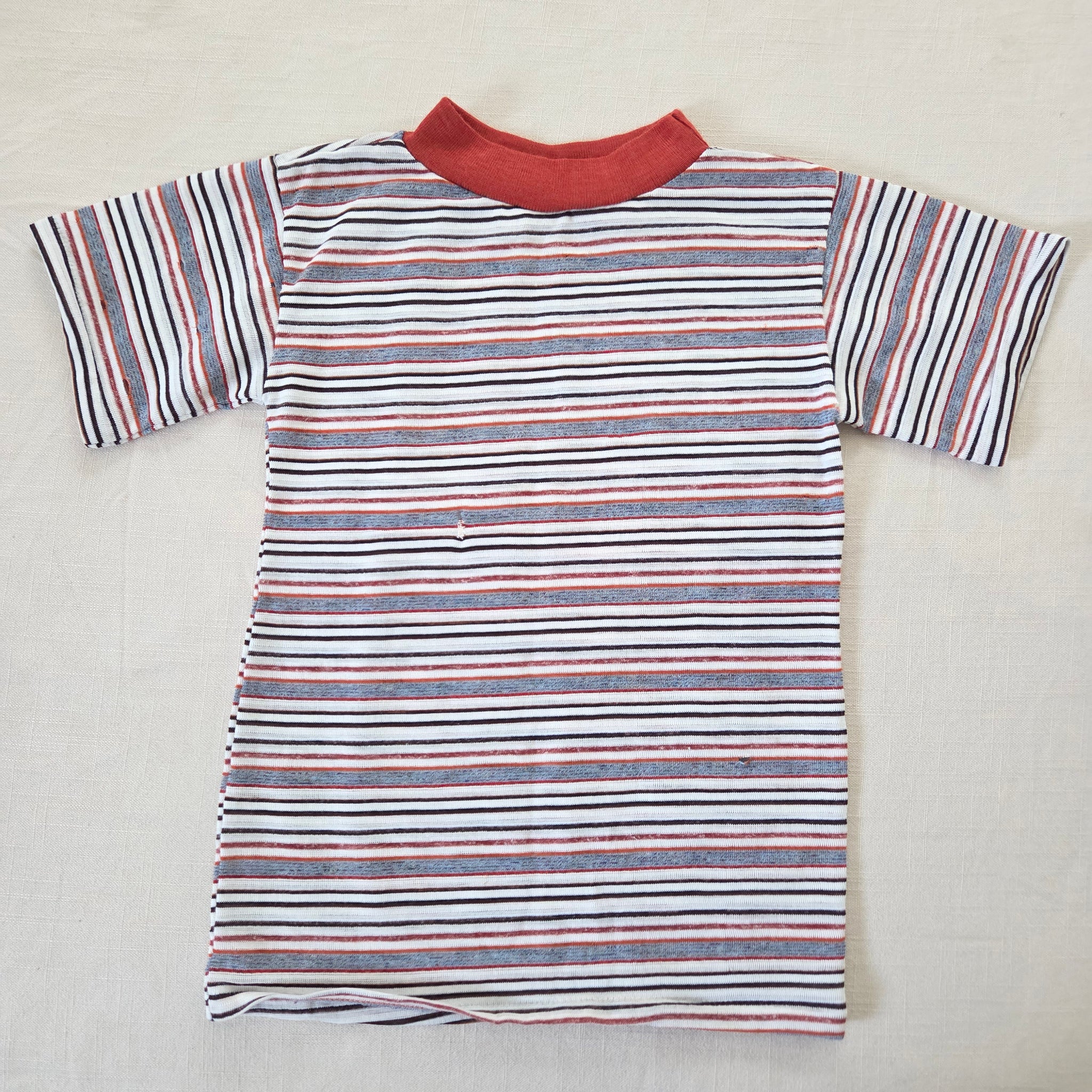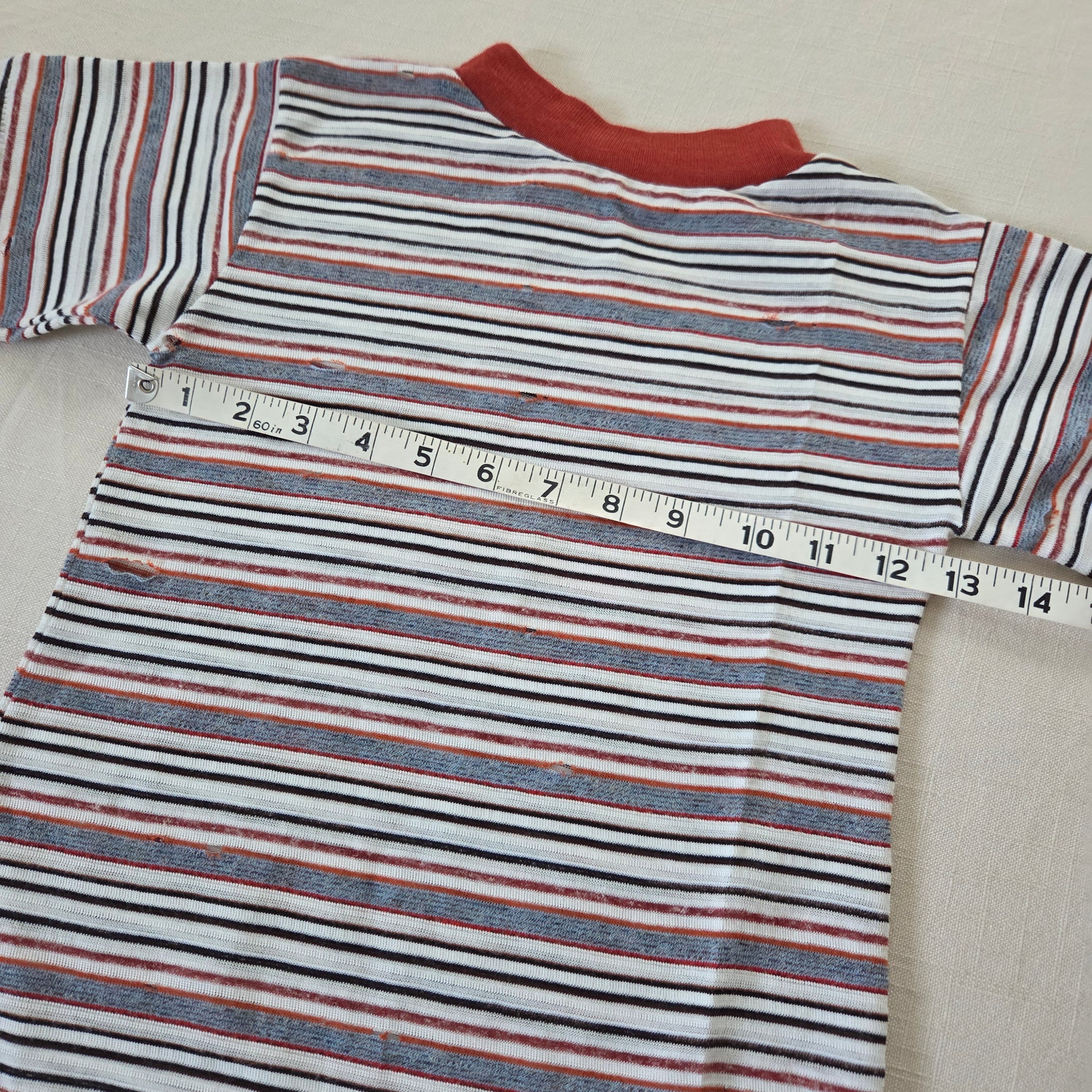 Vintage gray, rust, and white striped tee! Note lots of tiny holes and some repaired holes shown on front and back. Still fine for under overalls or play! Please see all photos for condition and measurements