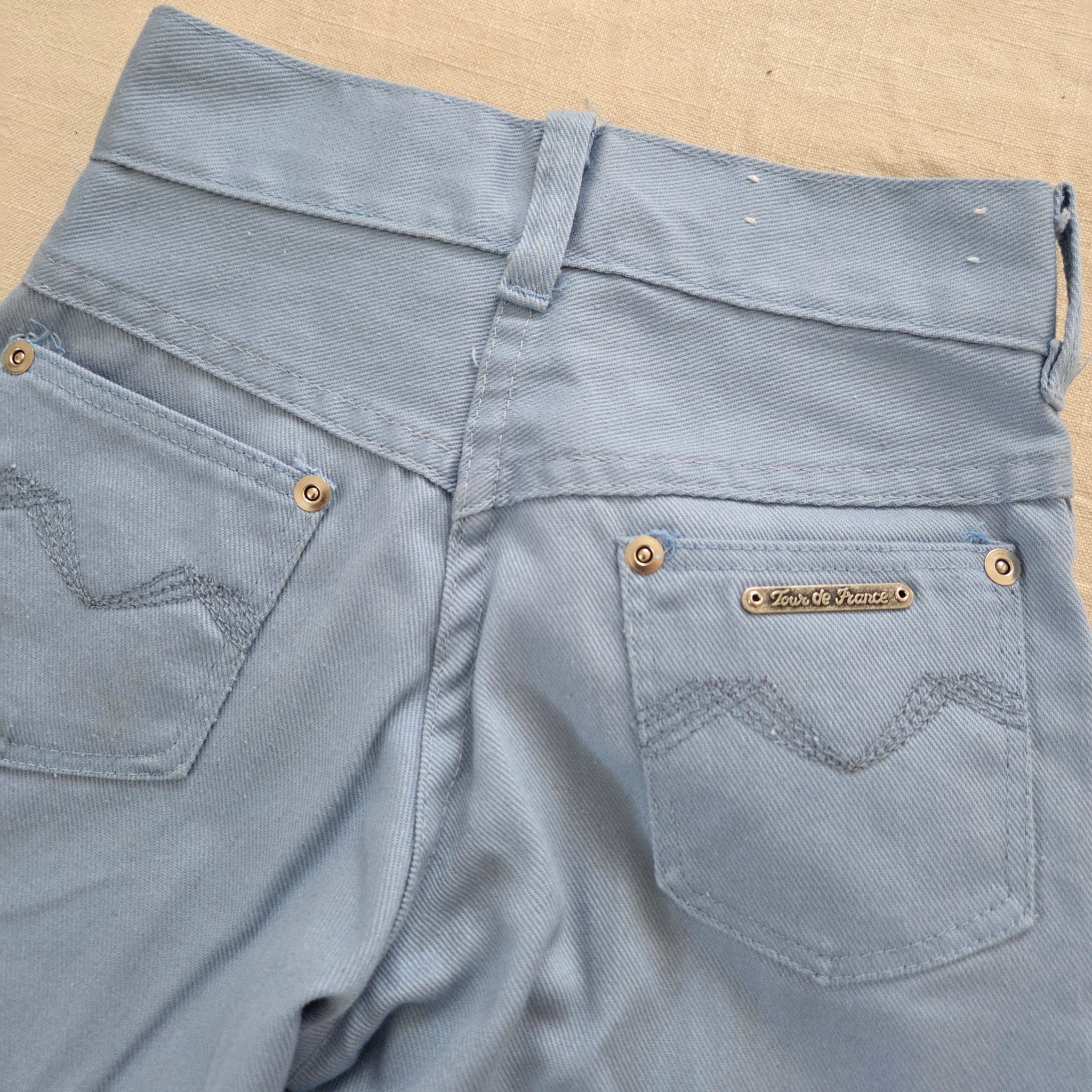 Vintage Tour de France brand light blue cotton/denim-like pants! Note a light spot on knee shown. Please see all photos for condition and measurements