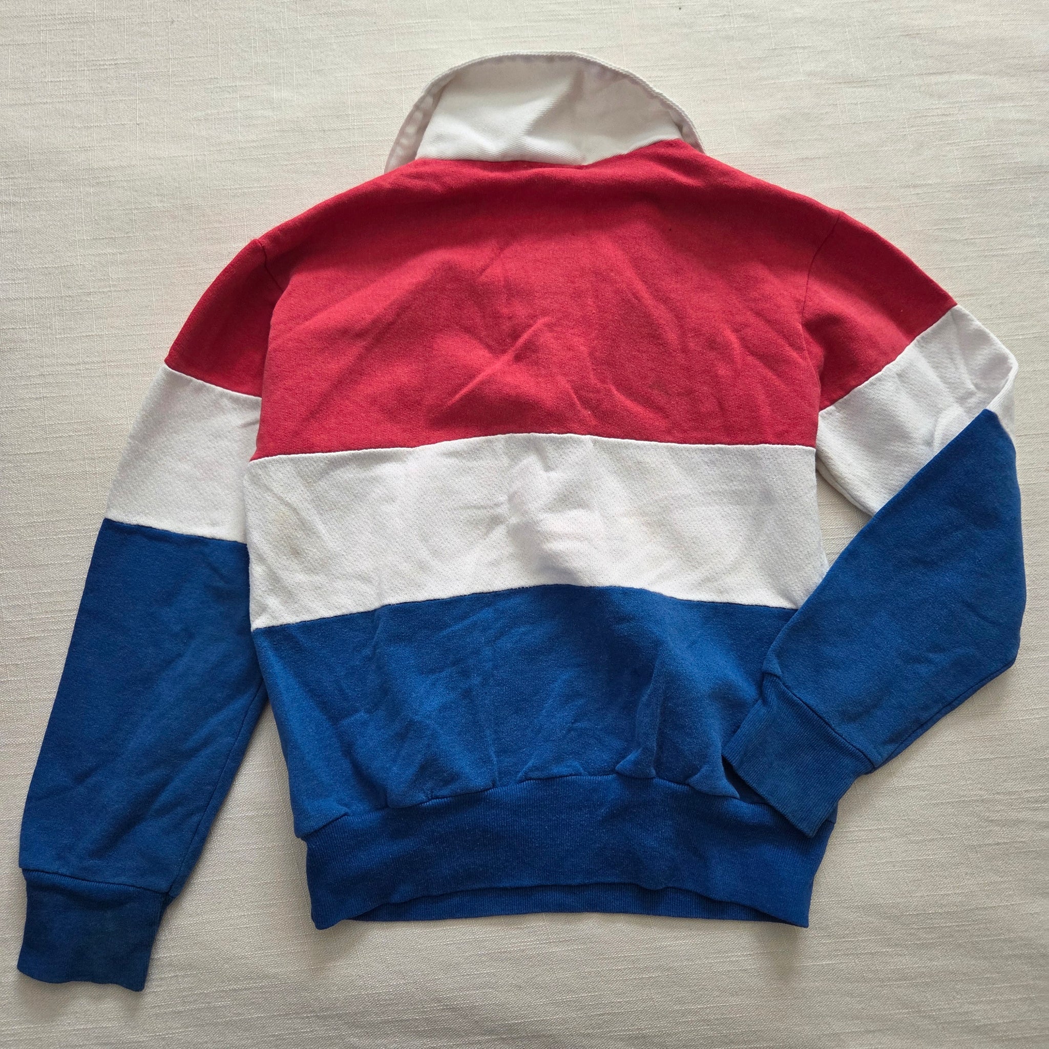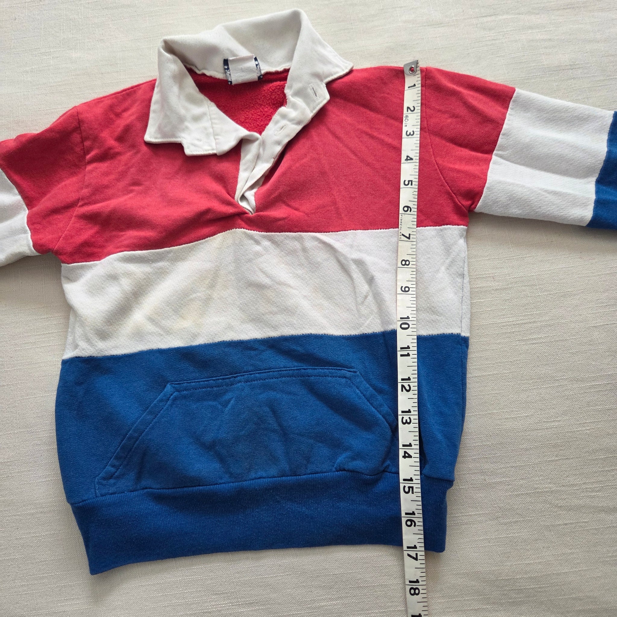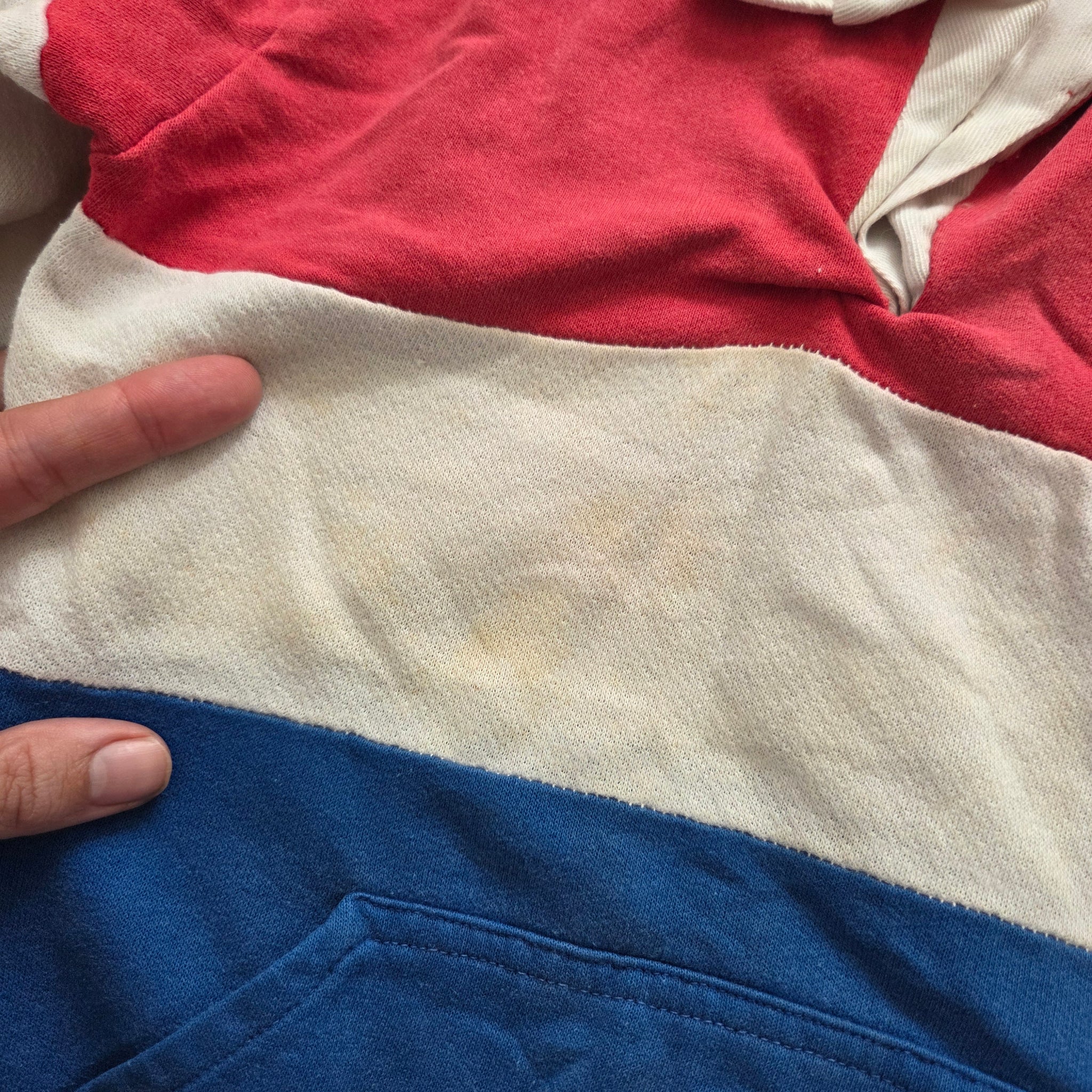 Vintage Sands Point brand red, white, and blue color block sweater with pocket on belly! Note some faint spots on belly not treated by me. Please see all photos for condition and measurements