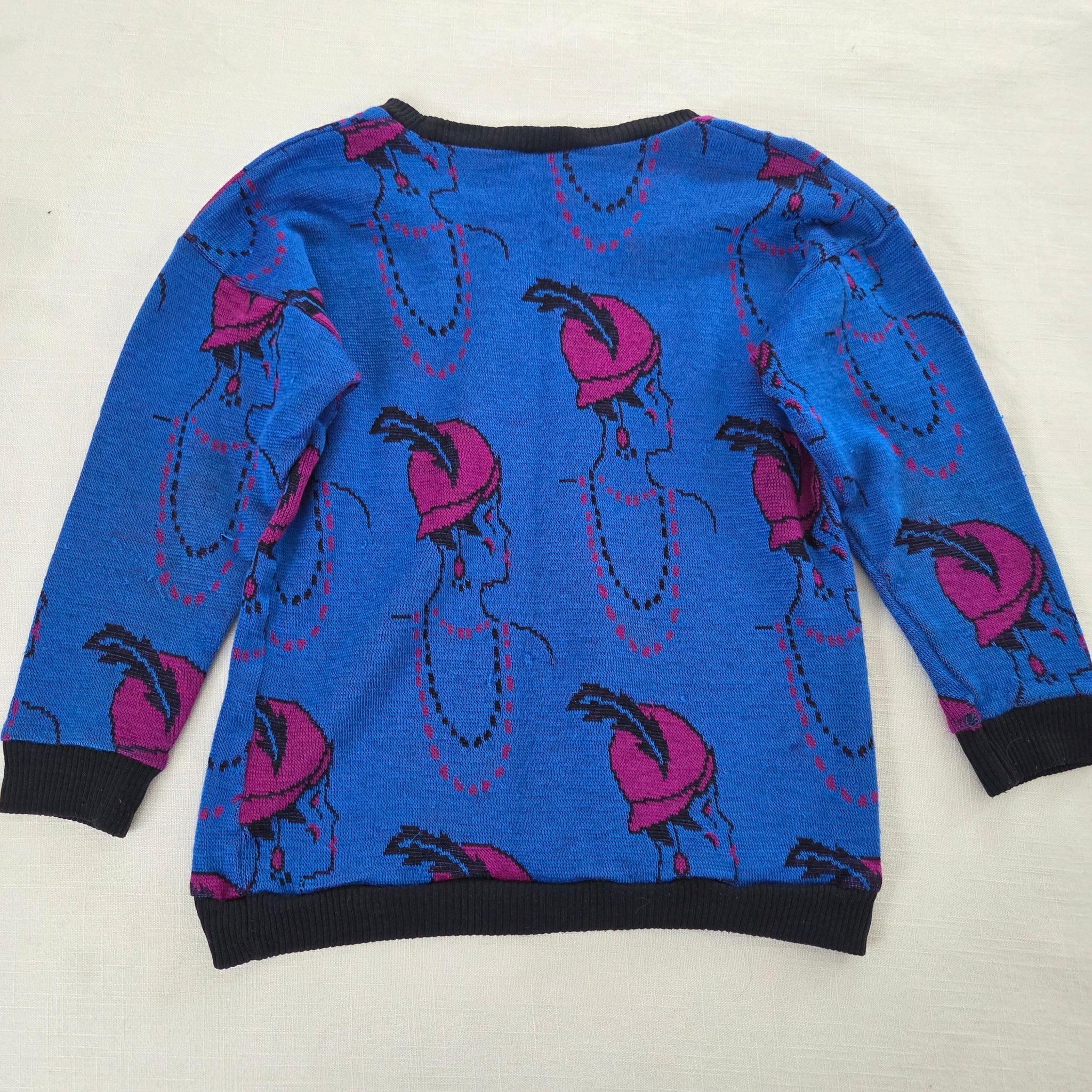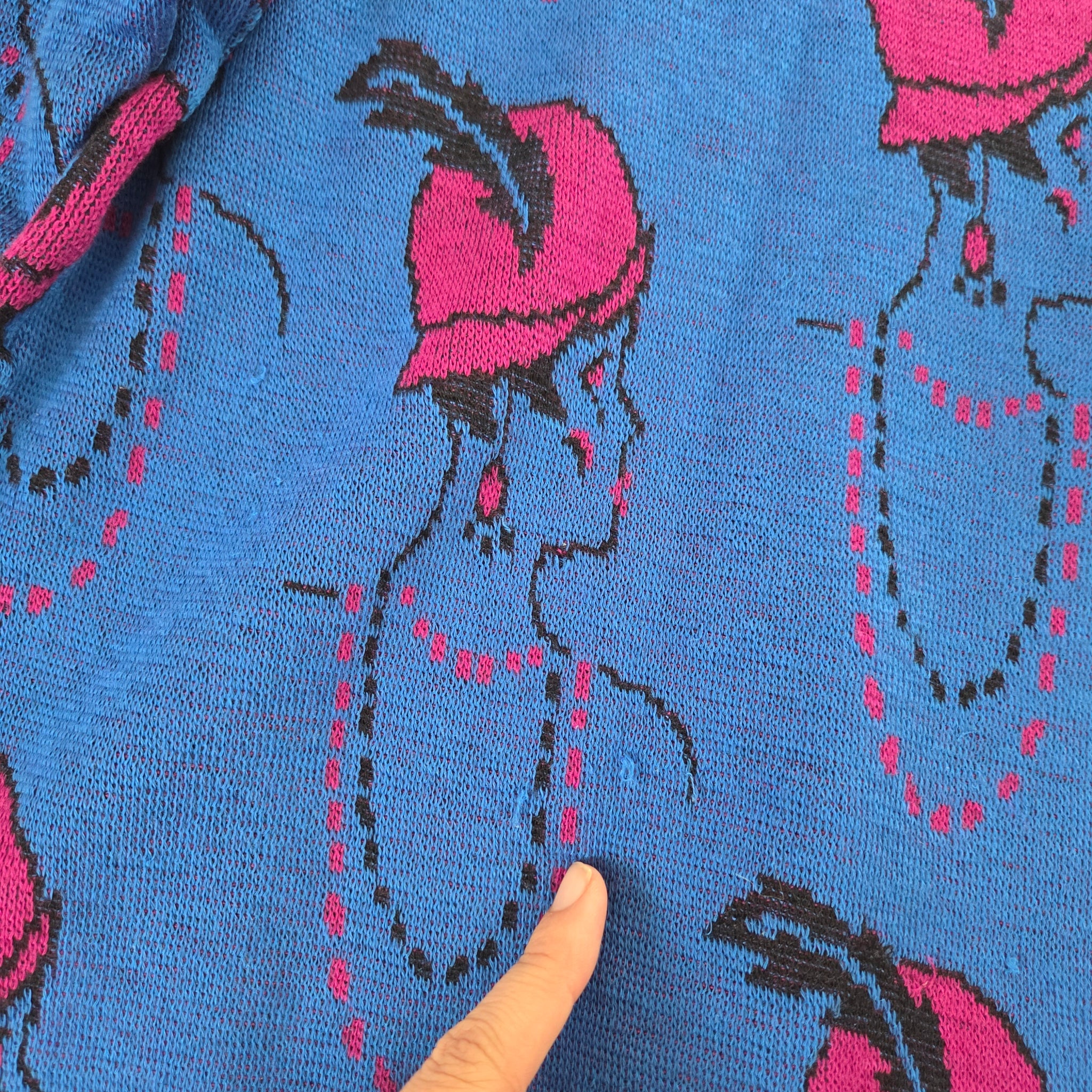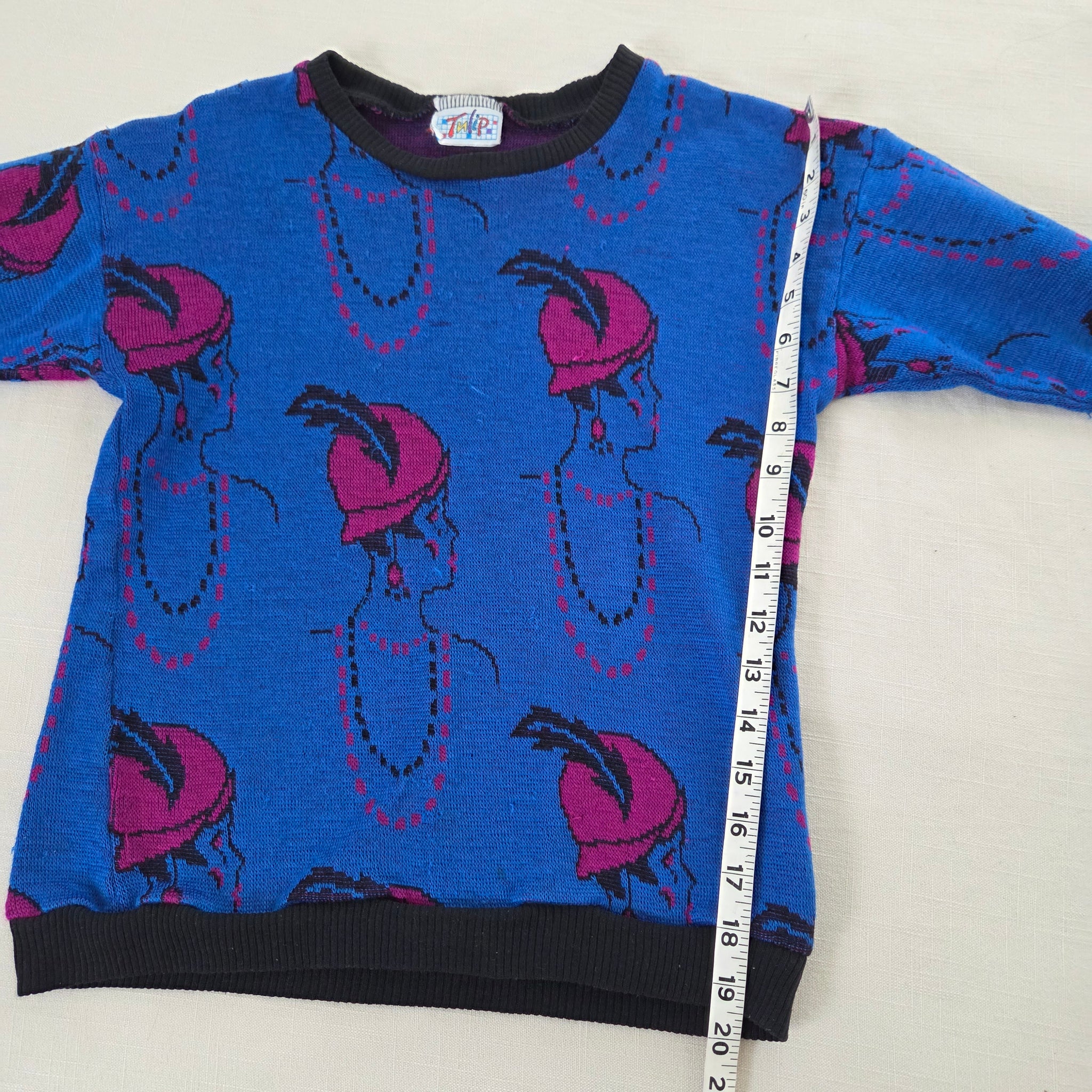 Vintage blue knit sweater with flapper girls profile all over! Note a couple little snags shown. Please see all photos for condition and measurements