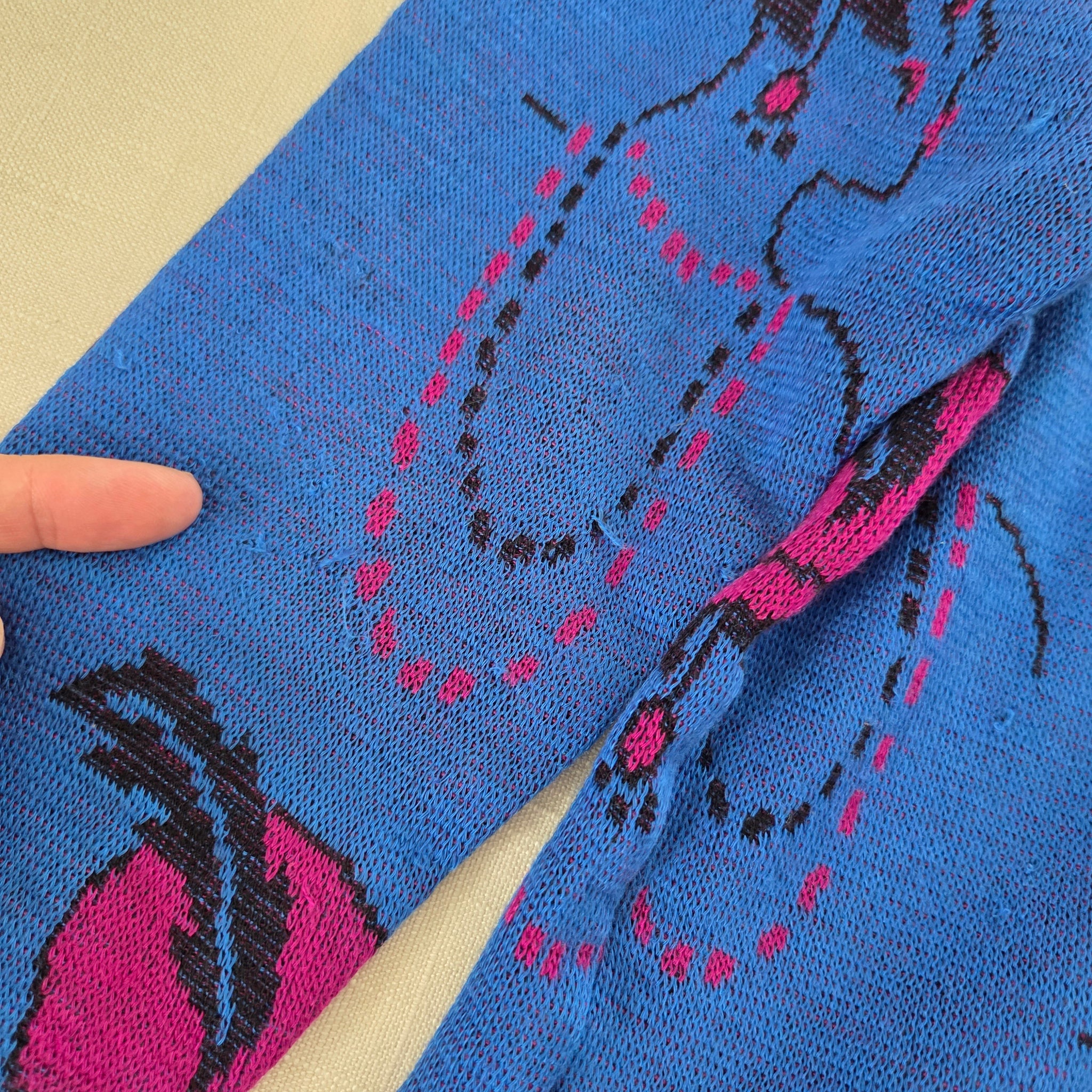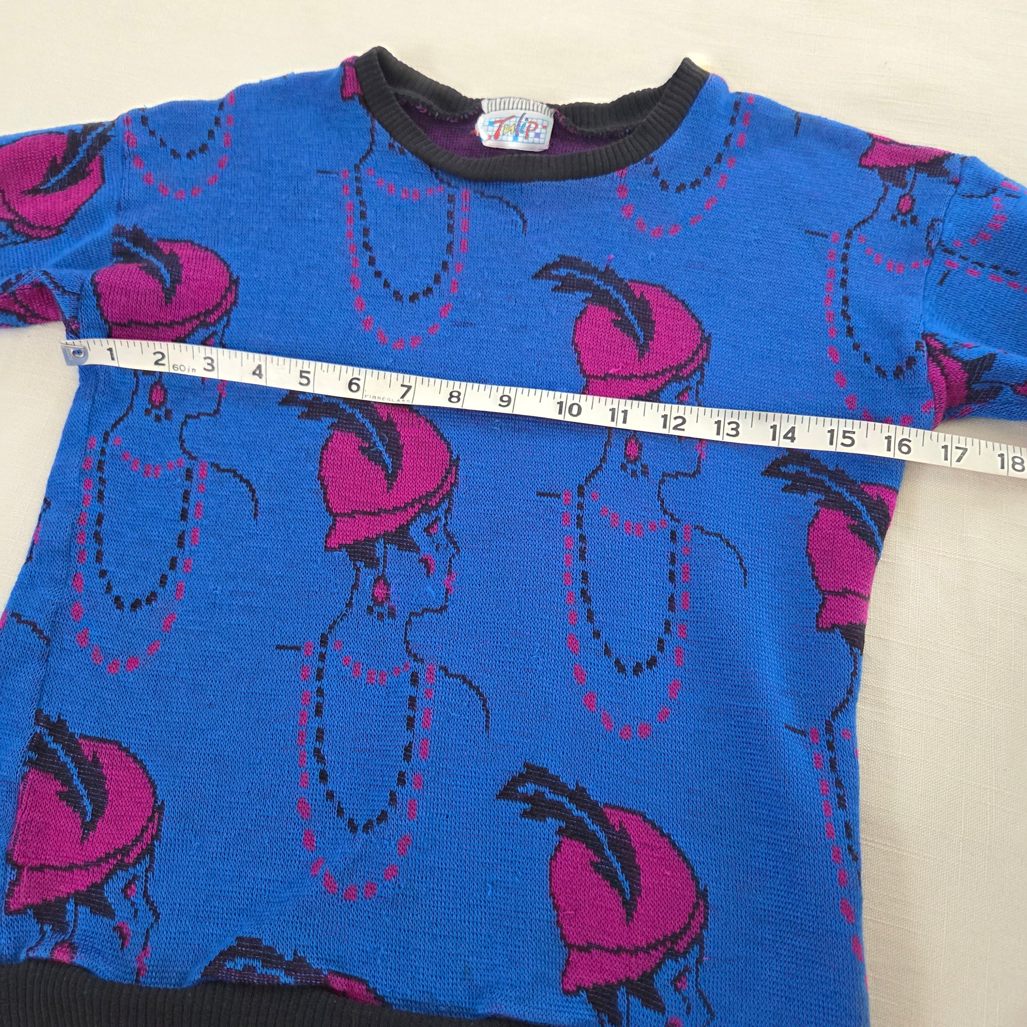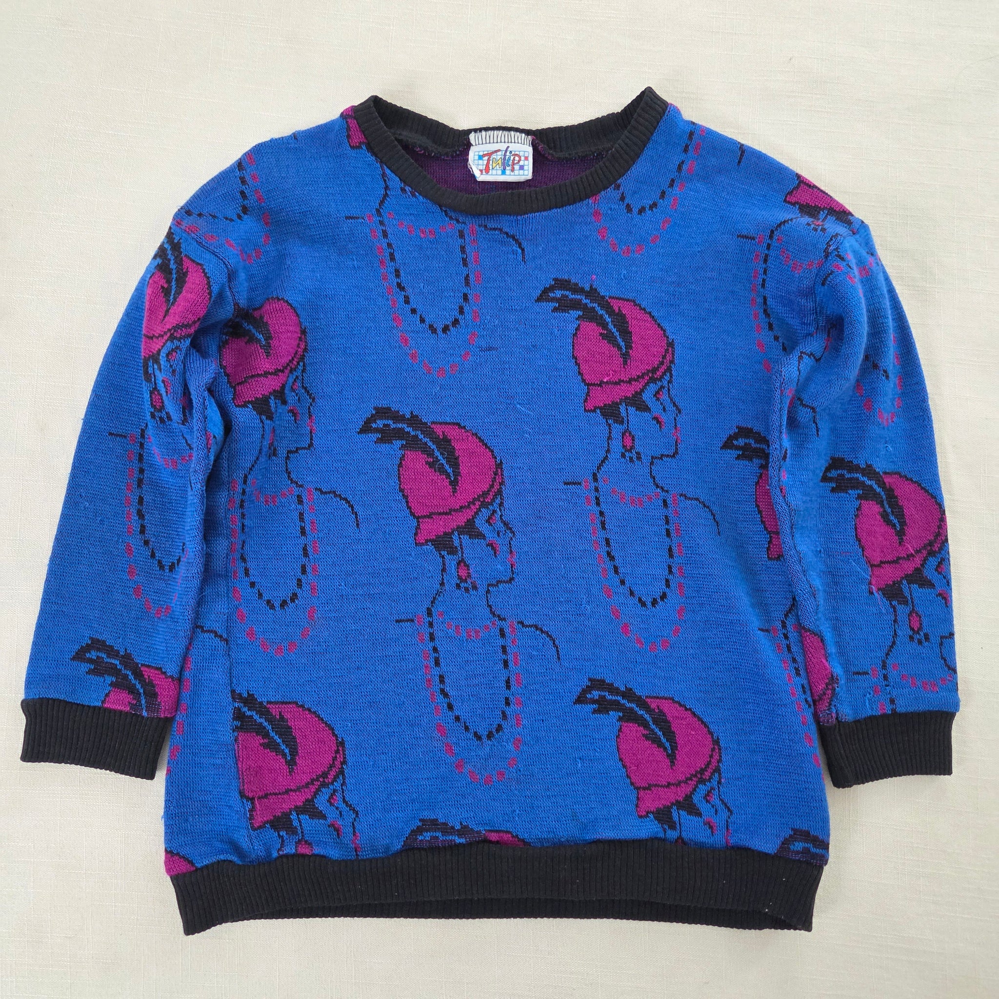 Vintage blue knit sweater with flapper girls profile all over! Note a couple little snags shown. Please see all photos for condition and measurements