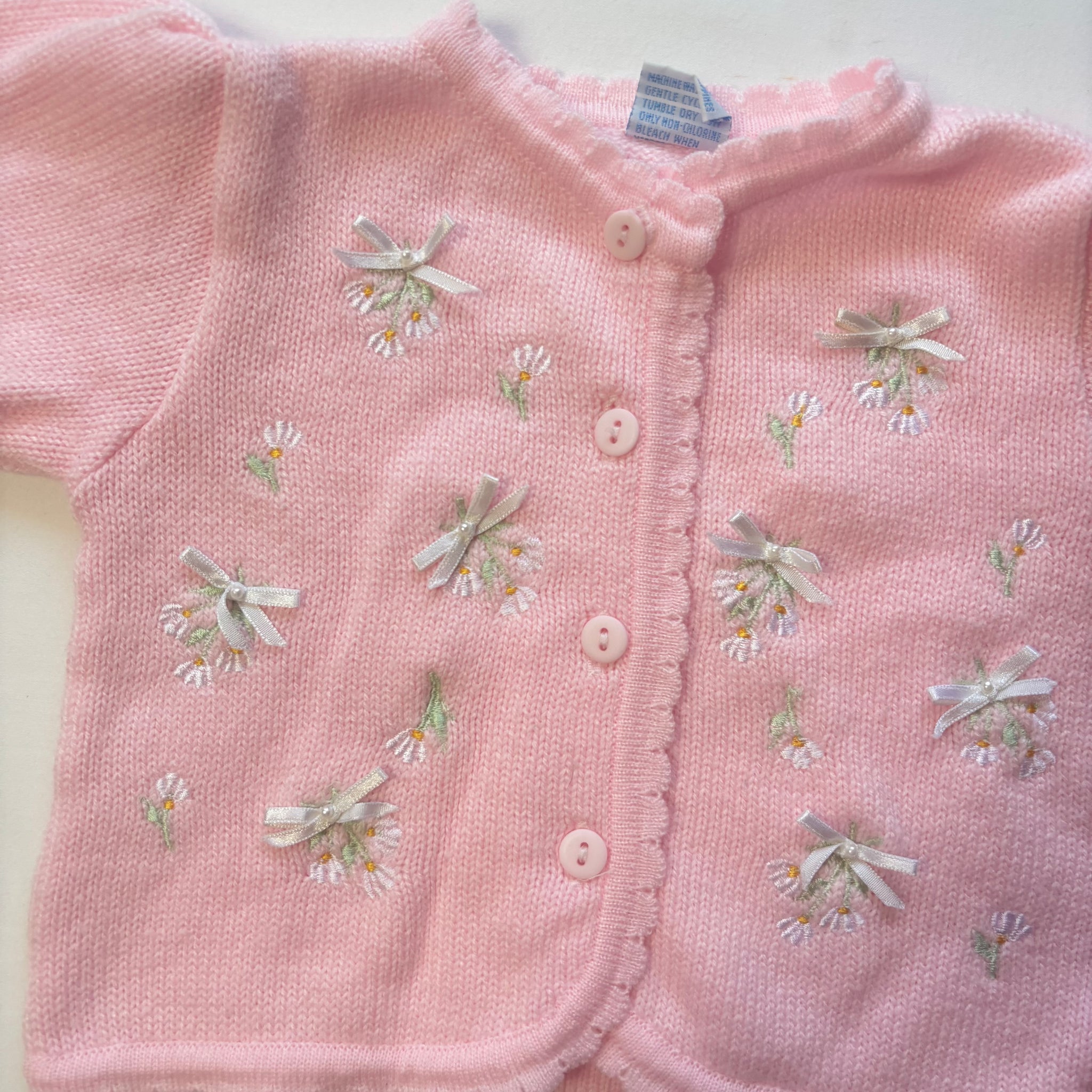 Vintage pink knit cardigan sweater with daisy floral embroidery and bows on front! Please see all photos for condition and measurements