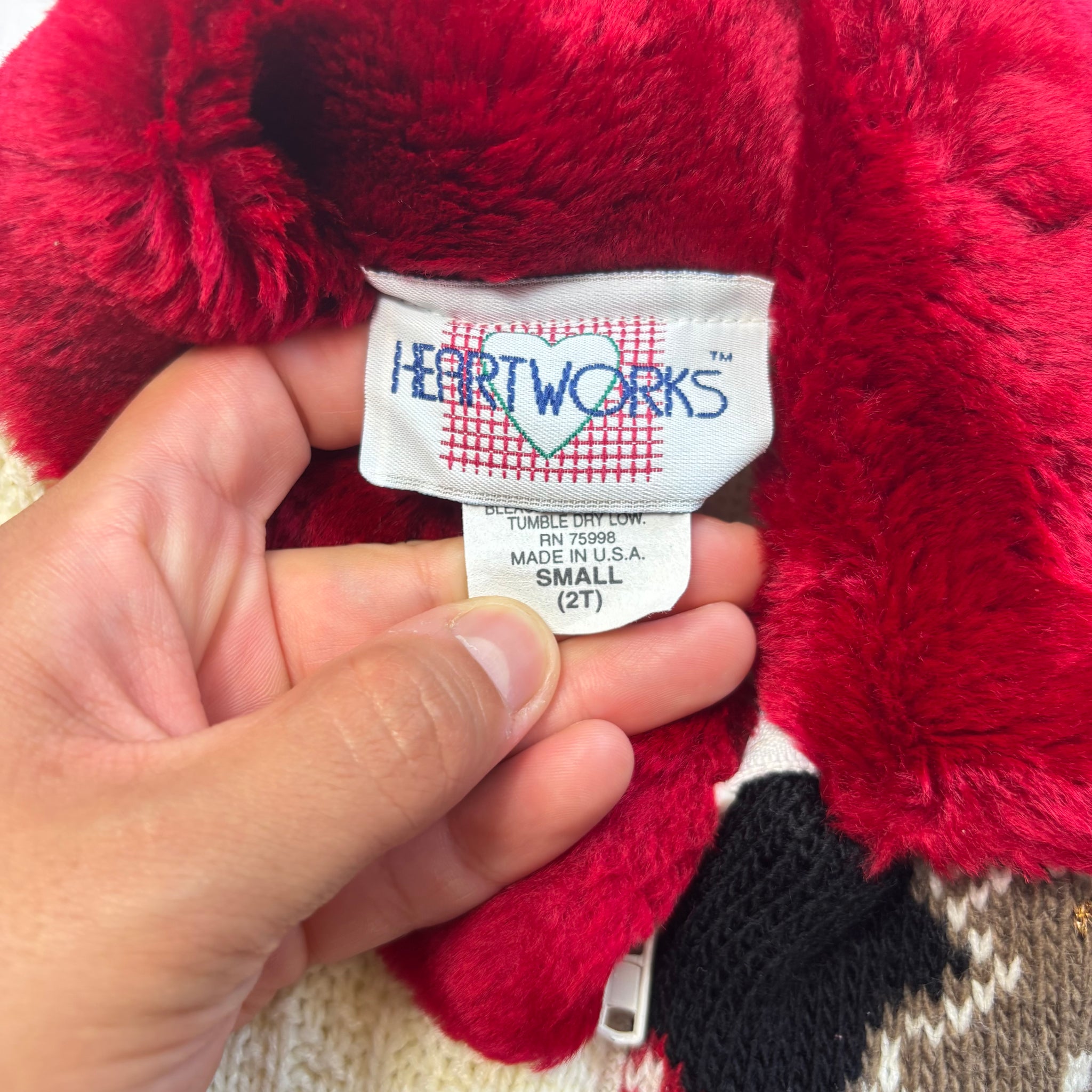 Vintage Heartworks brand knit patchwork looking zipup sweater with Christmas tree, gingerbread man, and stocking details plus faux fur red collar! Little peppermint candy and hearts around wrists! Please see all photos for condition and measurements
