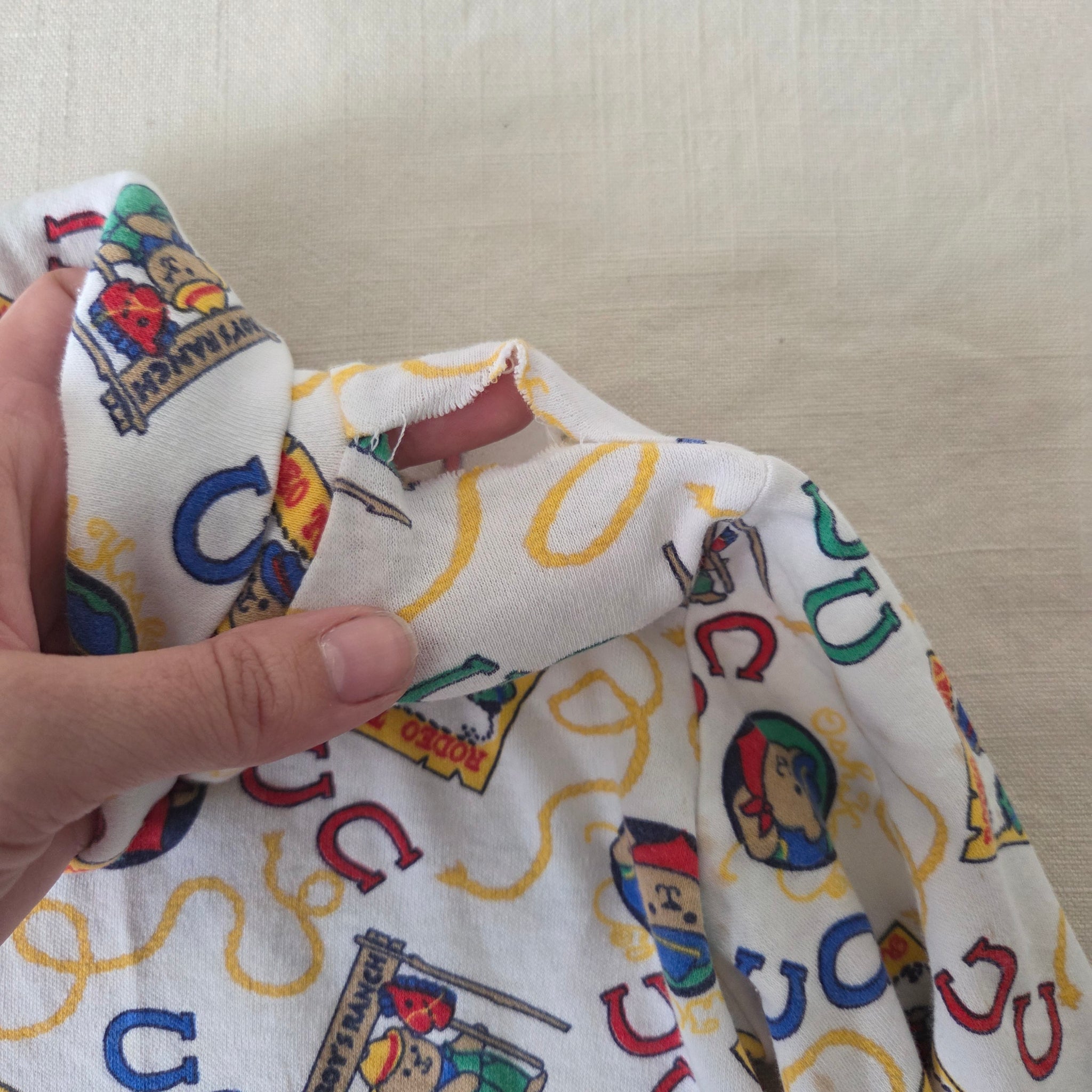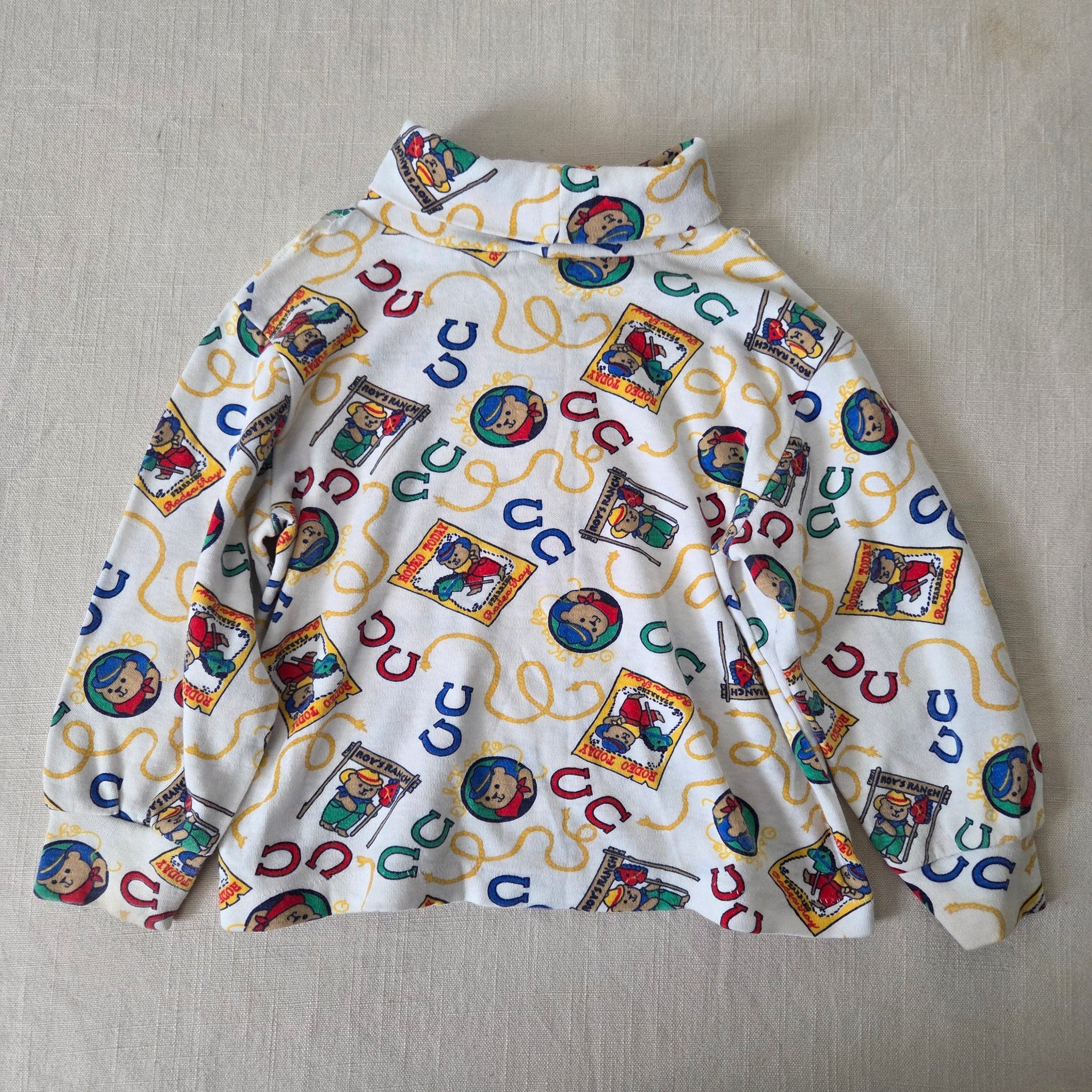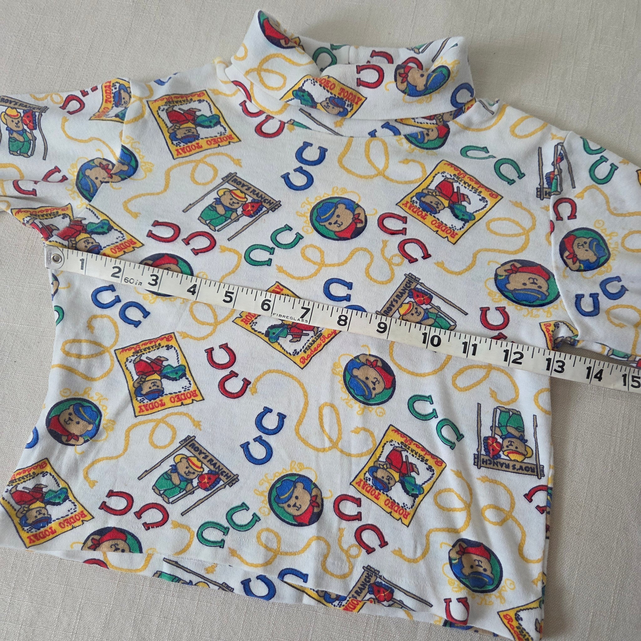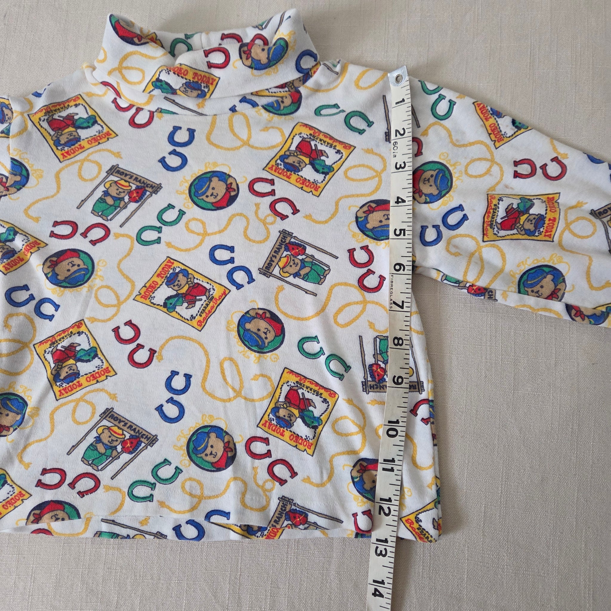 Vintage Oshkosh cowboy bears pattern turtleneck long sleeve shirt! Note a part of seam has come undone around neck/shoulder area. Also tag cut. Please see all photos for condition and measurements