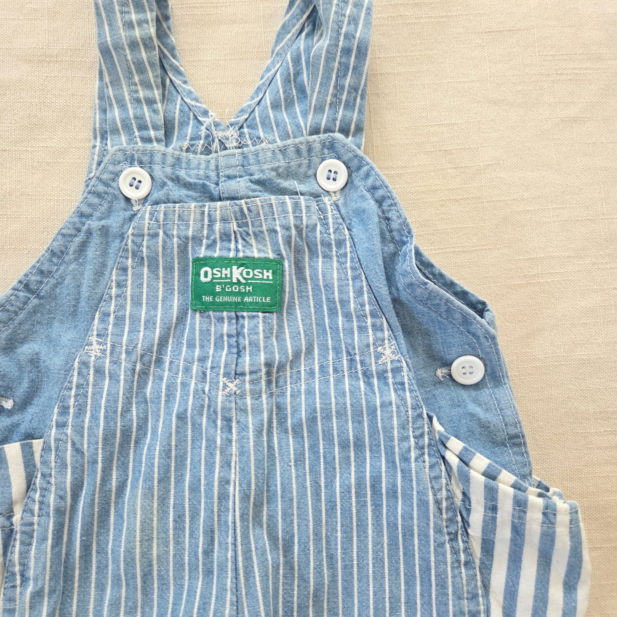 Vintage Oshkosh blue and white striped overalls with jogger ankles and green patch! Please see all photos for condition and measurements
