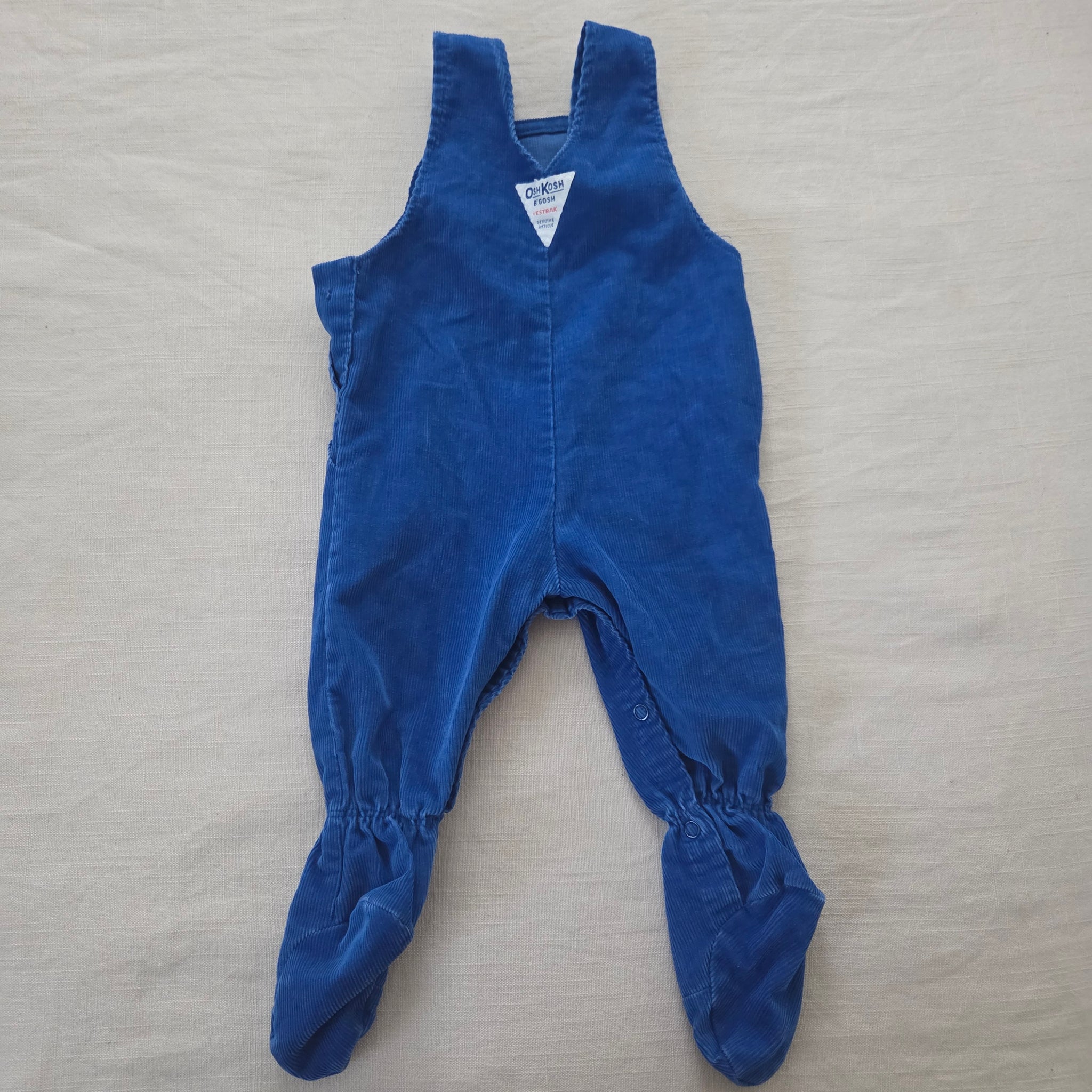 Vintage Oshkosh royal blue corduroy footed overalls! Note one button missing at one side of the waist. Please see all photos for condition and measurements