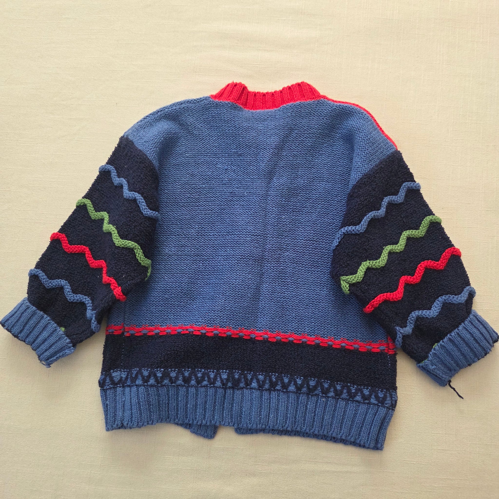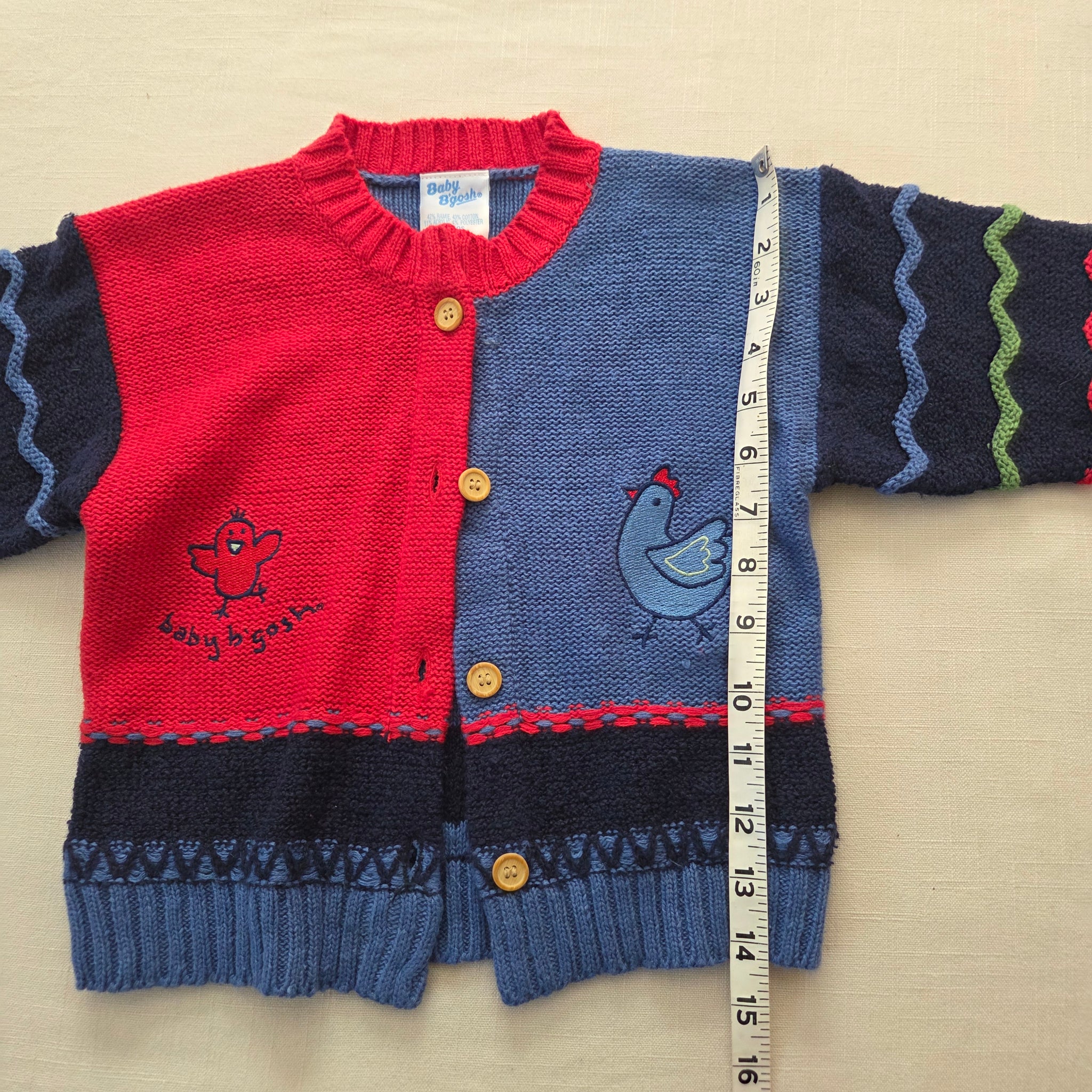 Vintage Baby Bgosh Oshkosh cute colorful knit cardigan sweater with chick and chicken details, also really cool squiggly lines on sleeves! Please see all photos for condition and measurements
