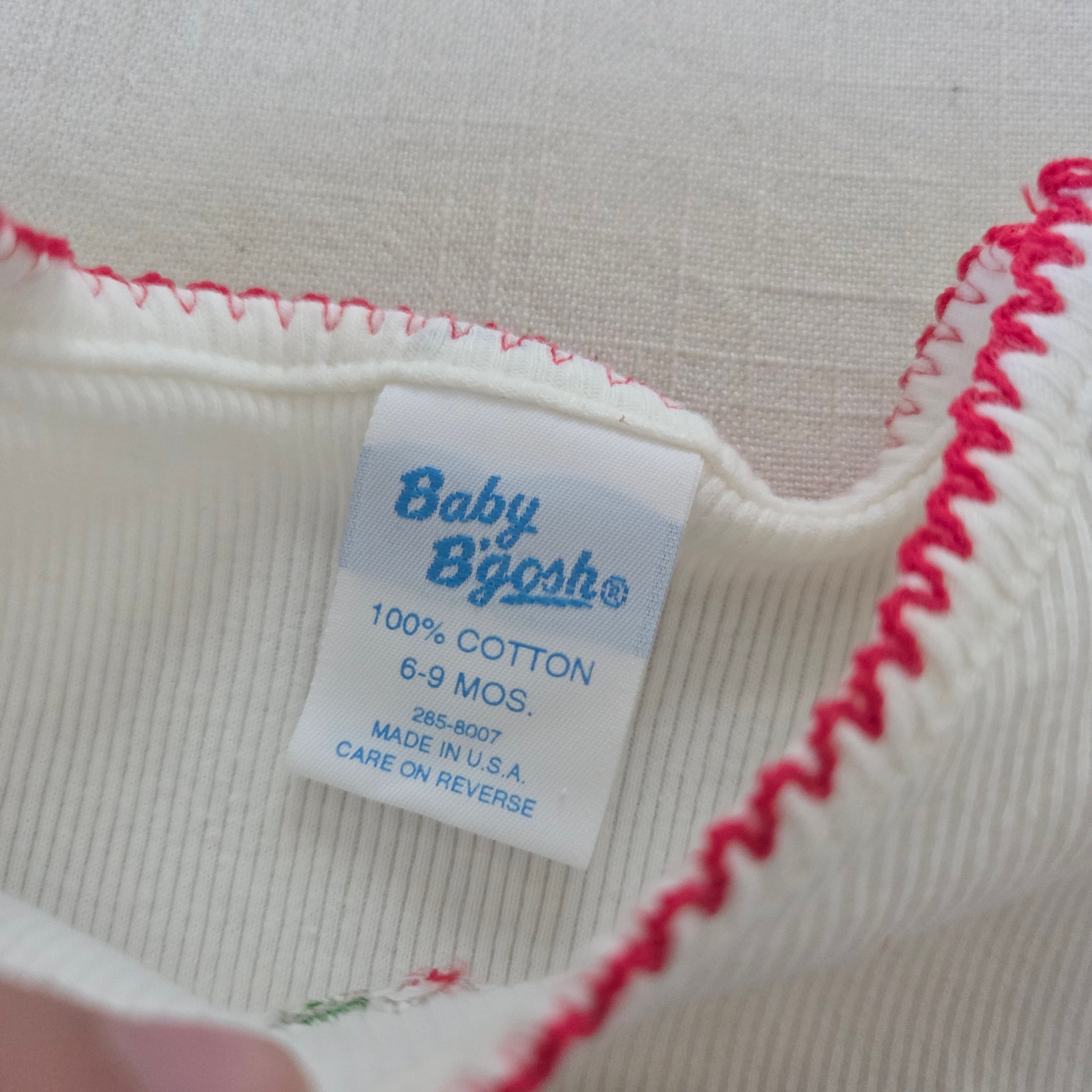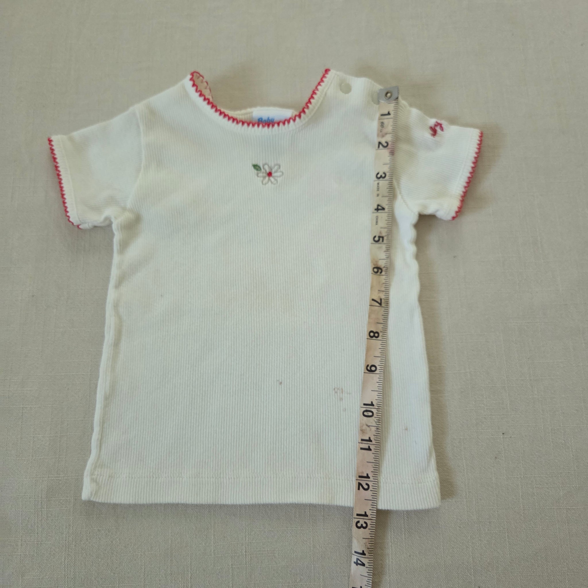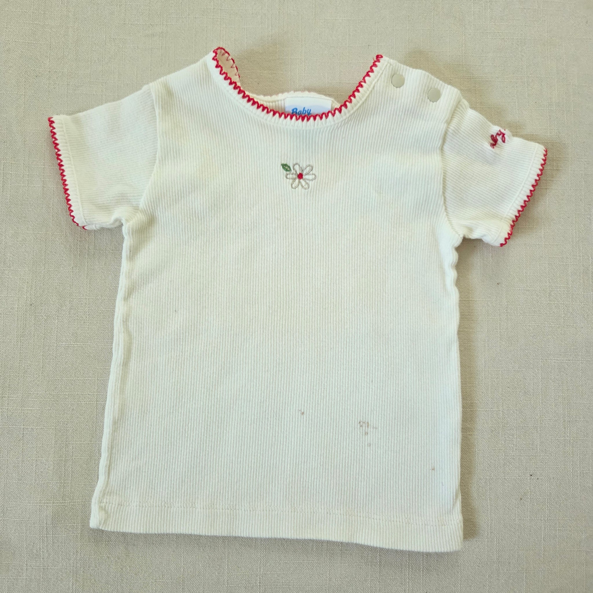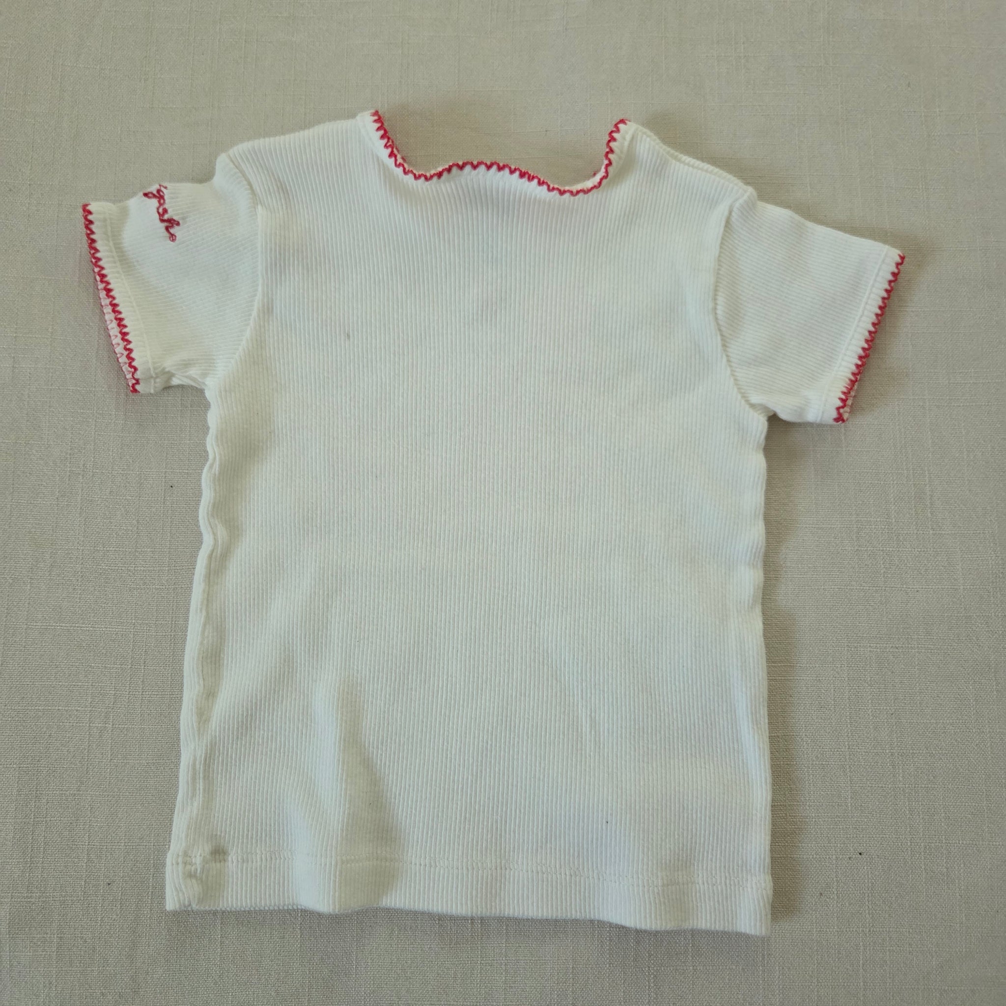 Vintage Oshkosh white ribbed shirt with red trim and daisy embroidered on chest! Note little spots on belly shown. Please see all photos for condition and measurements