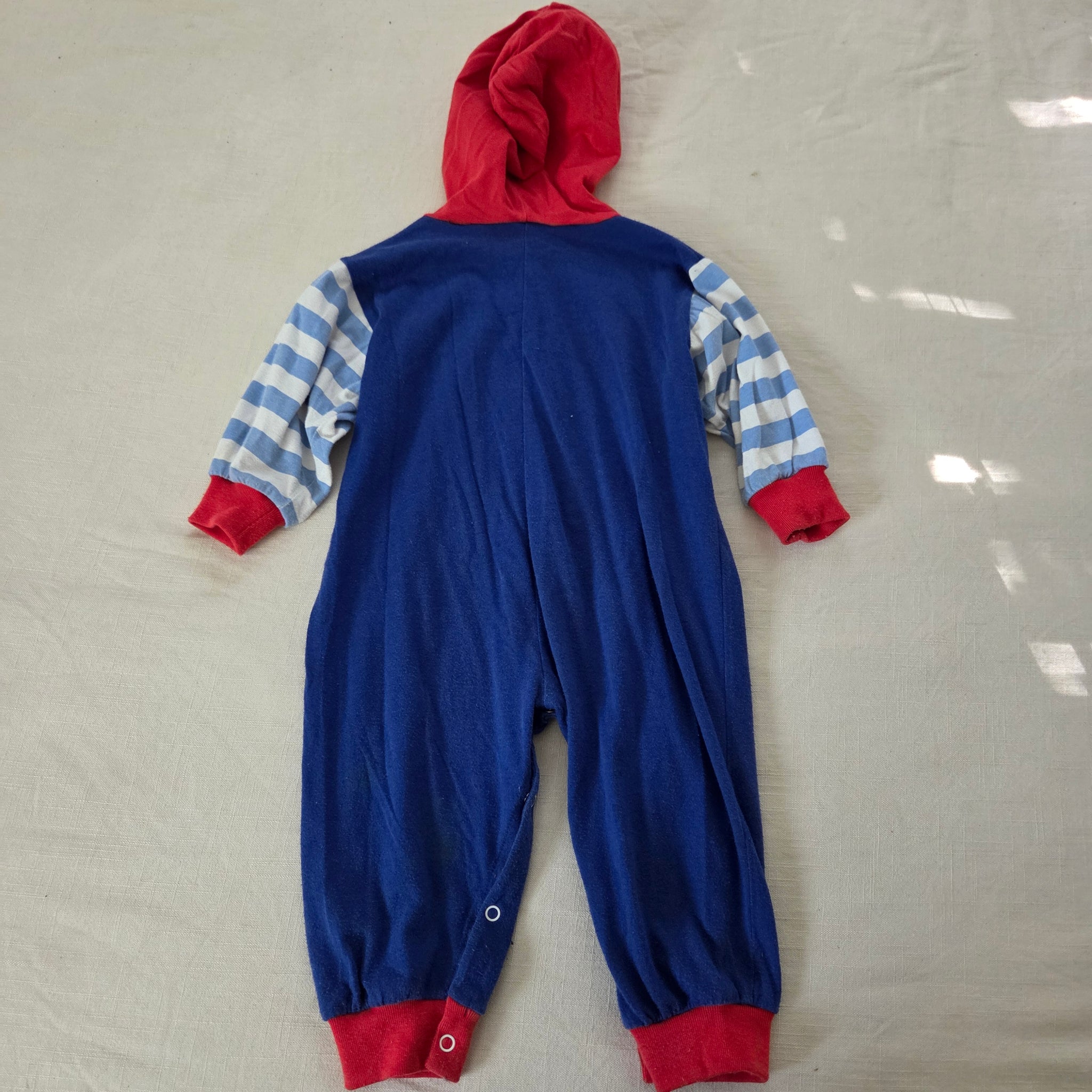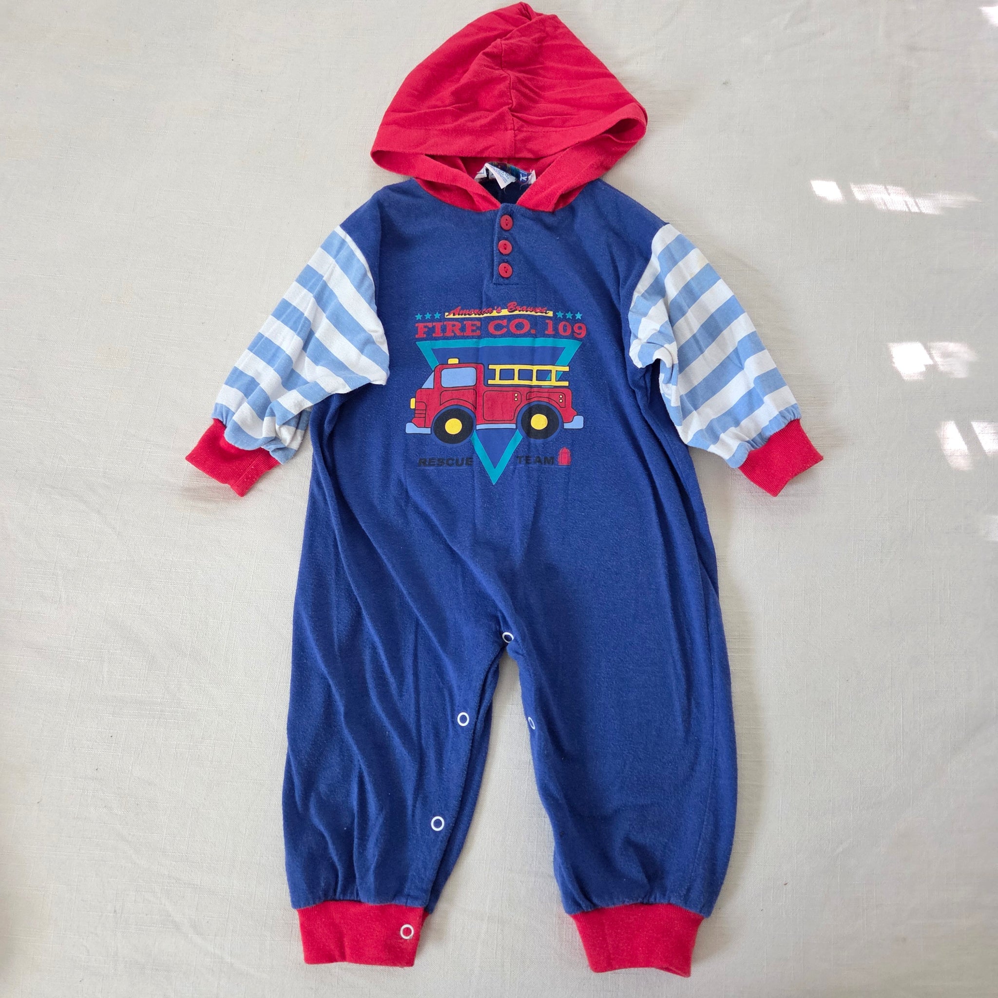Vintage Colortrack brand blue, red, and white hooded slouchy bodysuit with fire truck on chest! Adorable striped sleeves! Please see all photos for condition and measurements