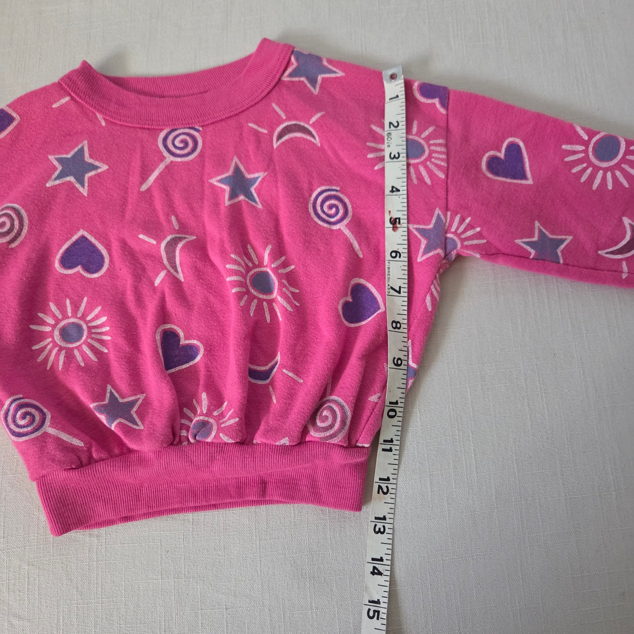 Vintage Dobie brand hot pink shirt with suns, lollipops, hearts, and suns doodle pattern all over! Please see all photos for condition and measurements