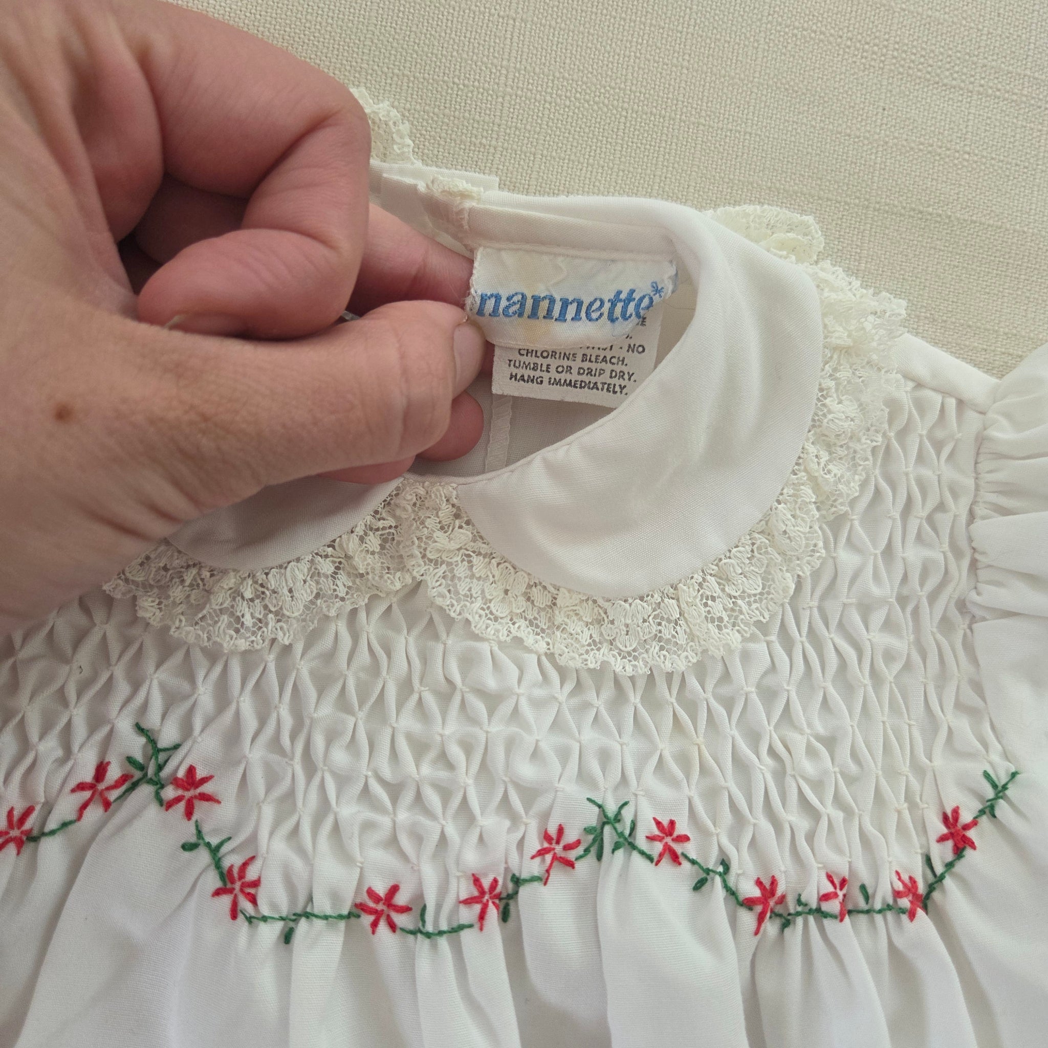 Vintage Nannette brand smocked chest white dress with red and green flower embroidery! Please see all photos for condition and measurements