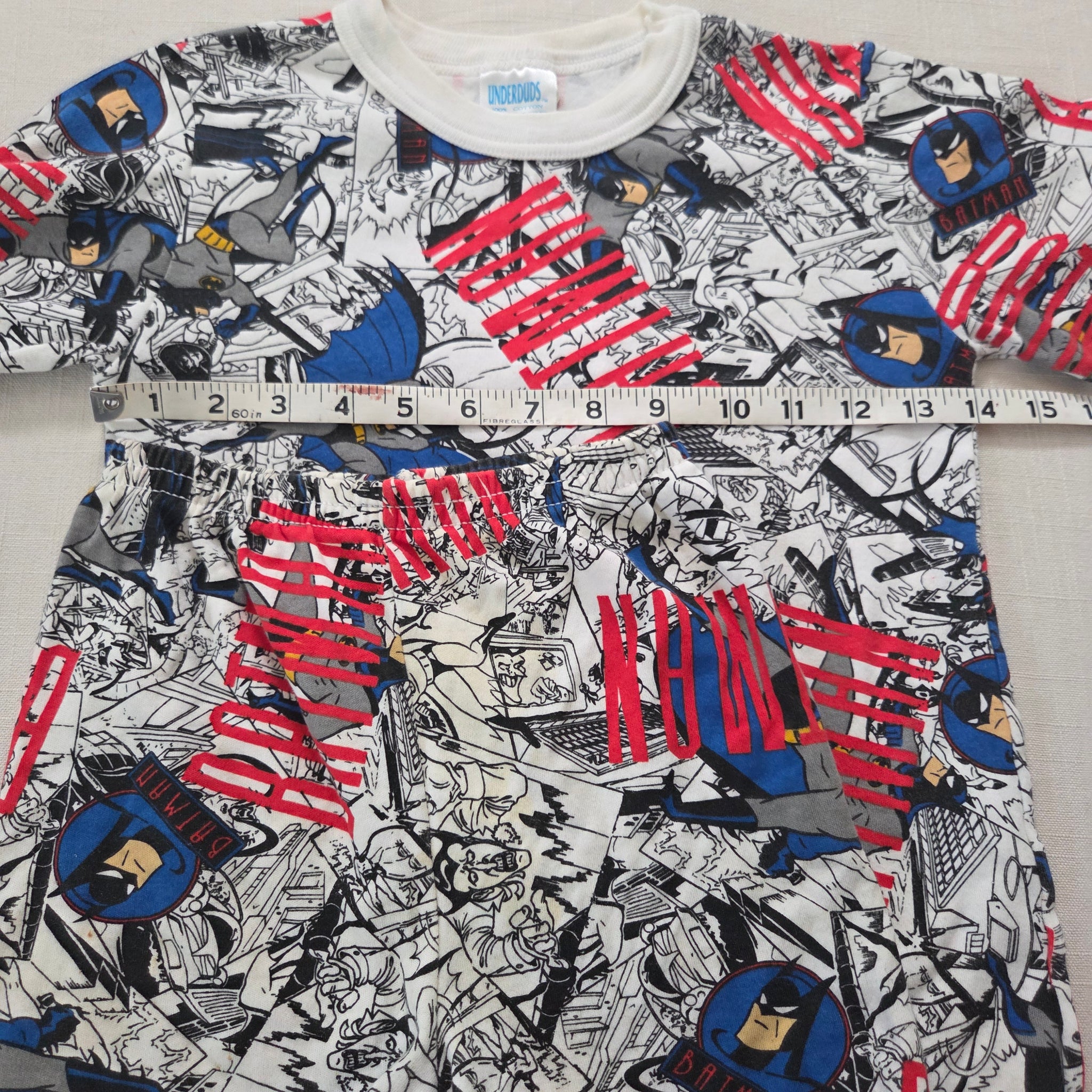 Vintage 1994 Batman pattern pajamas shirt and shorts! I think either could be worn as regular clothing as material is thicker cotton feeling. Note some yellow spots on shorts shown, has great stretchy elastic waist though. Please see all photos for condition and measurements