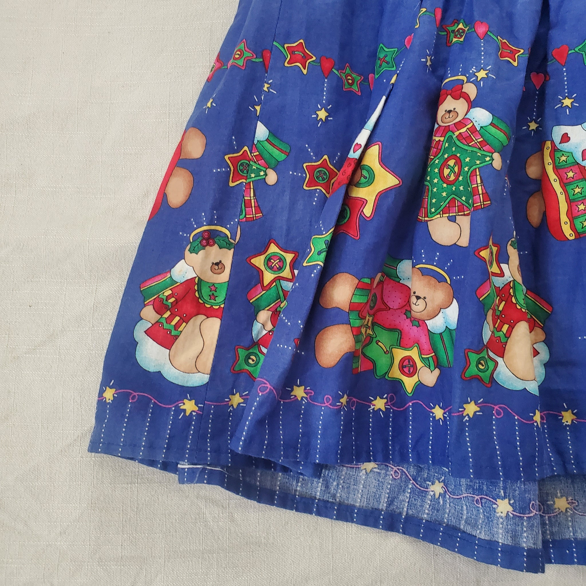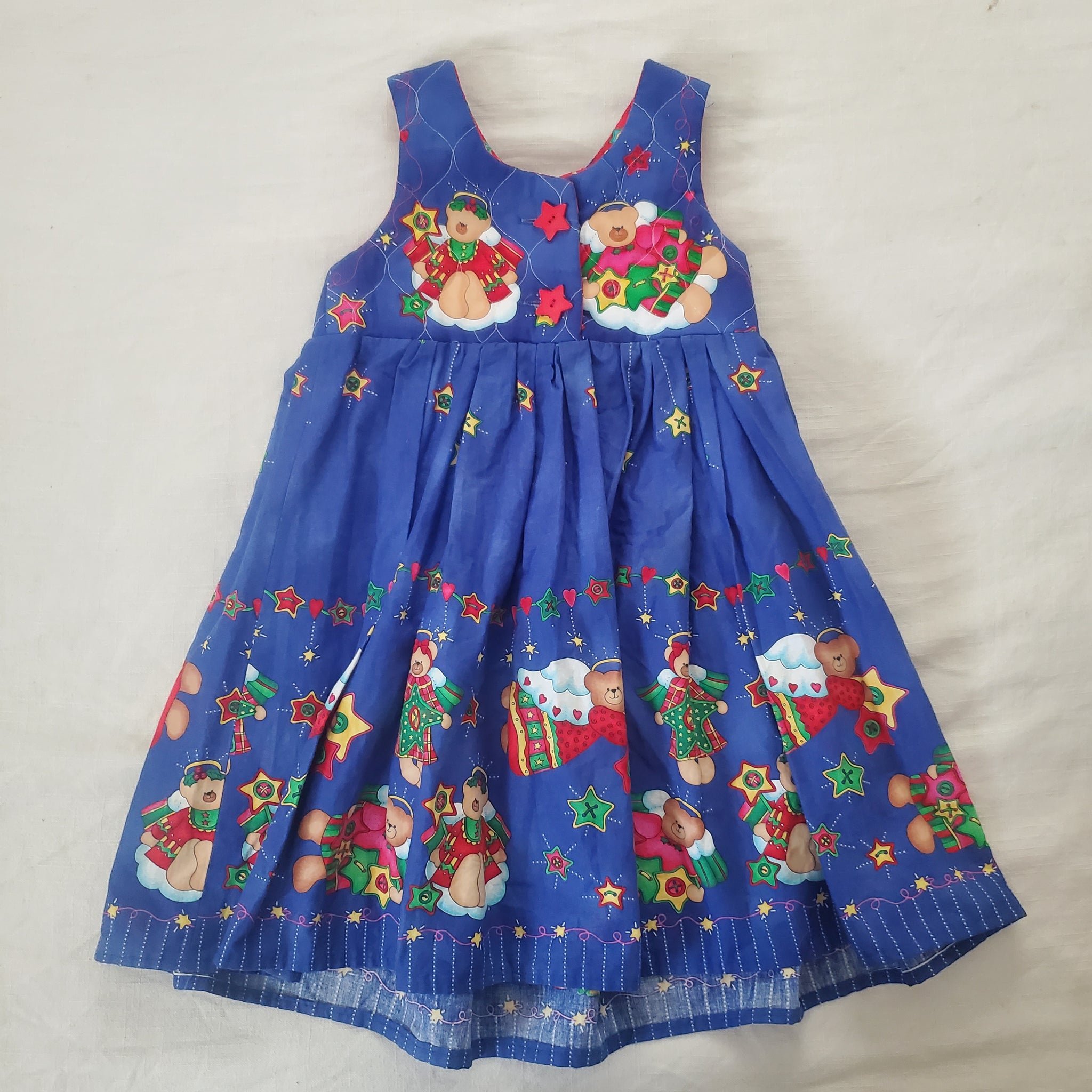 Vintage blue Christmas bears pattern sleeveless dress with pockets! Perfect for layering over a shirt or other dress! Note a light spot shown, blends into fabric well for where it is so unnoticed when worn. Please see all photos for condition and measurements
