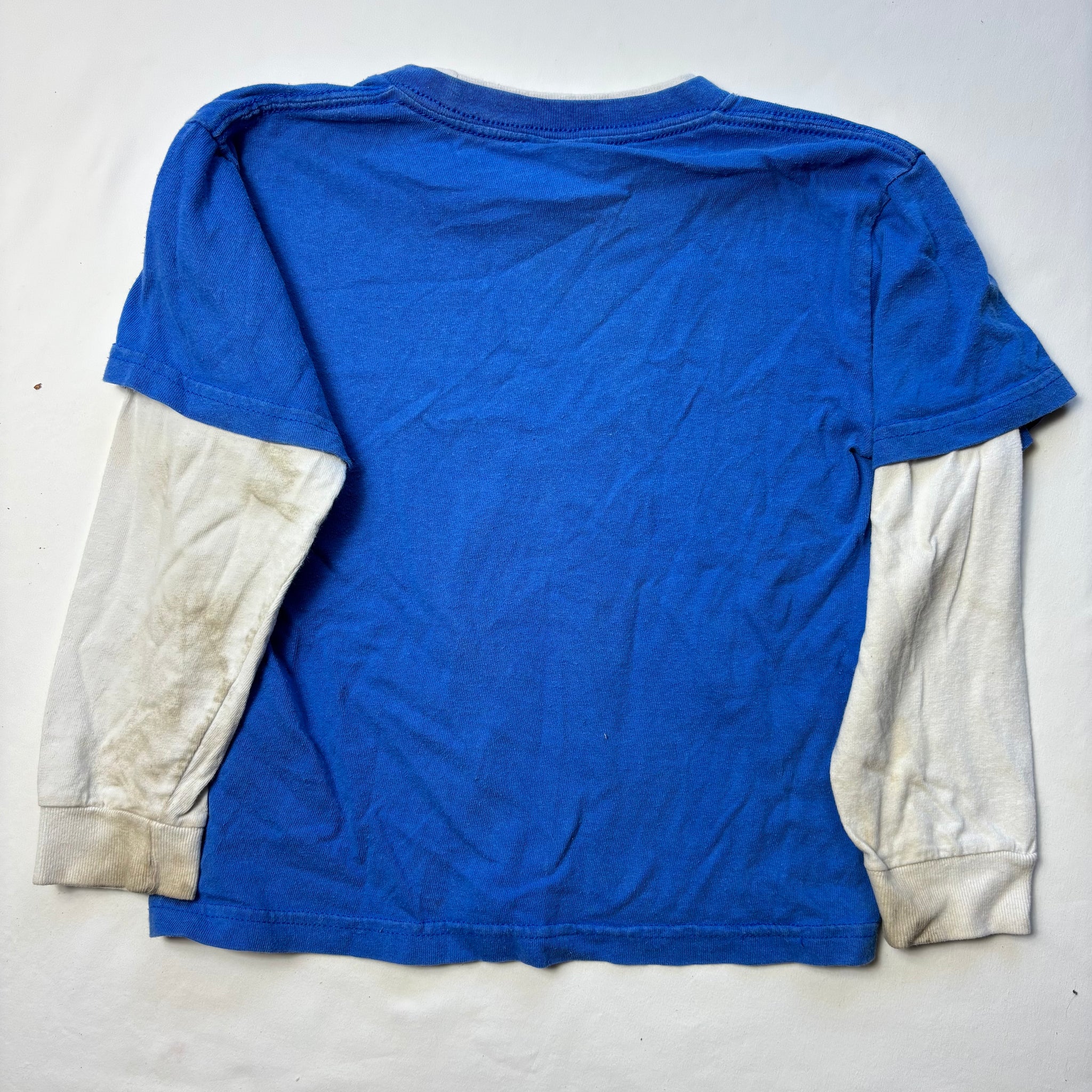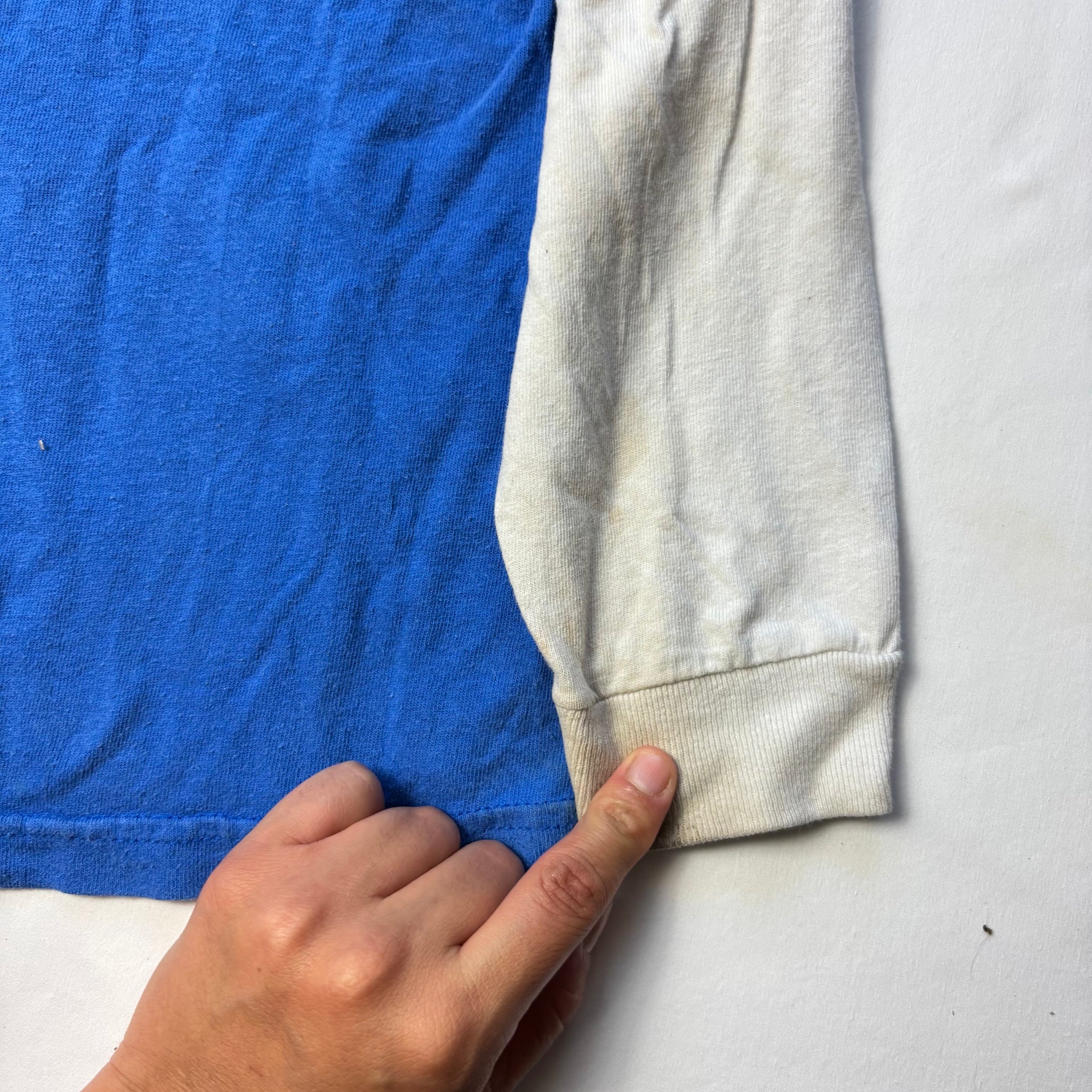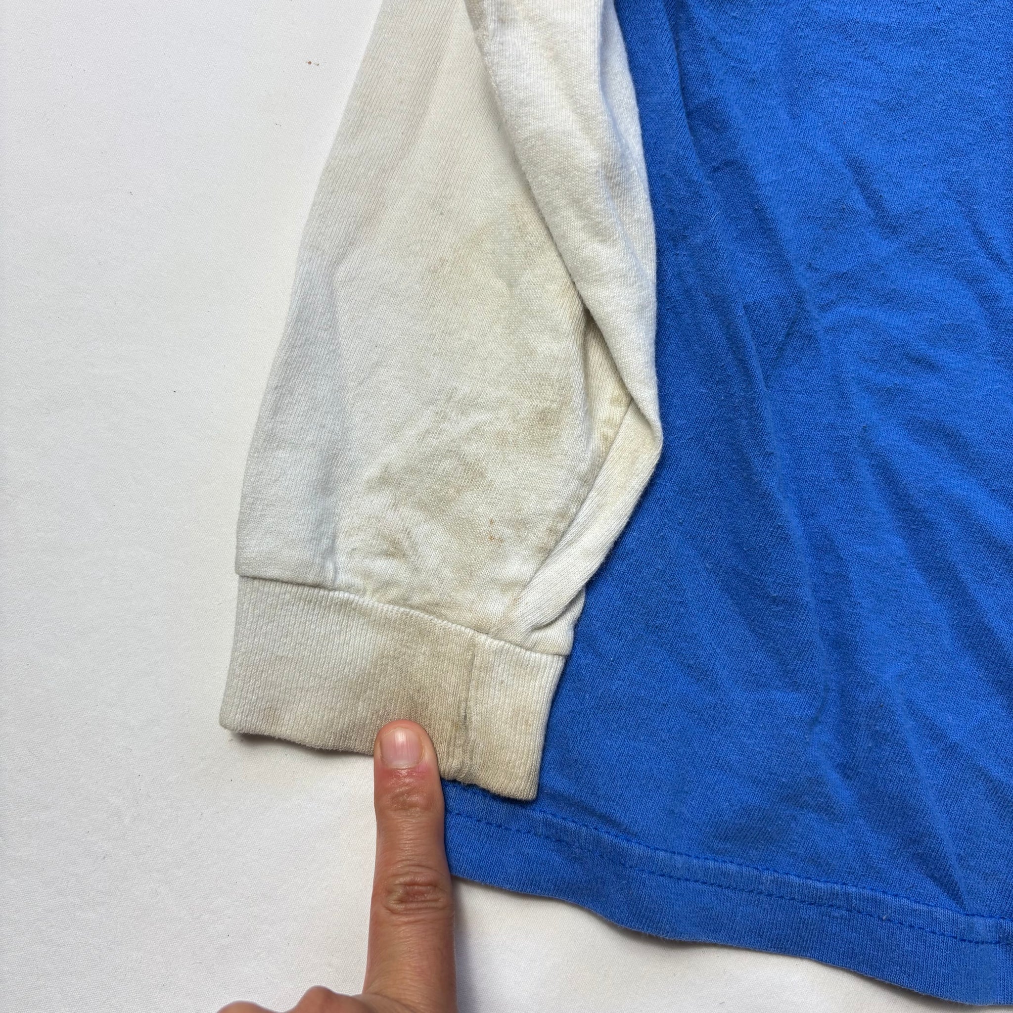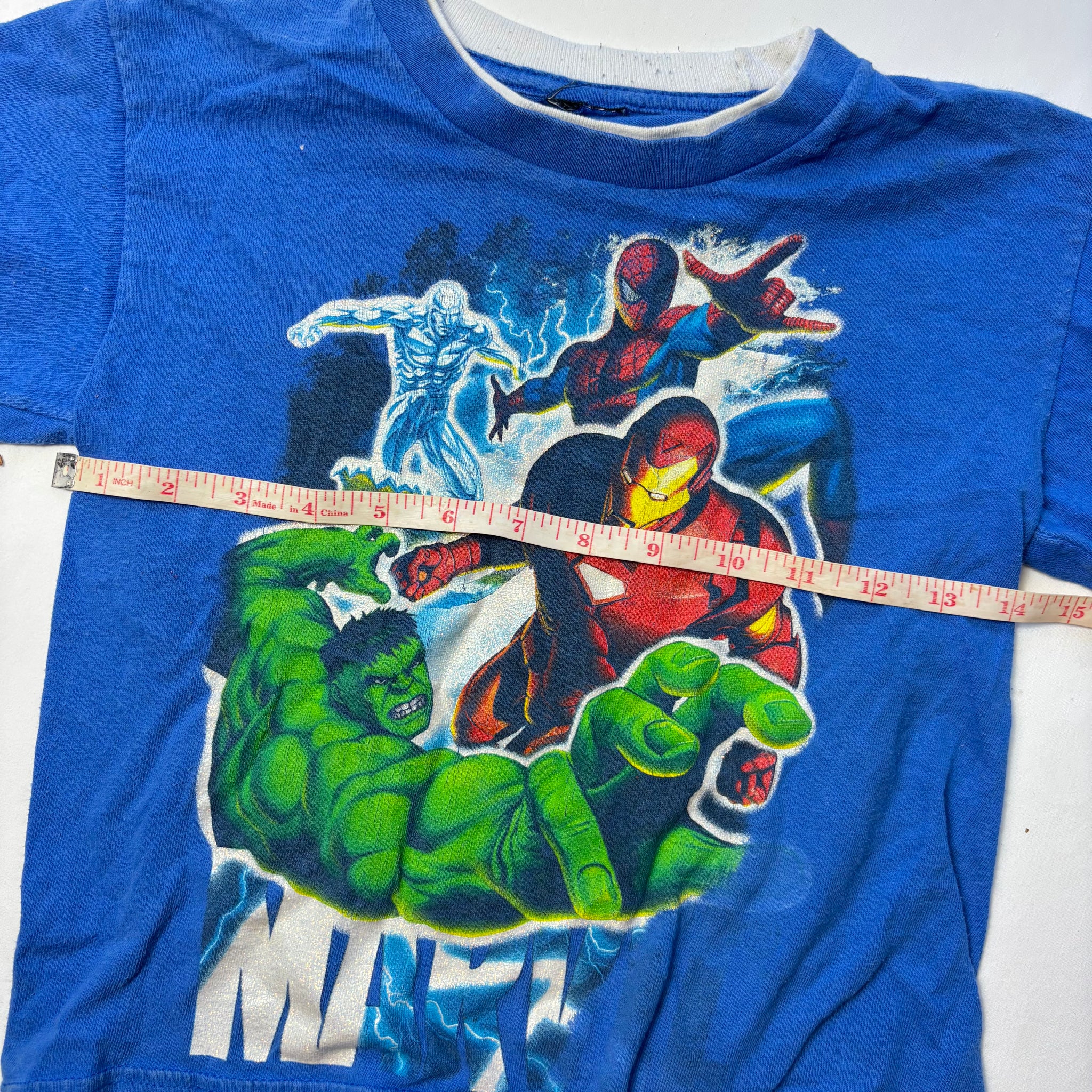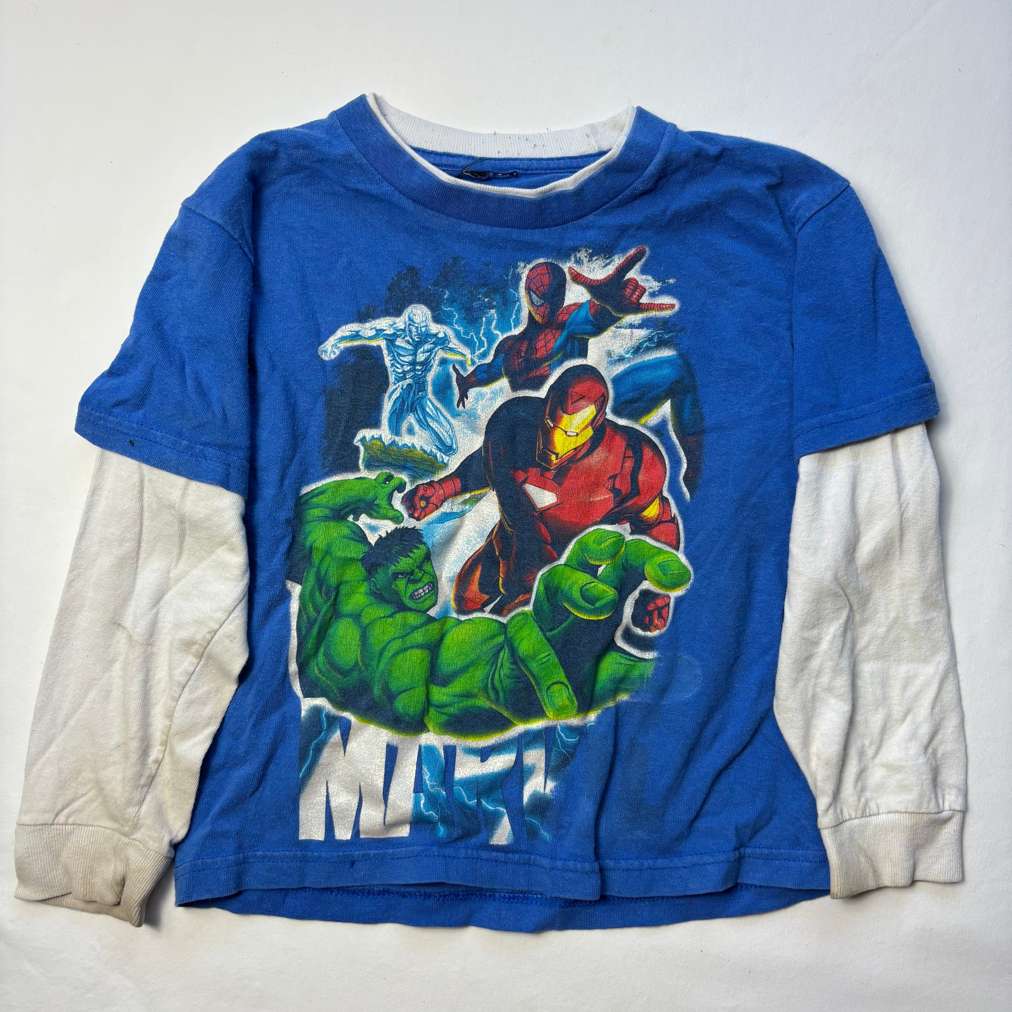 Y2k Marvel superheroes blue and white layered looking long sleeve shirt! Note some spots on backs of forearm area of sleeves shown. Please see all photos for condition and measurements