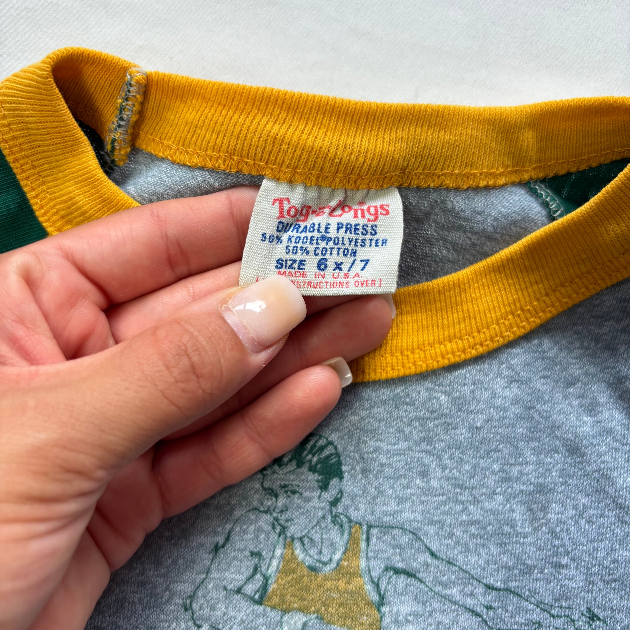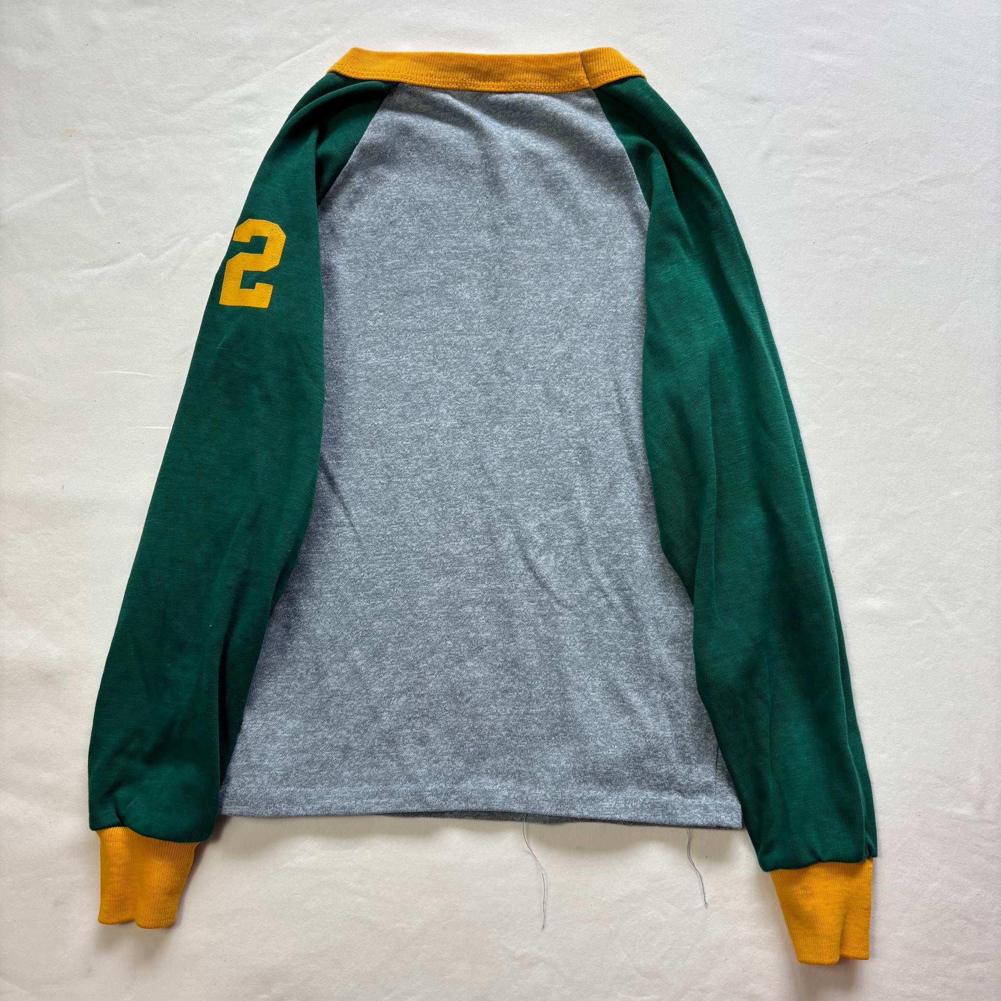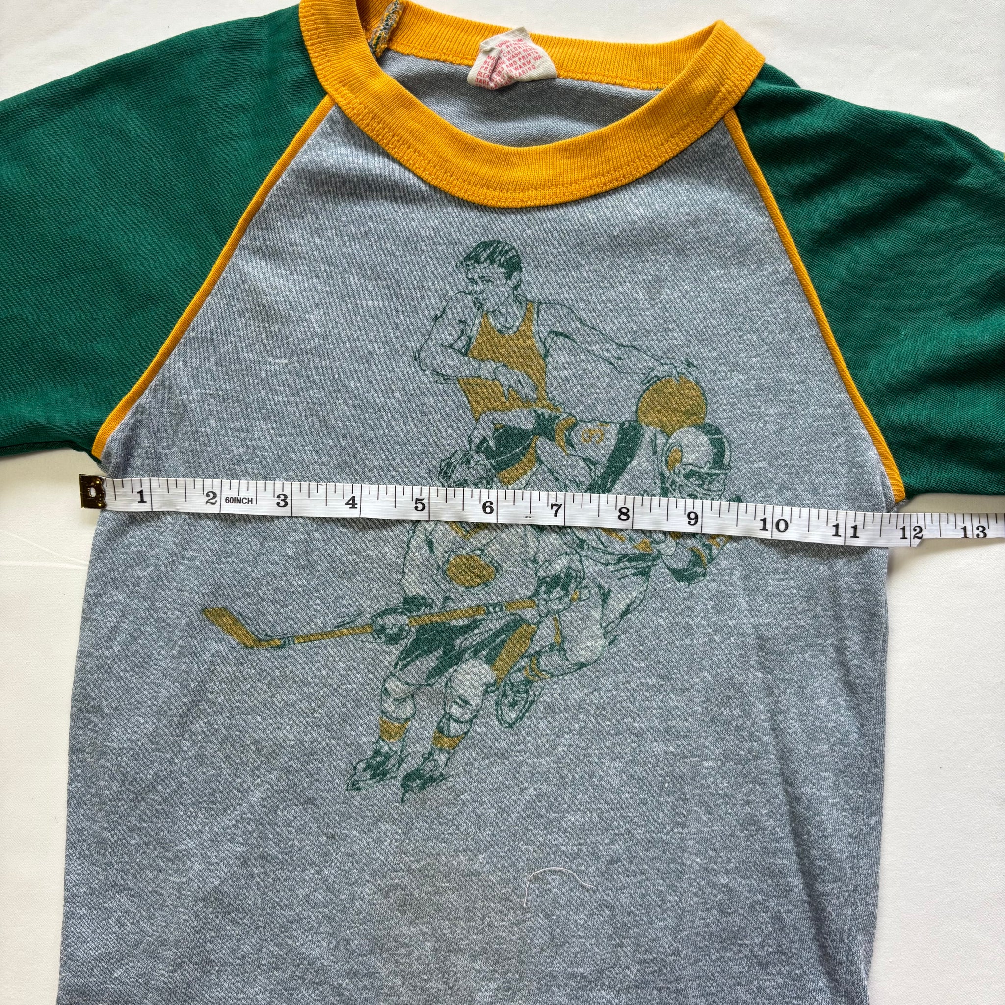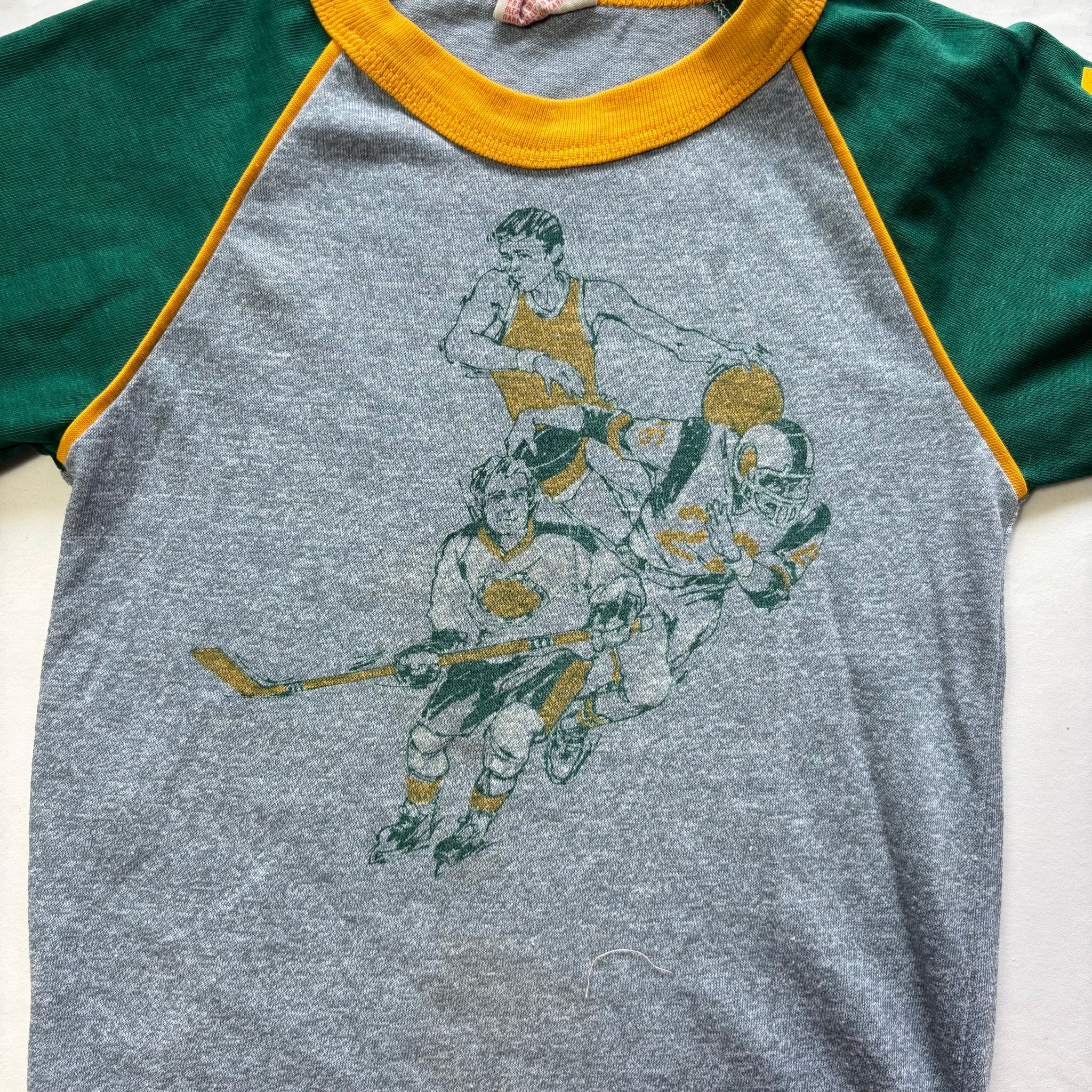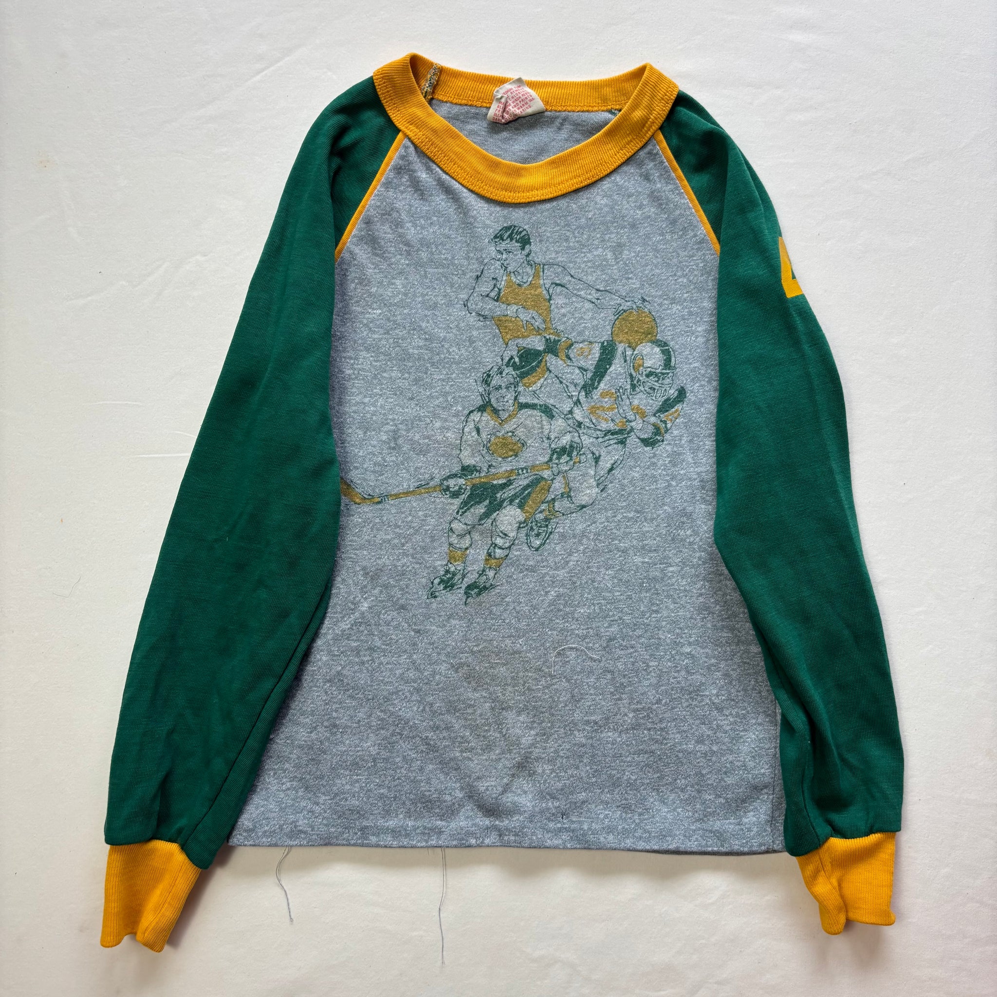 Vintage Tog-a-Longs brand gray, green, and yellow long sleeve shirt with football players on chest! Please see all photos for condition and measurements