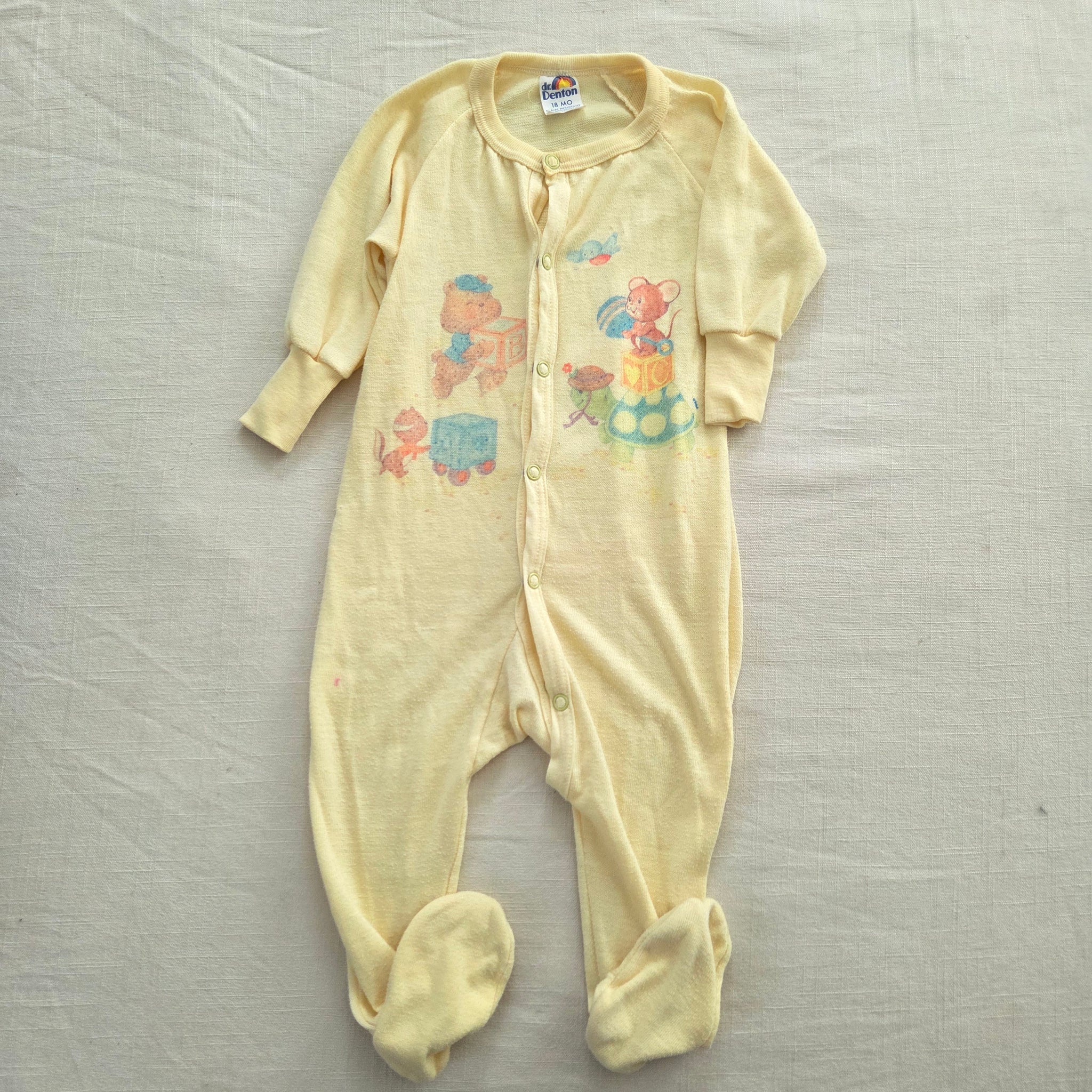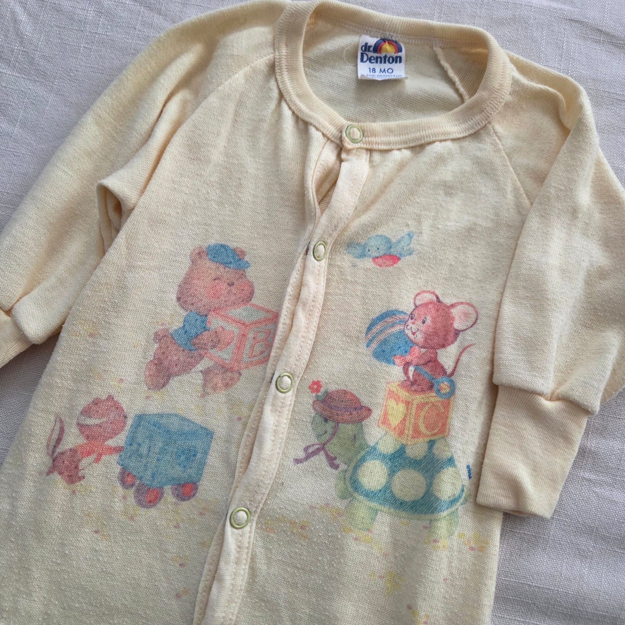 Vintage Dr. Denton brand 70s-80s era yellow footed pajamas with cute animals on chest and belly! Please see all photos for condition and measurements