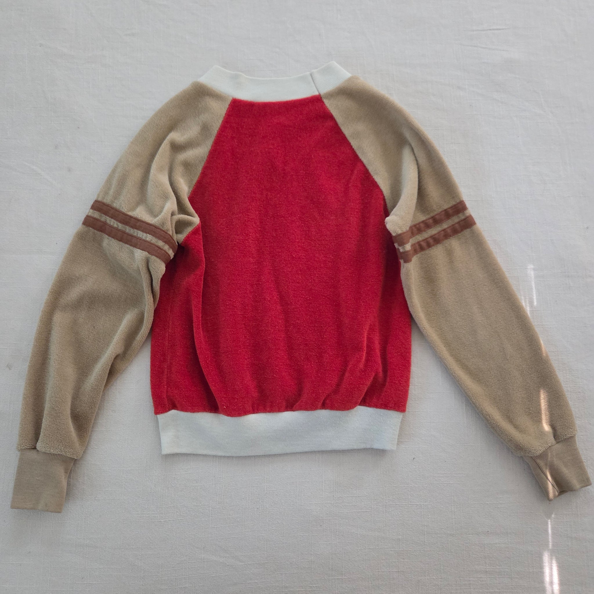 Vintage Tog-a-longs brand tan and red/orange v-neck velour long sleeve shirt! Please see all photos for condition and measurements